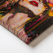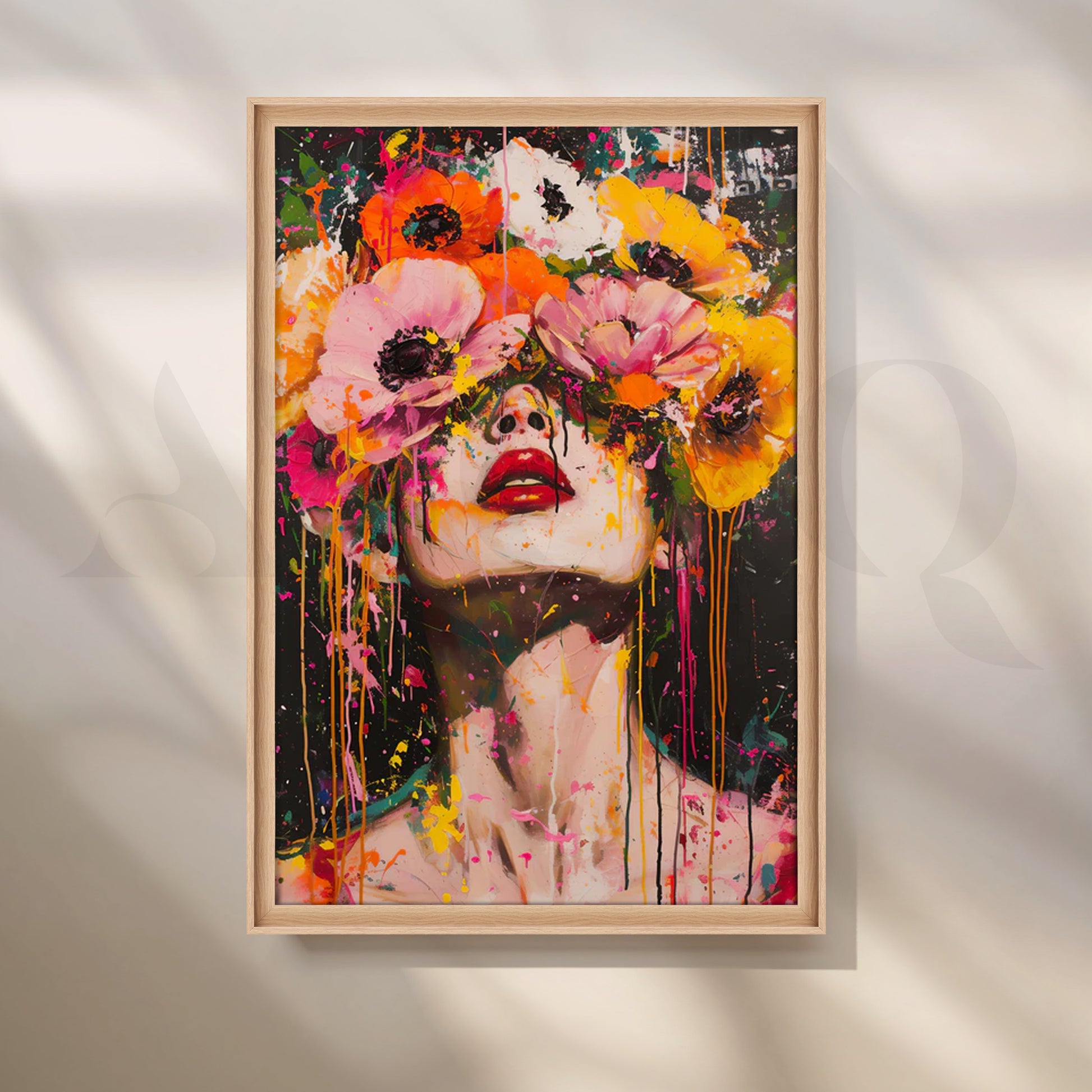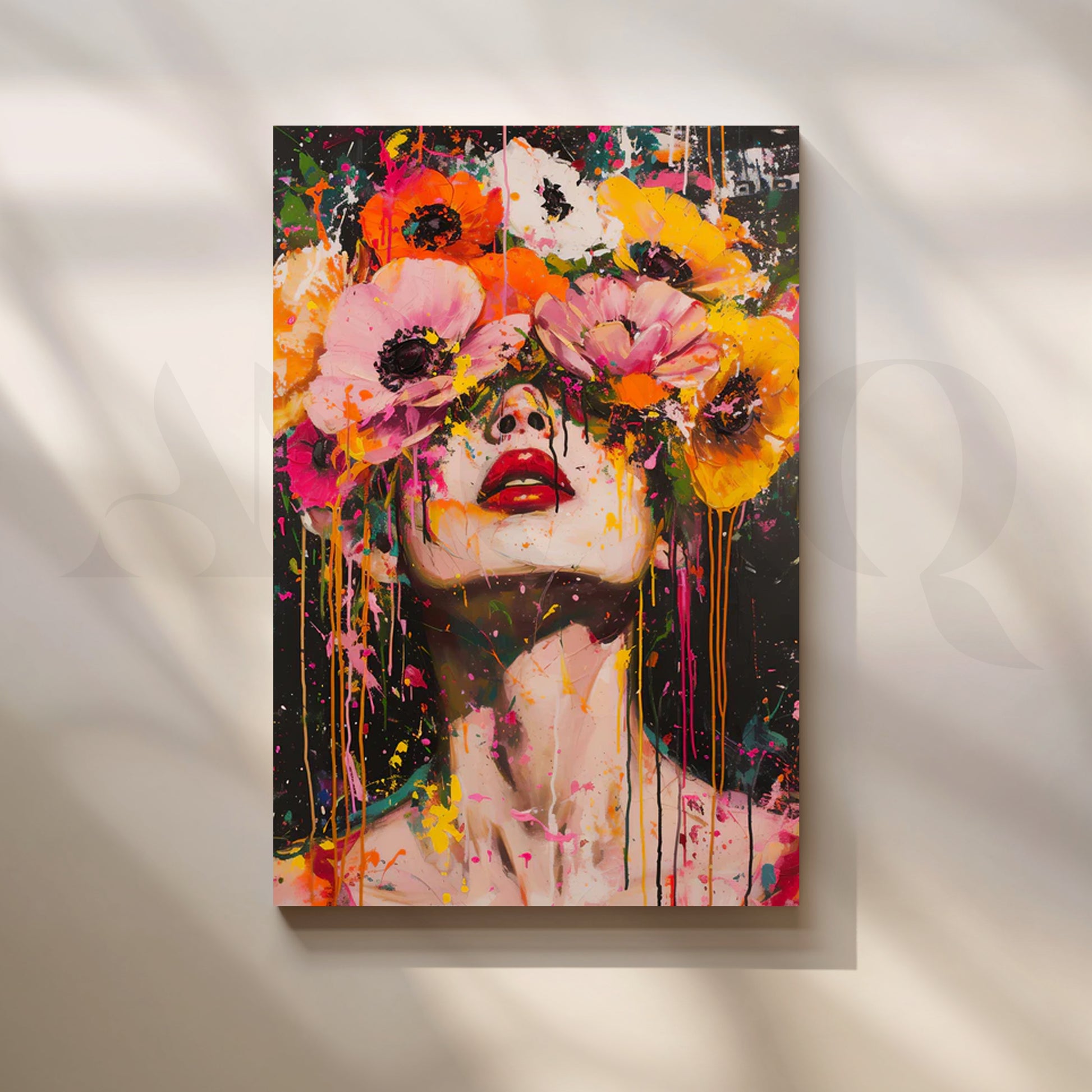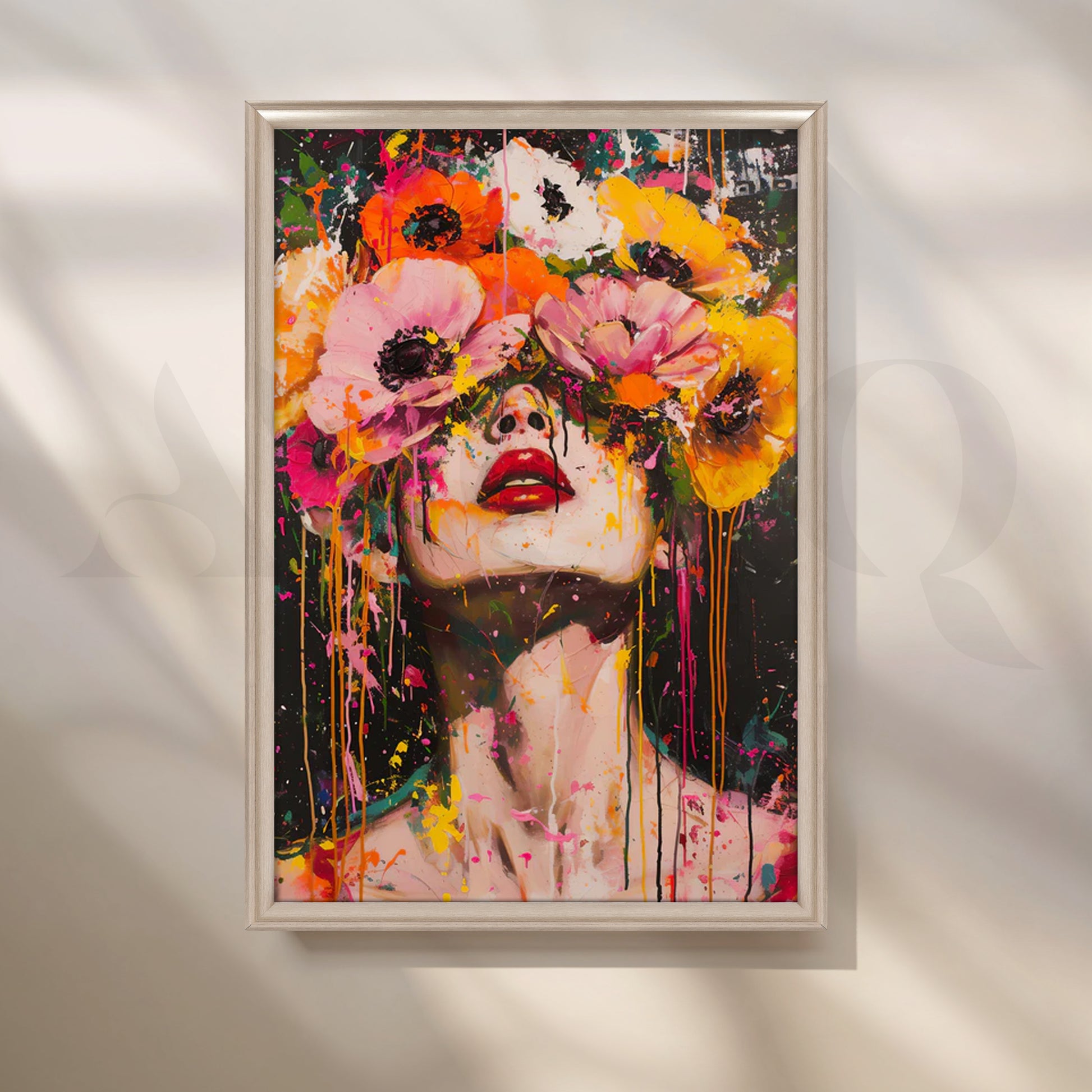 Romantic yet edgy, this floral portrait features vivid anemones cascading over a figure against inky black with painterly drips in neon pinks, oranges, and yellows. The high-contrast palette and expressive texture deliver modern wall art drama while still feeling soft and dreamy—perfect for a statement above-the-bed canvas painting, boutique entryway, or boho bedroom décor.