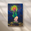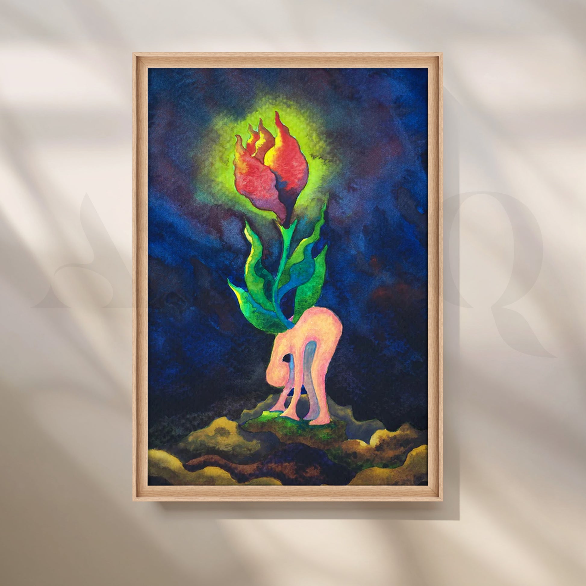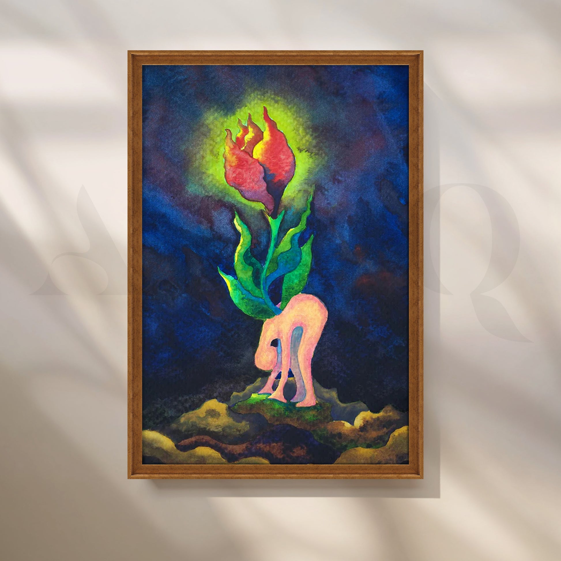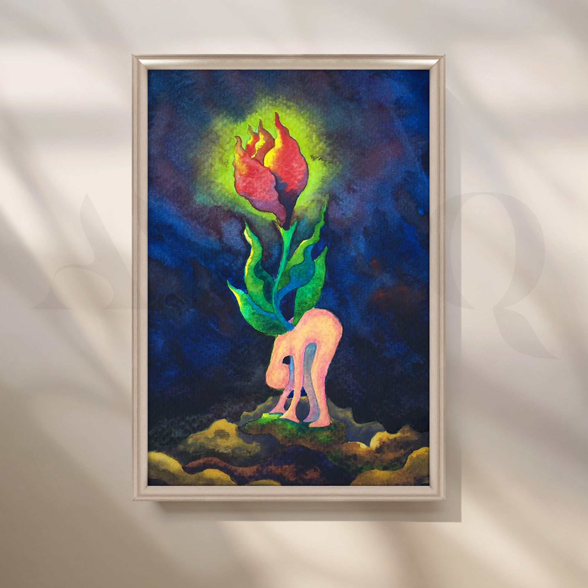 The painting depicts a surreal scene of a figure with a flower growing out of its head. The figure is crouching down, possibly in pain or despair. The flower appears to be growing from the figure's head, perhaps symbolizing hope or regeneration. The style of the painting is abstract and dreamlike. The mood of the painting is contemplative and thought-provoking. It evokes feelings of vulnerability, hope, and transformation