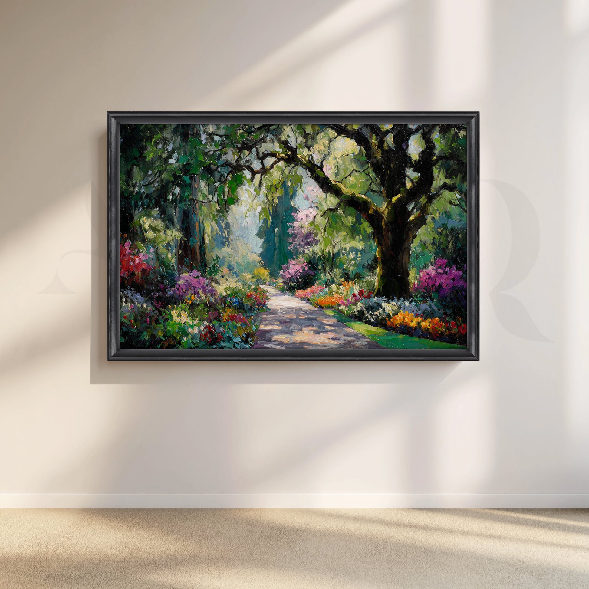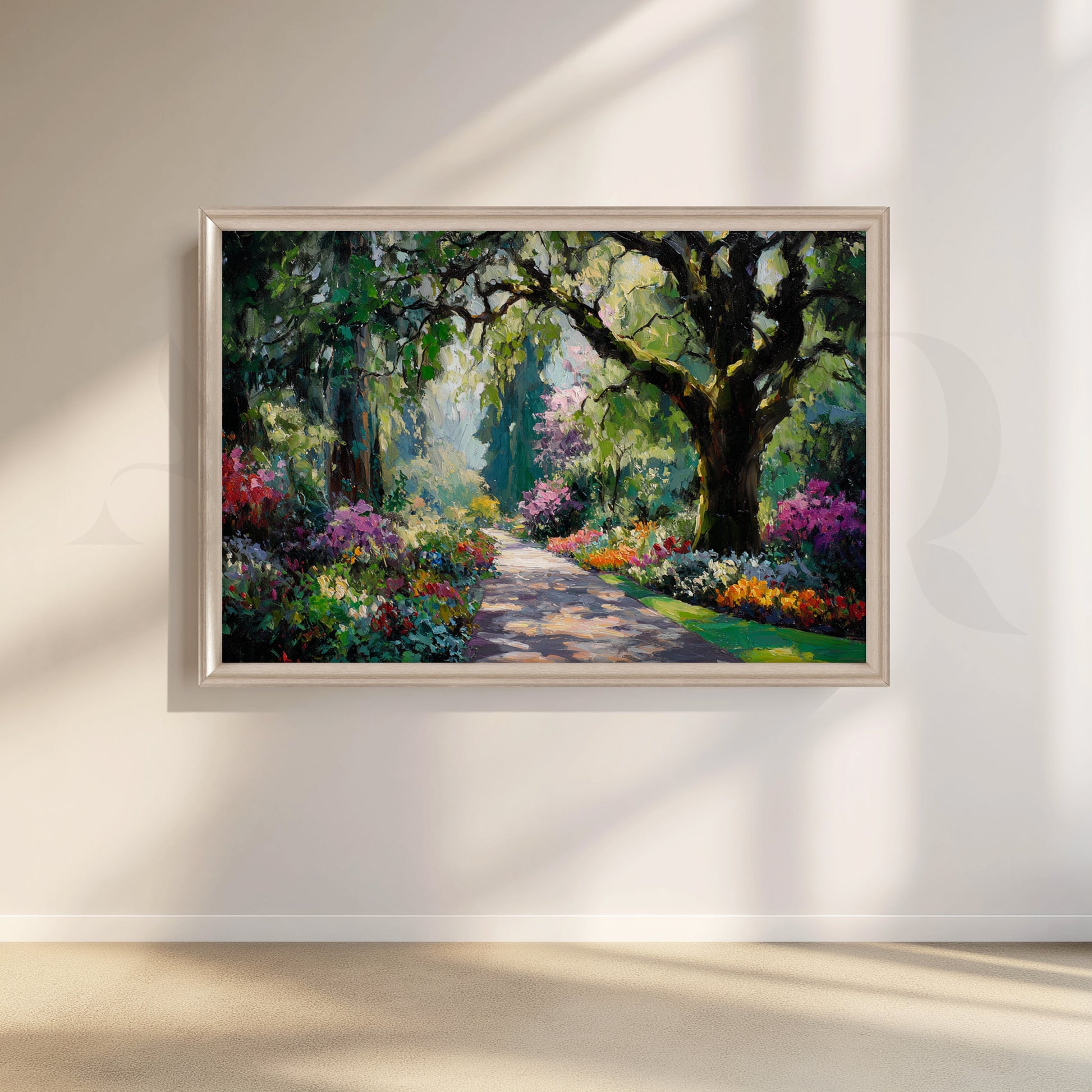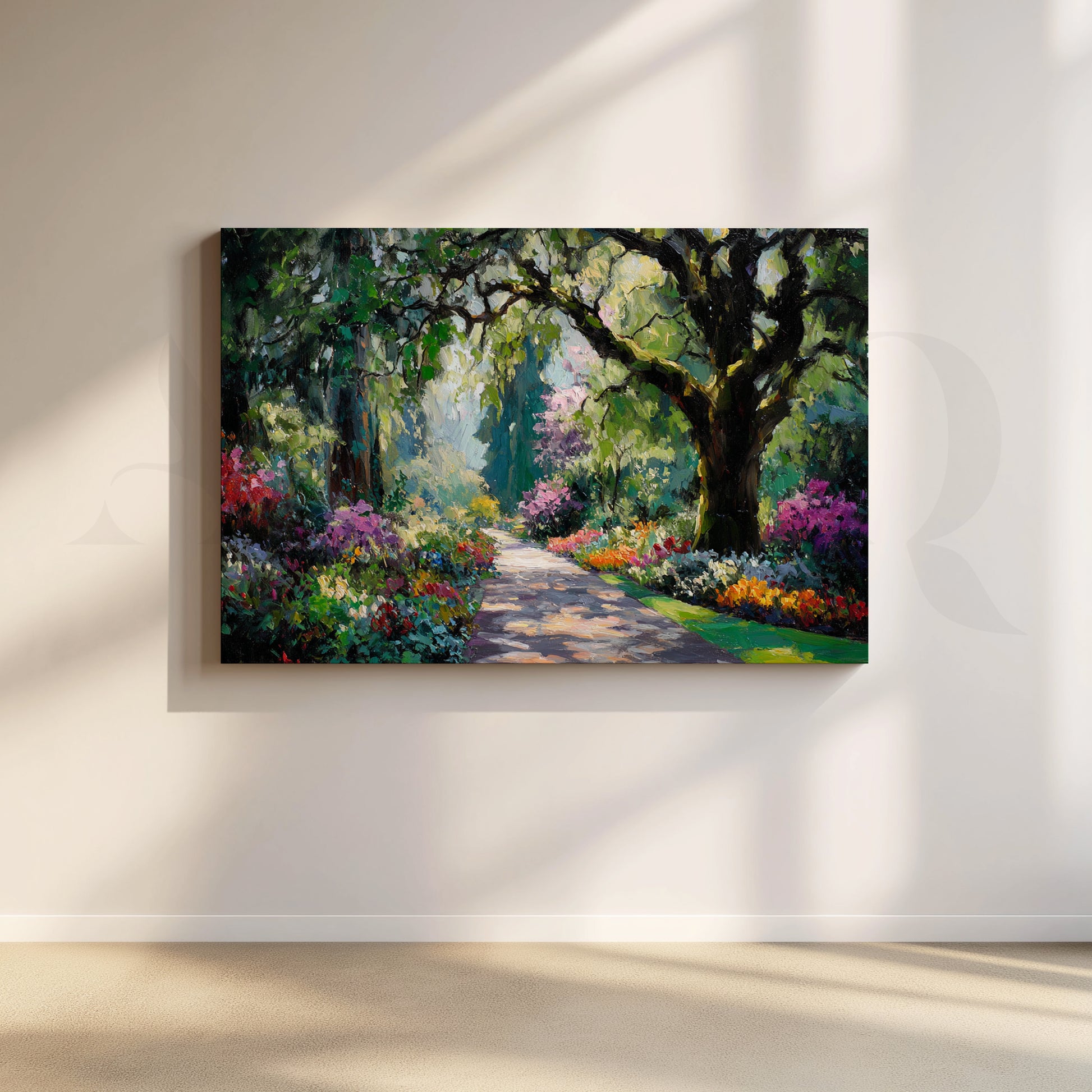 Brighten your walls with Floral Garden Pathway Canvas Artwork, showcasing a lush garden bursting with colorful flowers and sunlight filtering through trees. Ideal for living rooms, hallways, or bedrooms, this nature-inspired canvas adds vibrancy and peace to any space.