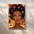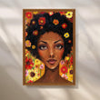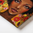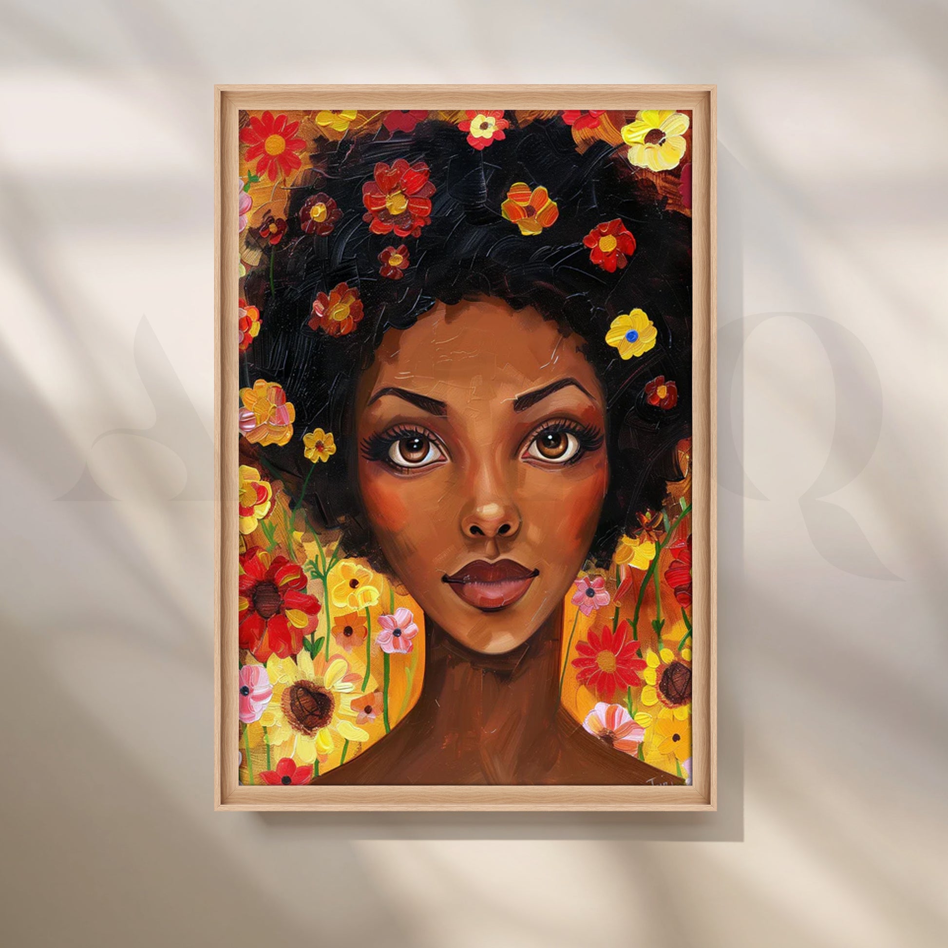 Bright and feminine, “Bloom & Glow” is a modern wall art portrait featuring a radiant woman framed by whimsical florals. Warm honey, coral, and sunflower tones pop against rich brunette curls, creating a romantic, uplifting mood. This contemporary canvas painting brings color to a bedroom, vanity corner, or boho décor scheme. Hang as large living room art or pair with gallery wall pieces for chic, modern home décor that feels fresh, playful, and elegant.