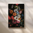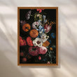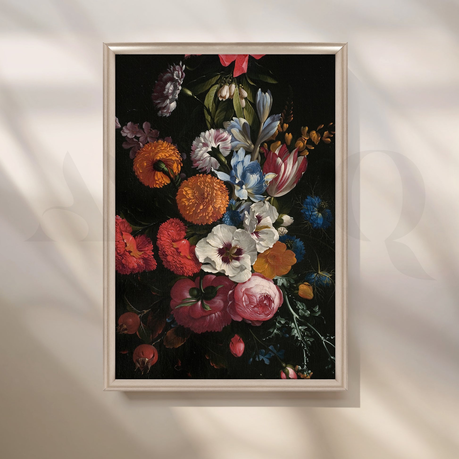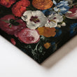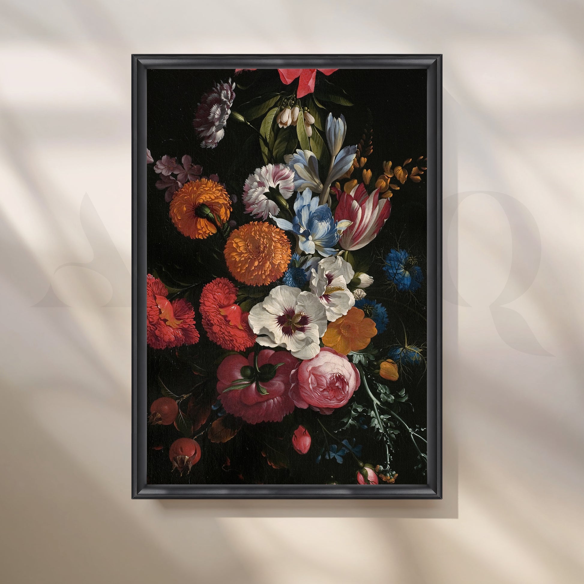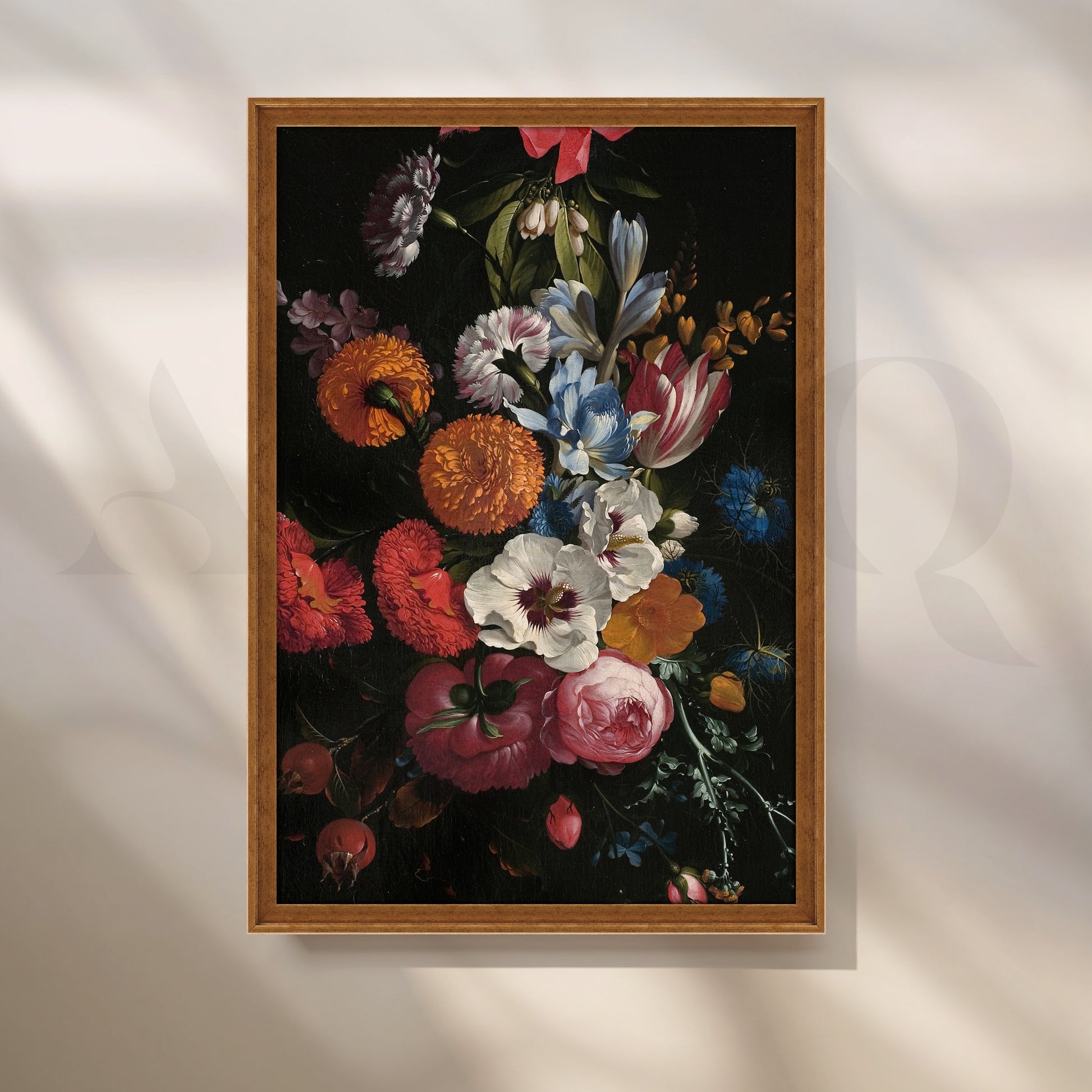 A breathtaking Anciq floral still-life bursting with rich hues against a deep black background—symbolizing timeless beauty. Ideal for bedrooms or hallways with modern classic interiors. Keywords: dark floral painting, vintage flower wall art, classic bloom canvas, European art print, luxury bedroom decor.