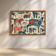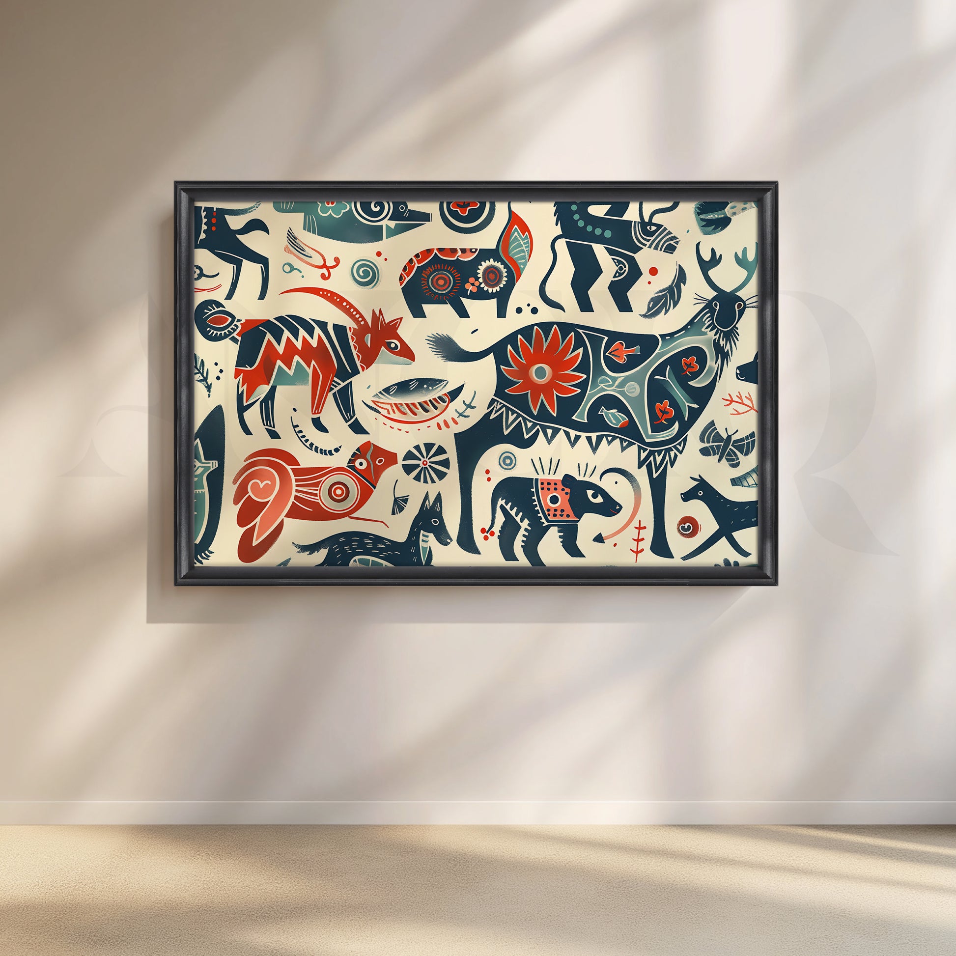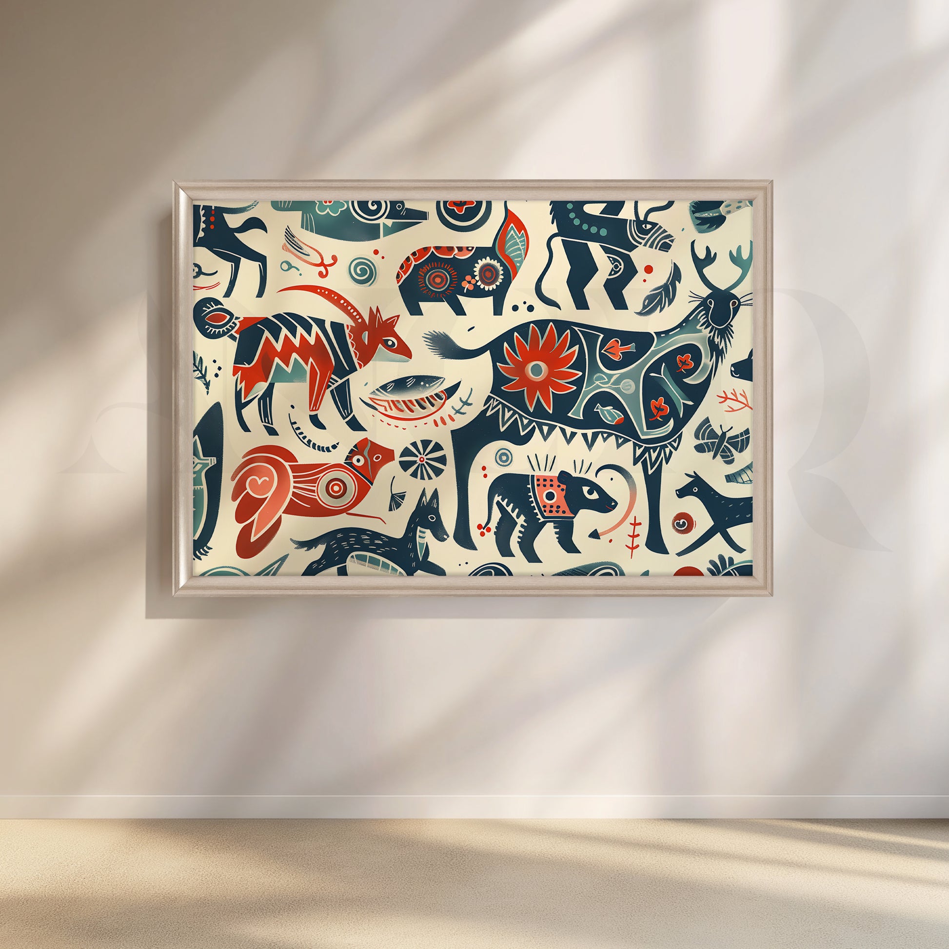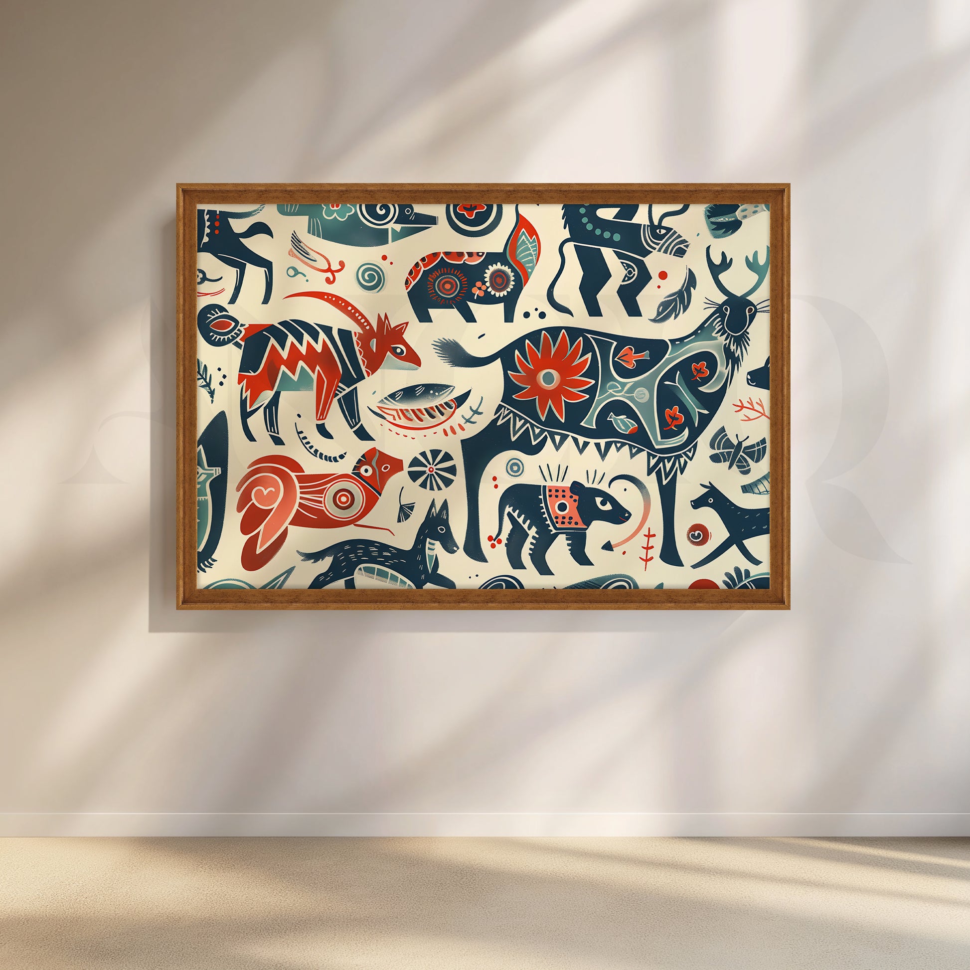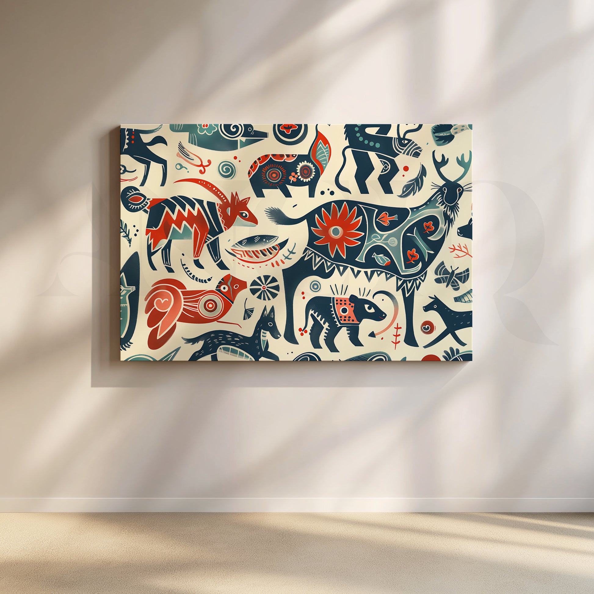 A mesmerizing Anciq artwork showcasing stylized animals in folk motifs with bold hues of teal, coral, and cream—symbolizing coexistence in nature. Ideal for living rooms or nature-inspired interiors. Keywords: tribal animal art, jungle wall decor, folk wildlife painting, modern ethnic artwork, boho nature canvas.