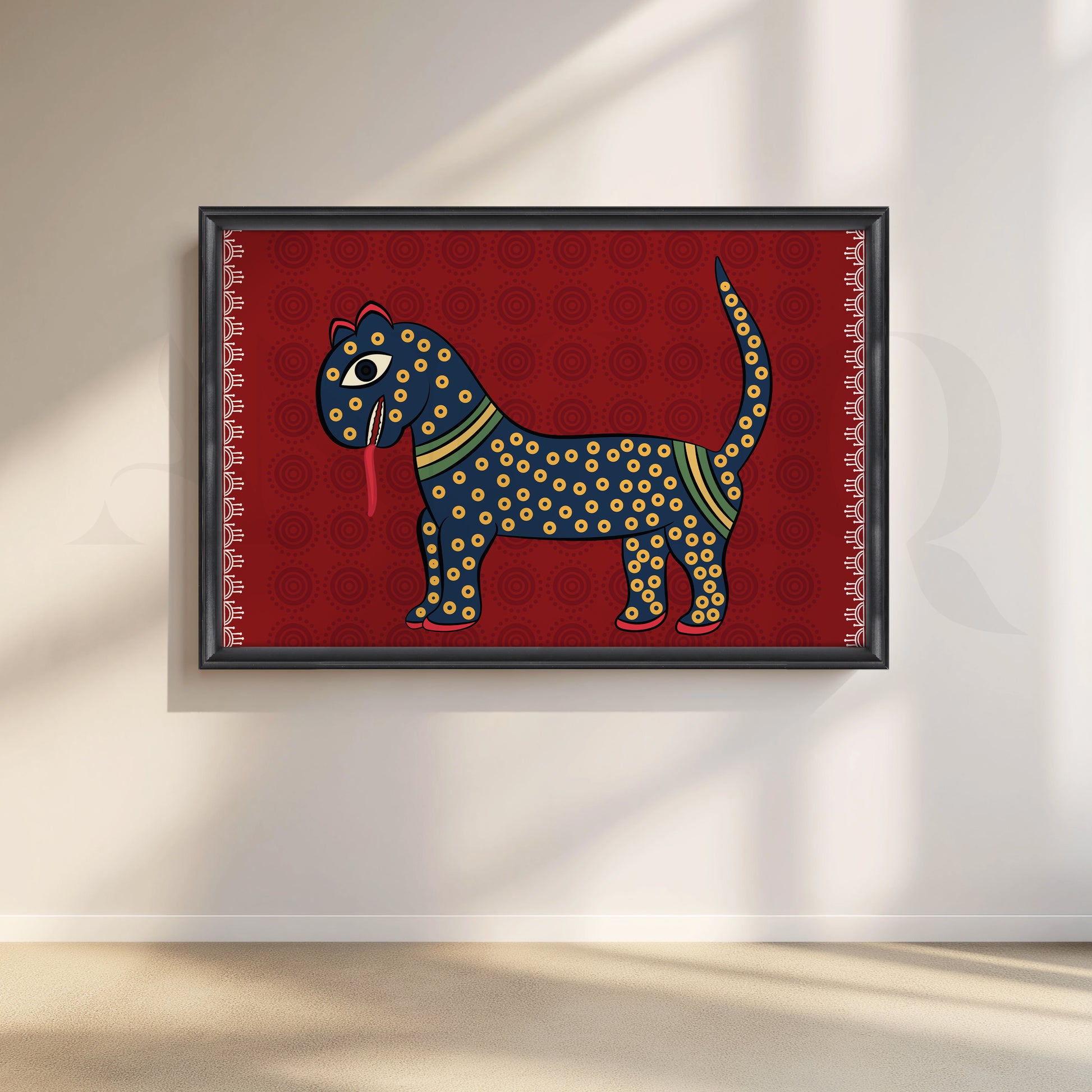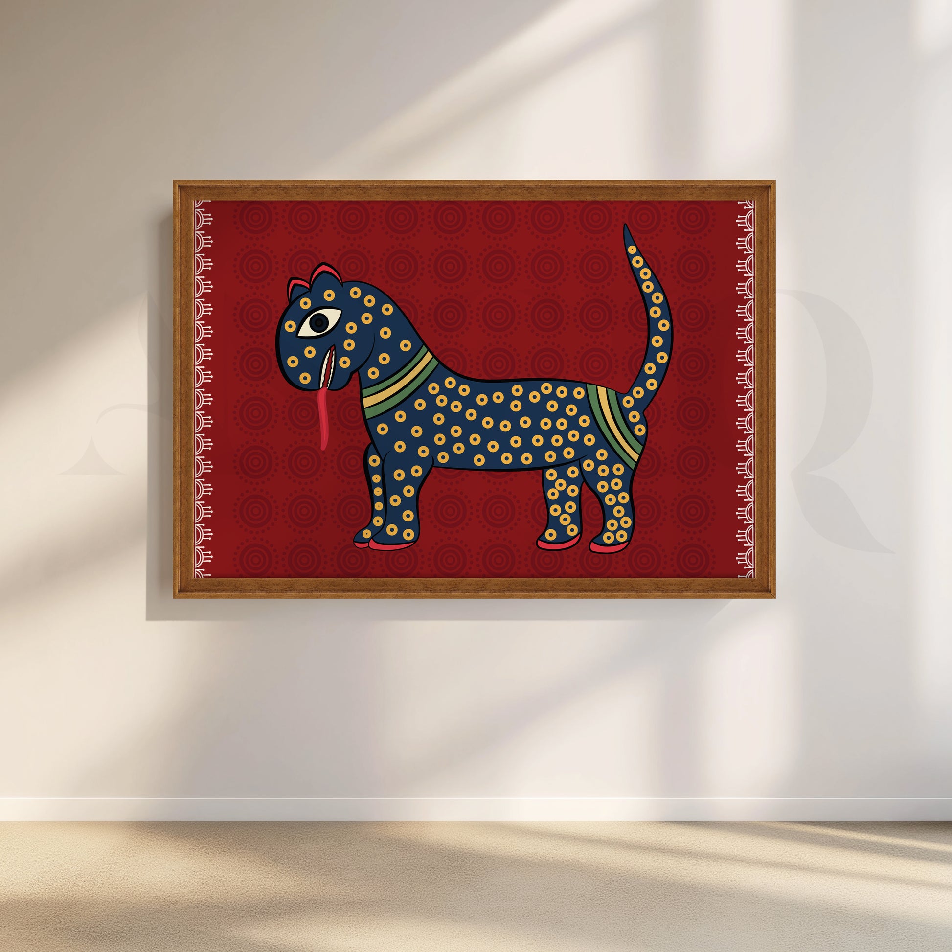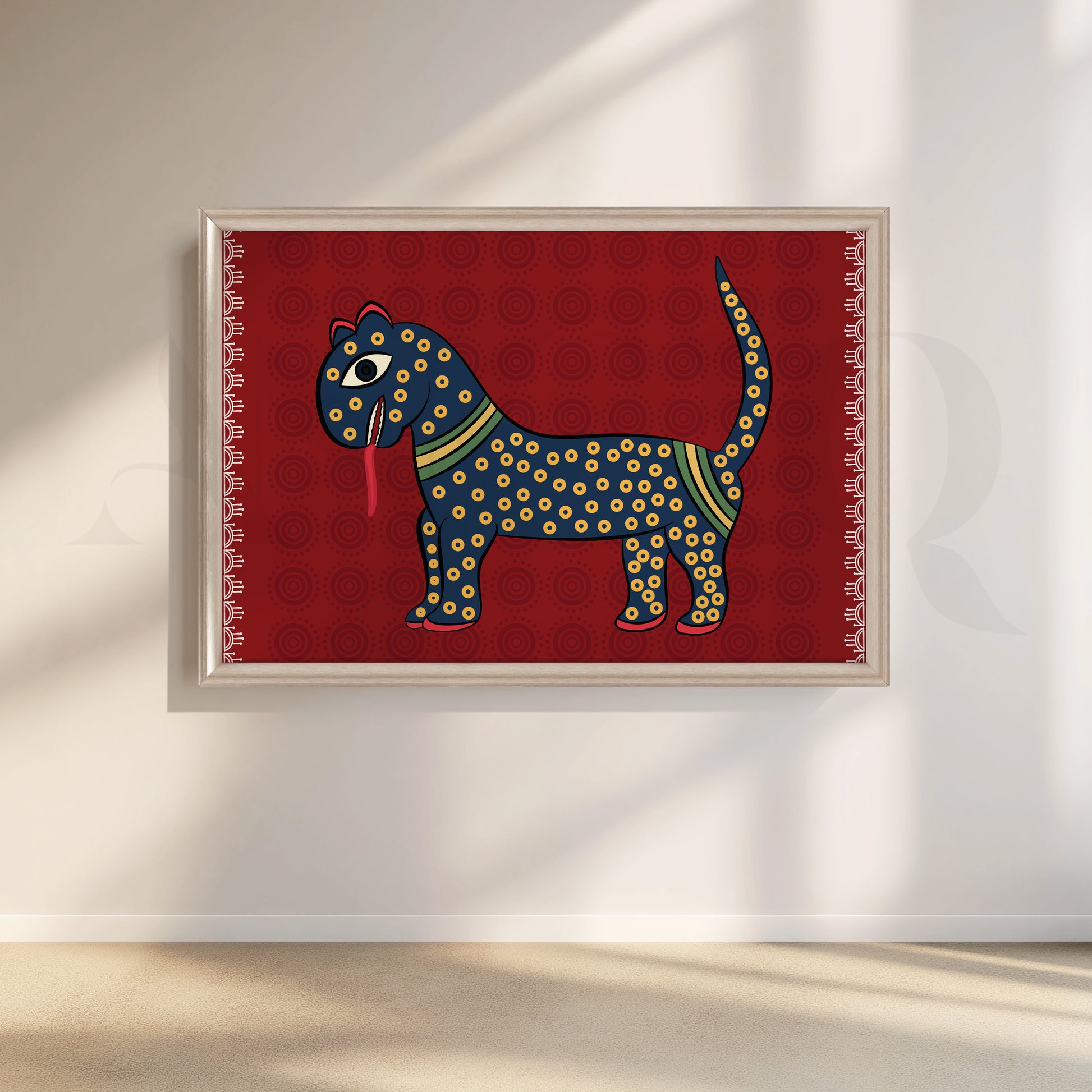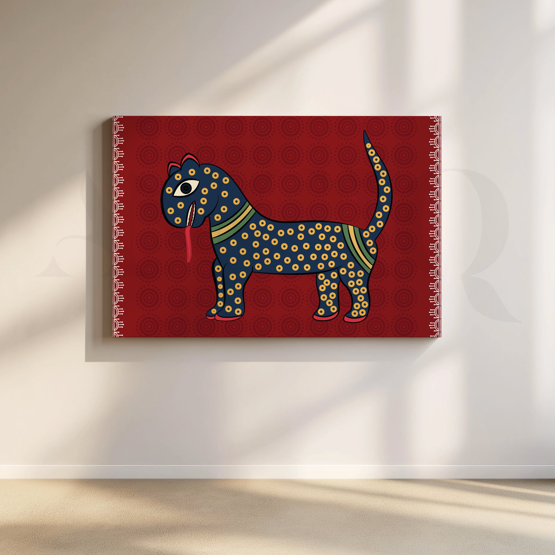 This striking red Anciq artwork showcases a stylized folk leopard in bold hues of navy and yellow, inspired by traditional tribal motifs. A vibrant choice for study rooms or creative workspaces. Keywords: animal wall art, tribal leopard painting, folk art canvas, red wall decor, ethnic modern artwork.