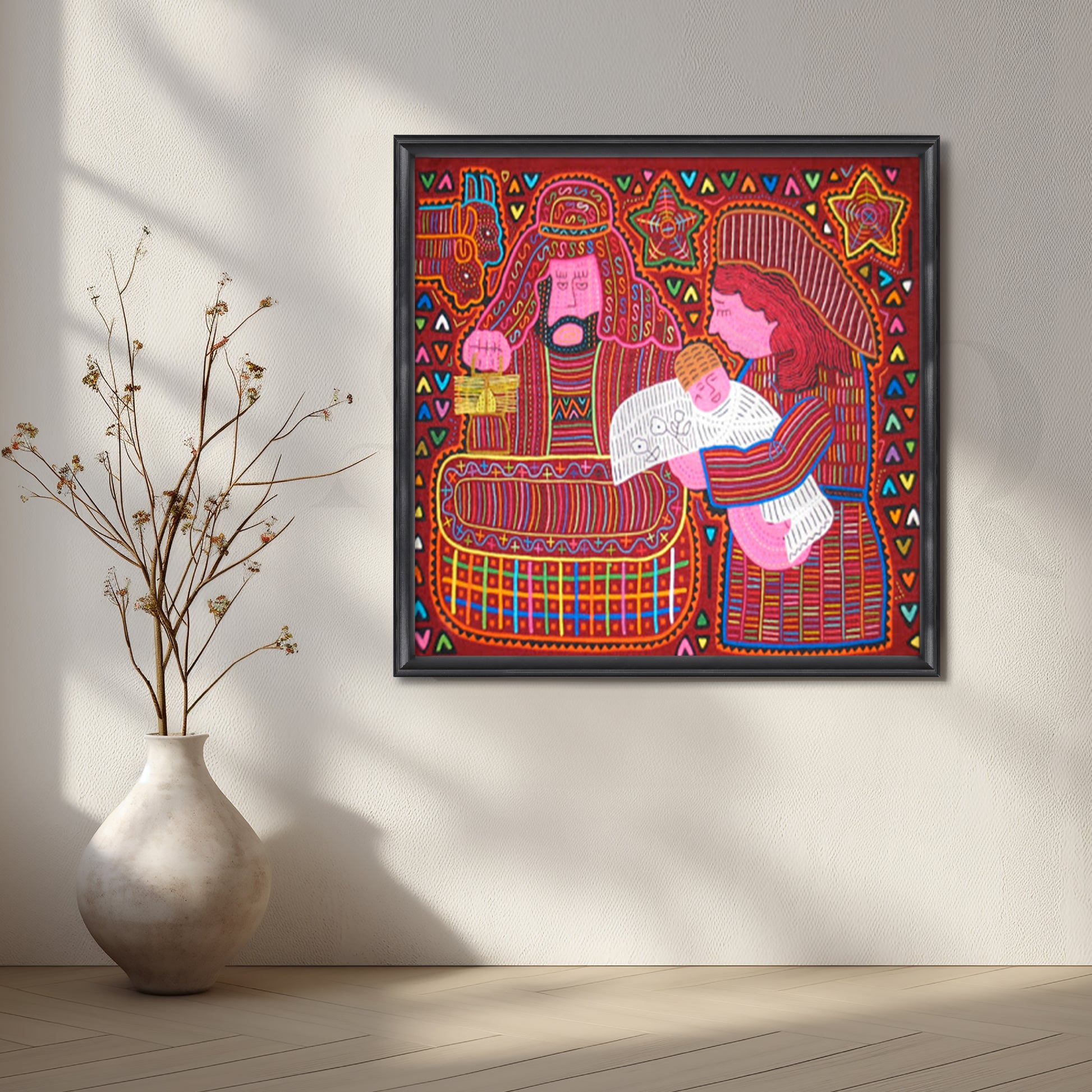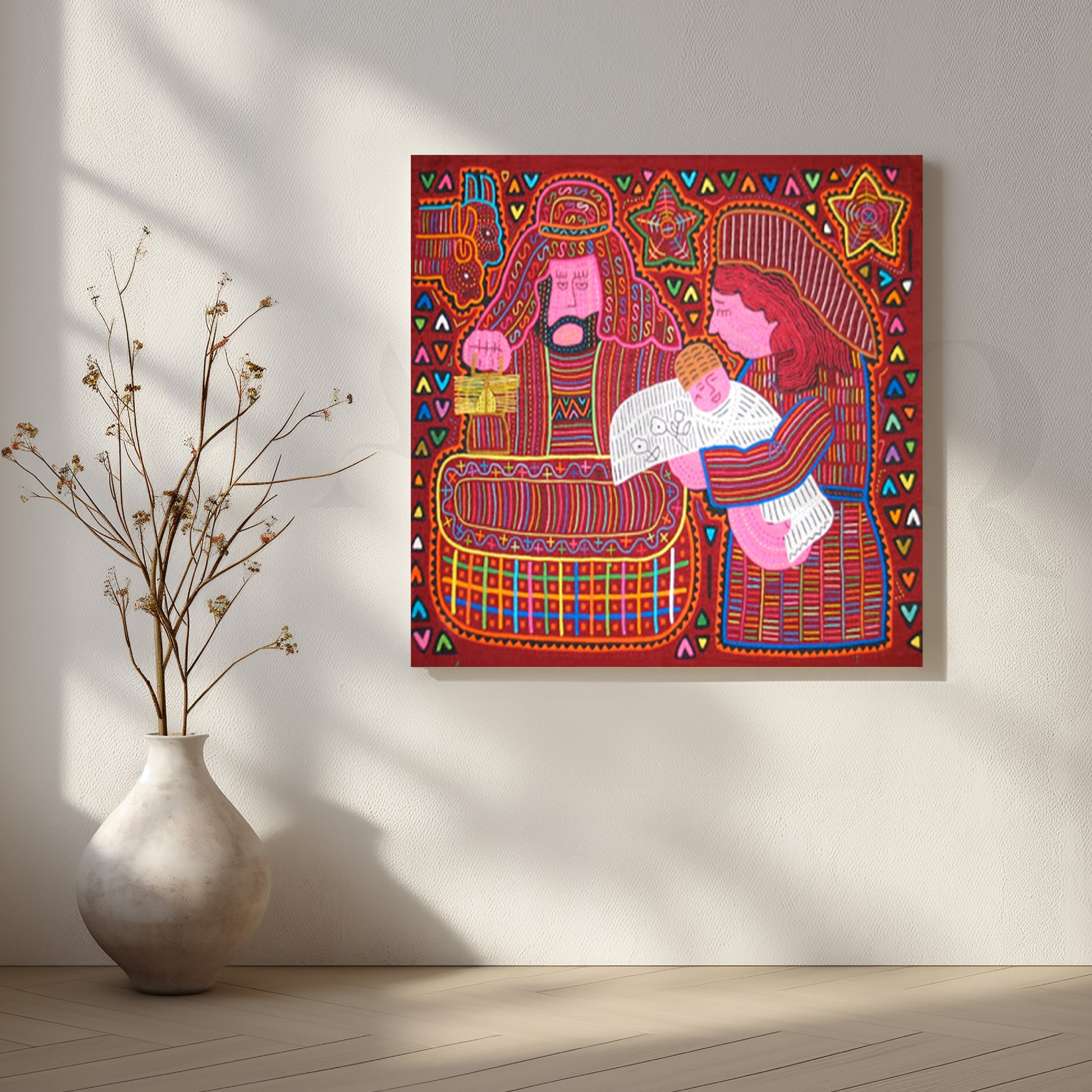 This vibrant folk-style nativity canvas artwork features the holy family in rich reds, pinks, and decorative patterns. Perfect as Christmas wall art, it brings warmth, tradition, and storytelling into your living room, hallway, or prayer corner. Ideal for homes, cafés, and studios looking for festive Christian décor with a handcrafted, ethnic charm.