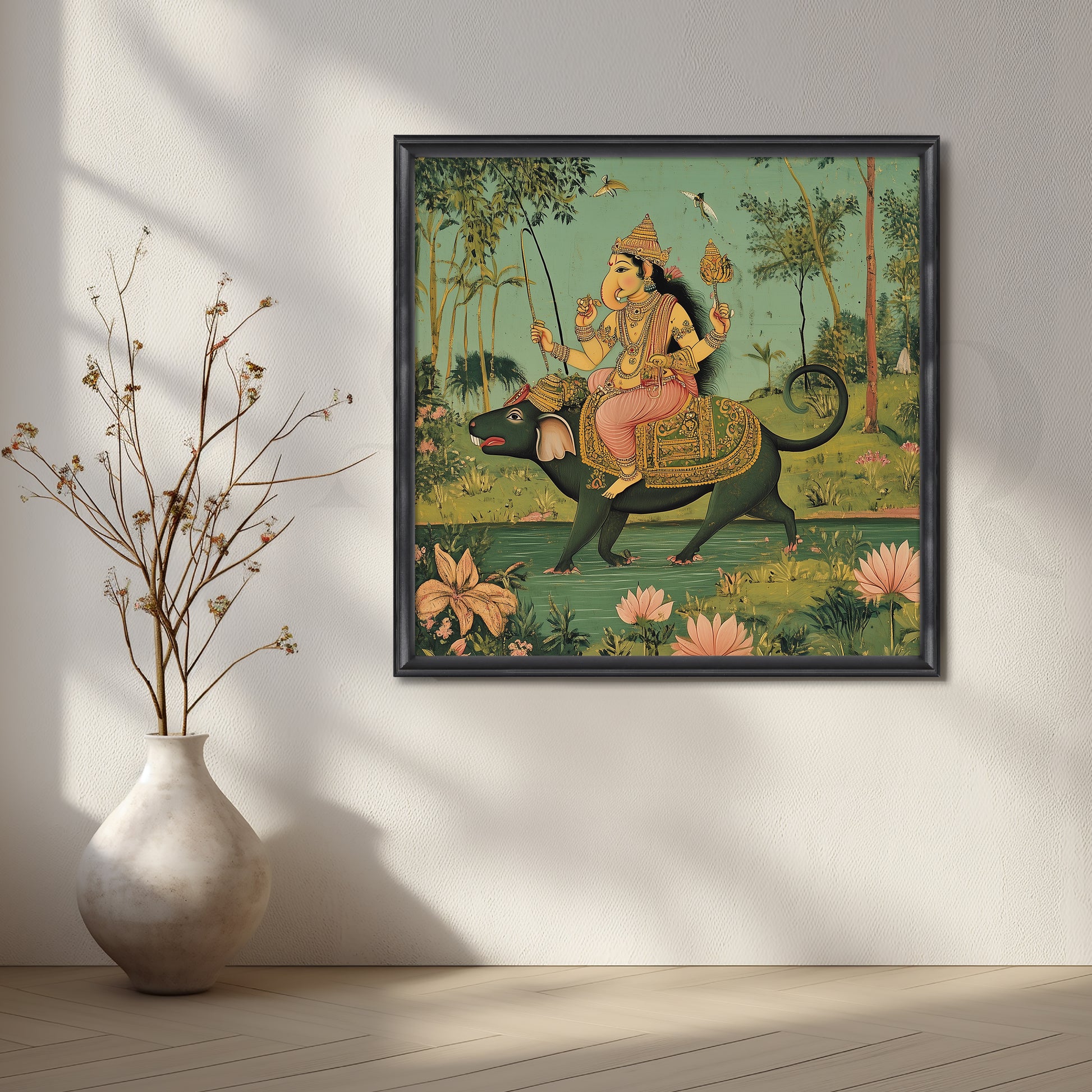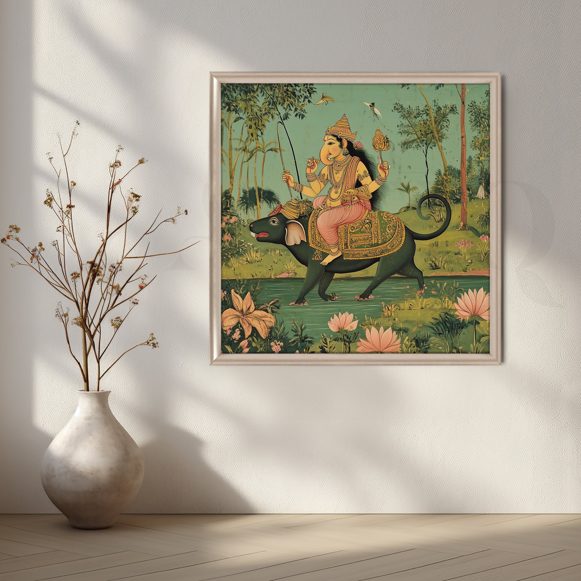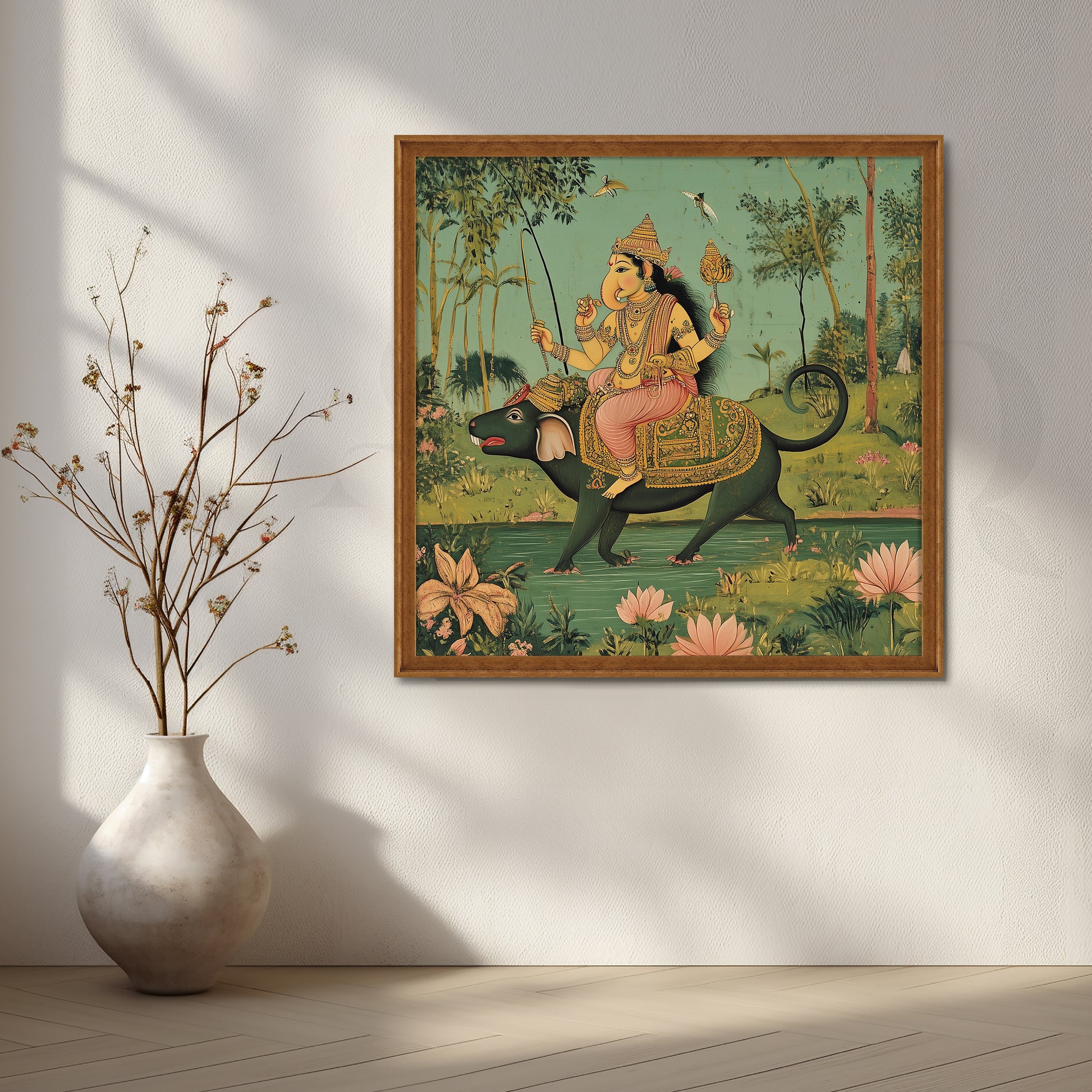 Forest Ganesha on Vahana Canvas Artwork for Puja Room & Meditation Space Wall Decor