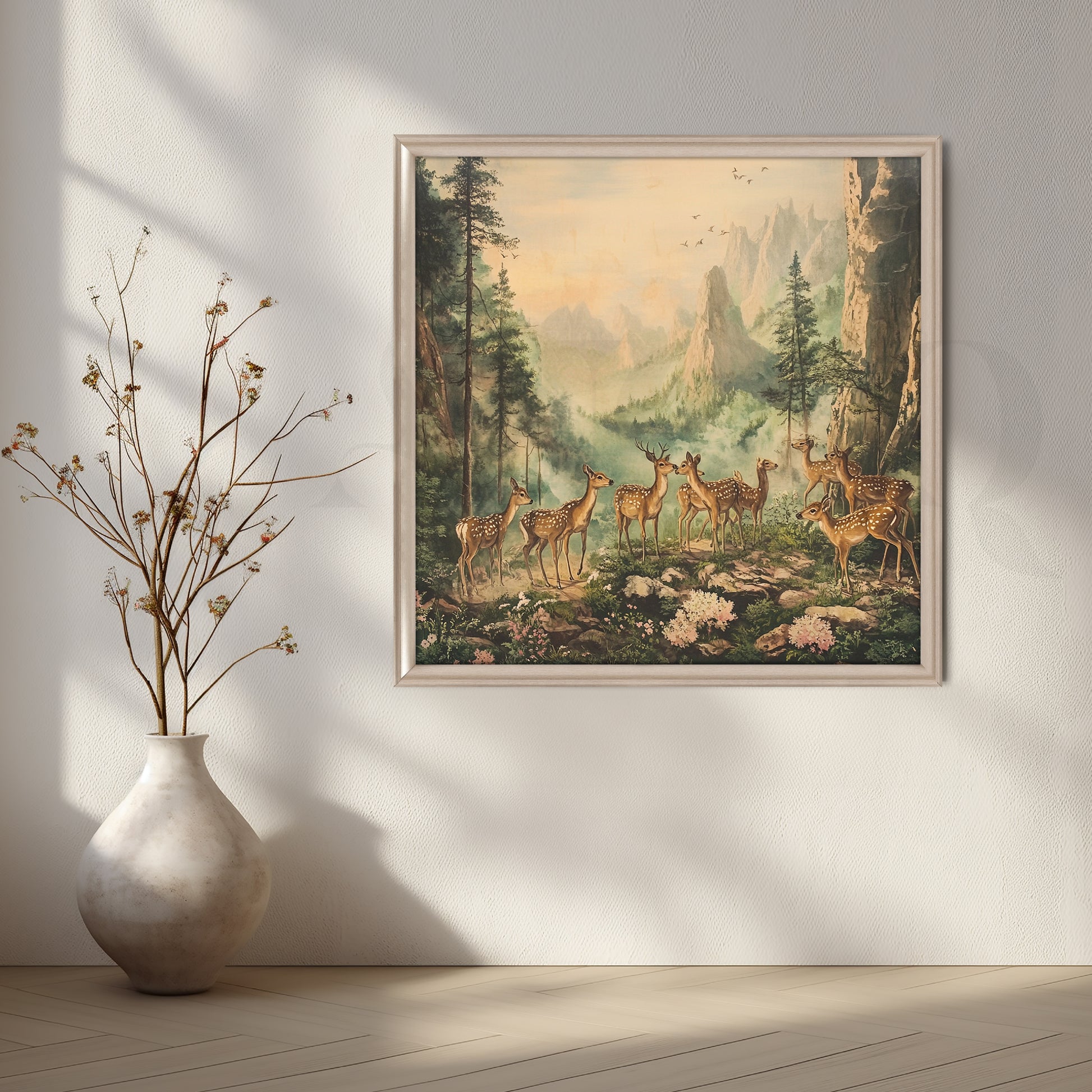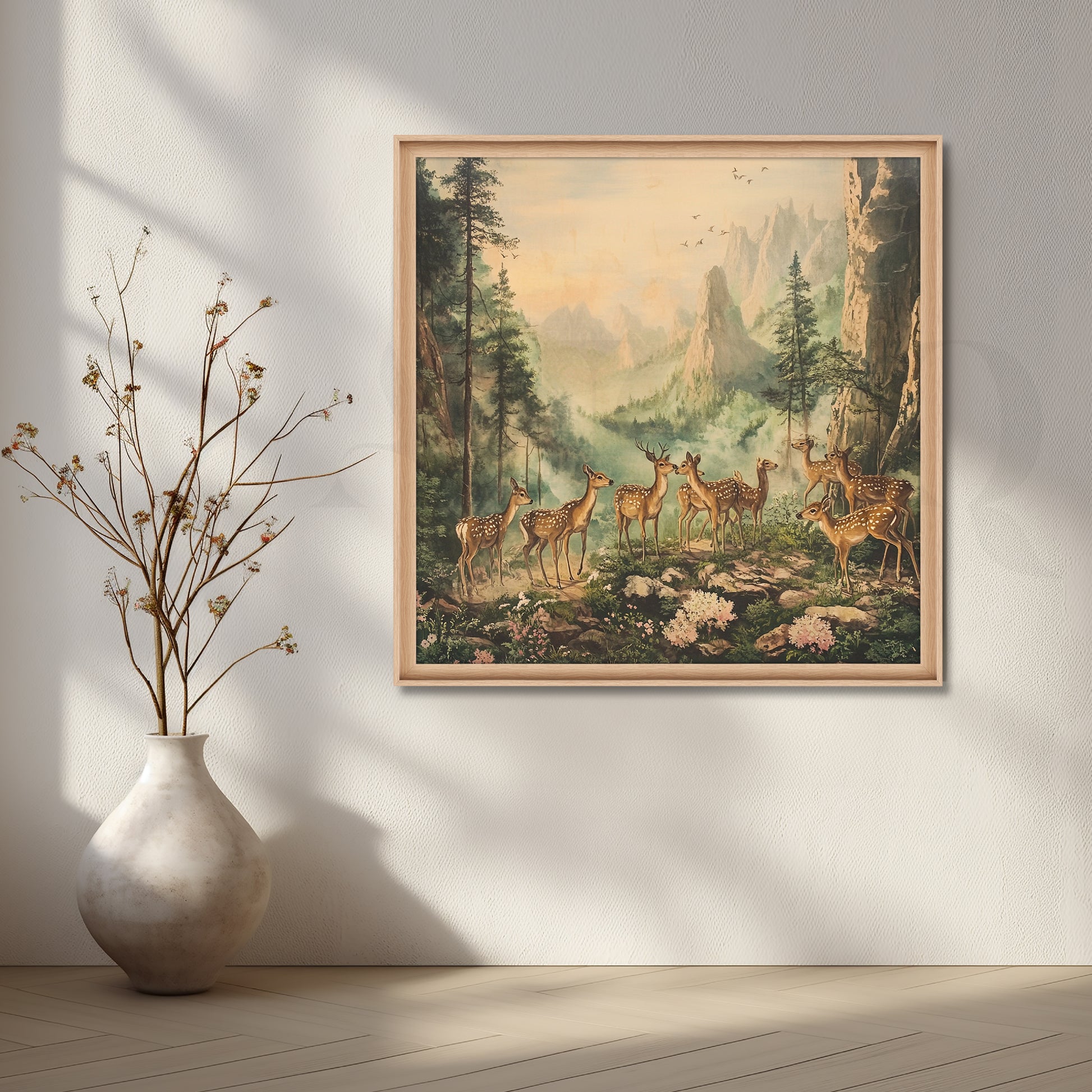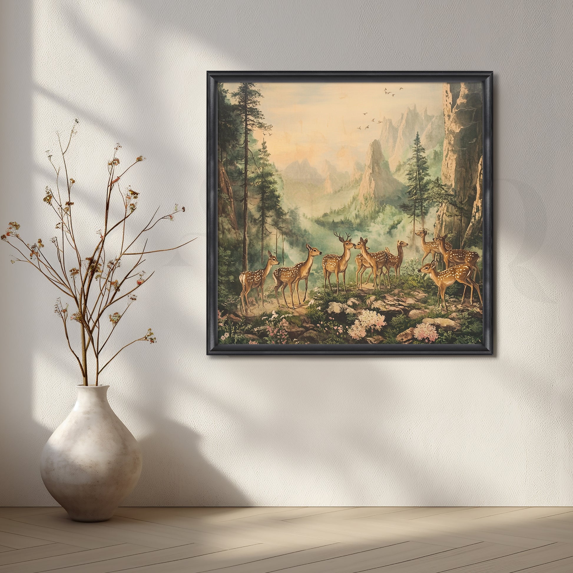 Bring forest serenity into your home with this scenic canvas artwork featuring a graceful group of deer amidst a misty pine-covered valley. The natural tones and mountain backdrop make it ideal for bedrooms, study rooms, or nature-themed interiors. Perfect for lovers of wildlife and peaceful landscapes, this forest deer painting adds calm and a connection to the wild in rustic or minimalist settings.