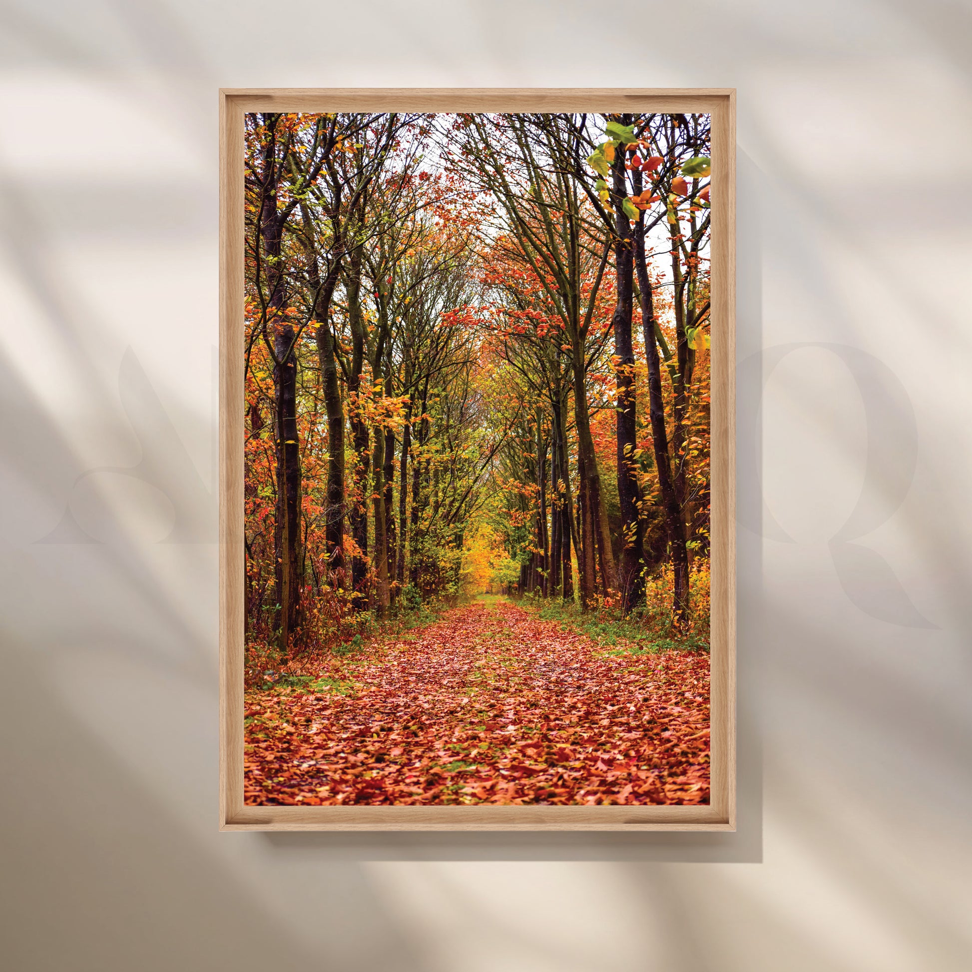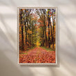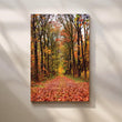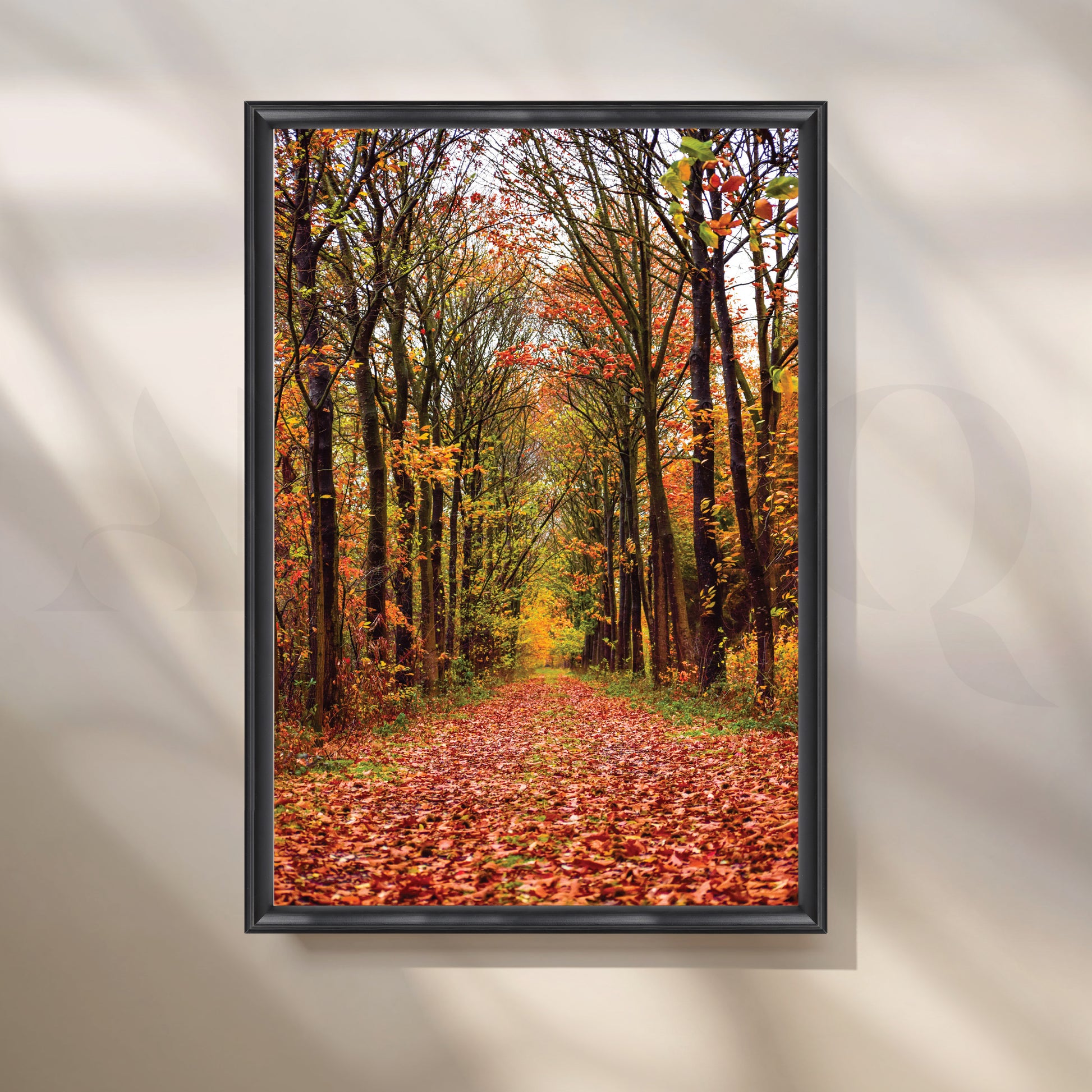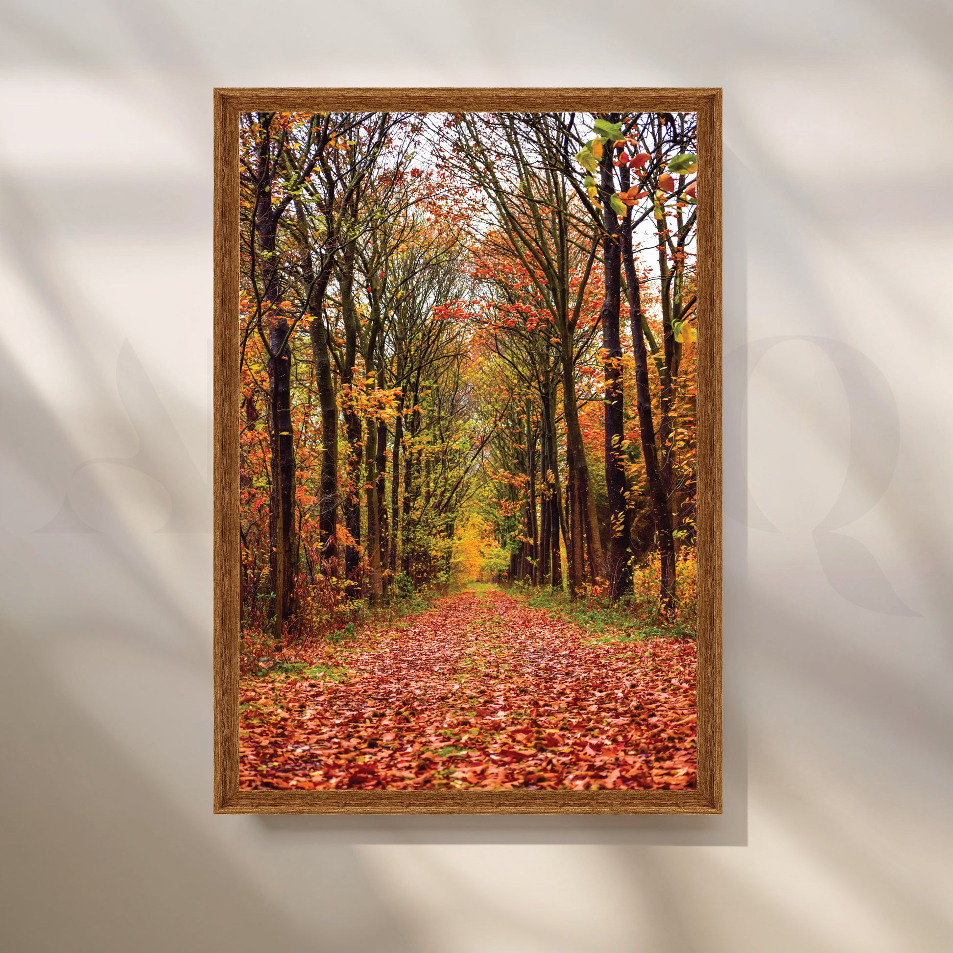 Immerse yourself in a vibrant tapestry of fall. This captivating painting captures a winding path through a forest ablaze with crimson and gold leaves. Perfect for nature lovers and those seeking a touch of autumn's beauty year-round.