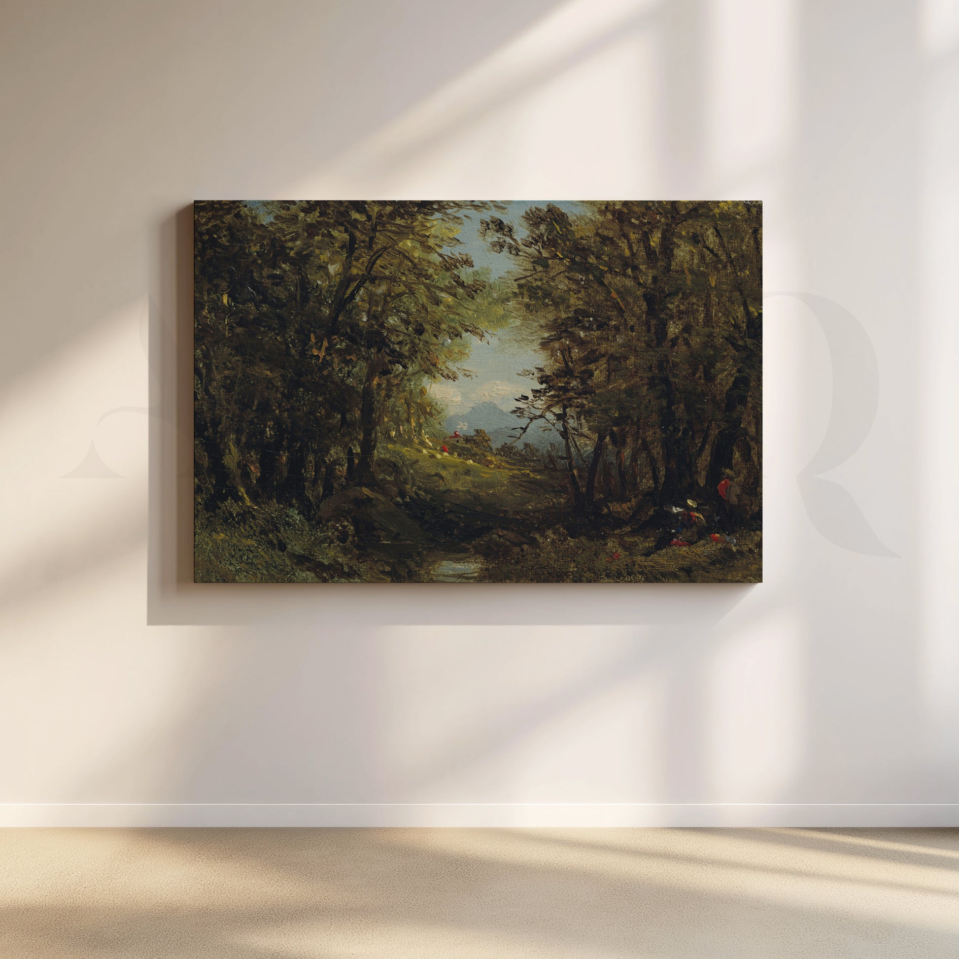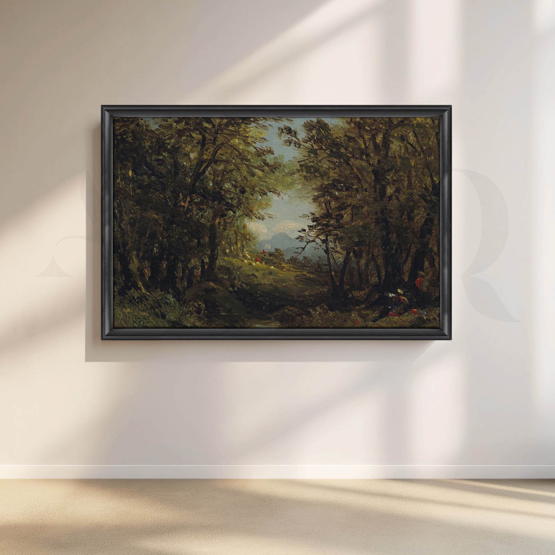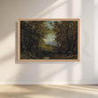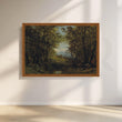 A moody woodland scene opens to a distant hill view, painted in deep greens and earthy browns with a dramatic natural “frame” of trees. Ideal as a study room canvas painting or office wall art, it adds focus, depth, and a classic landscape mood to quiet spaces.