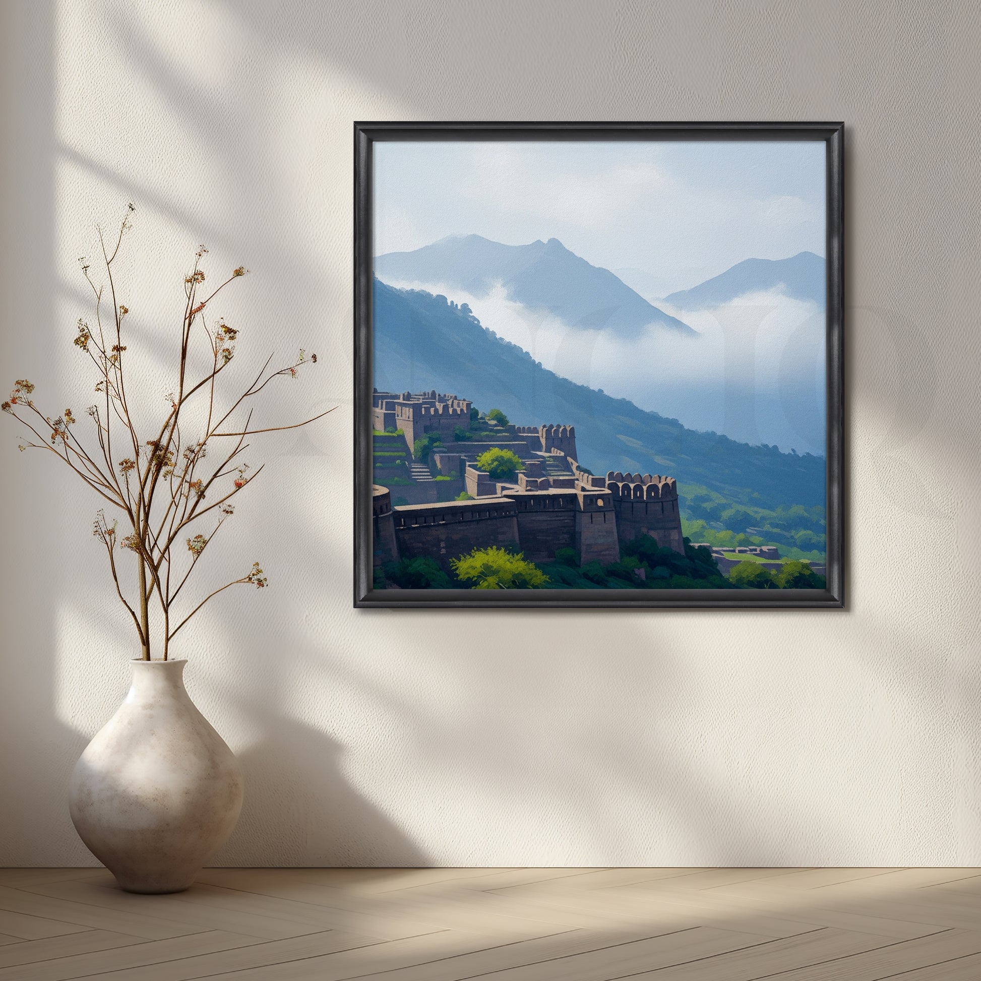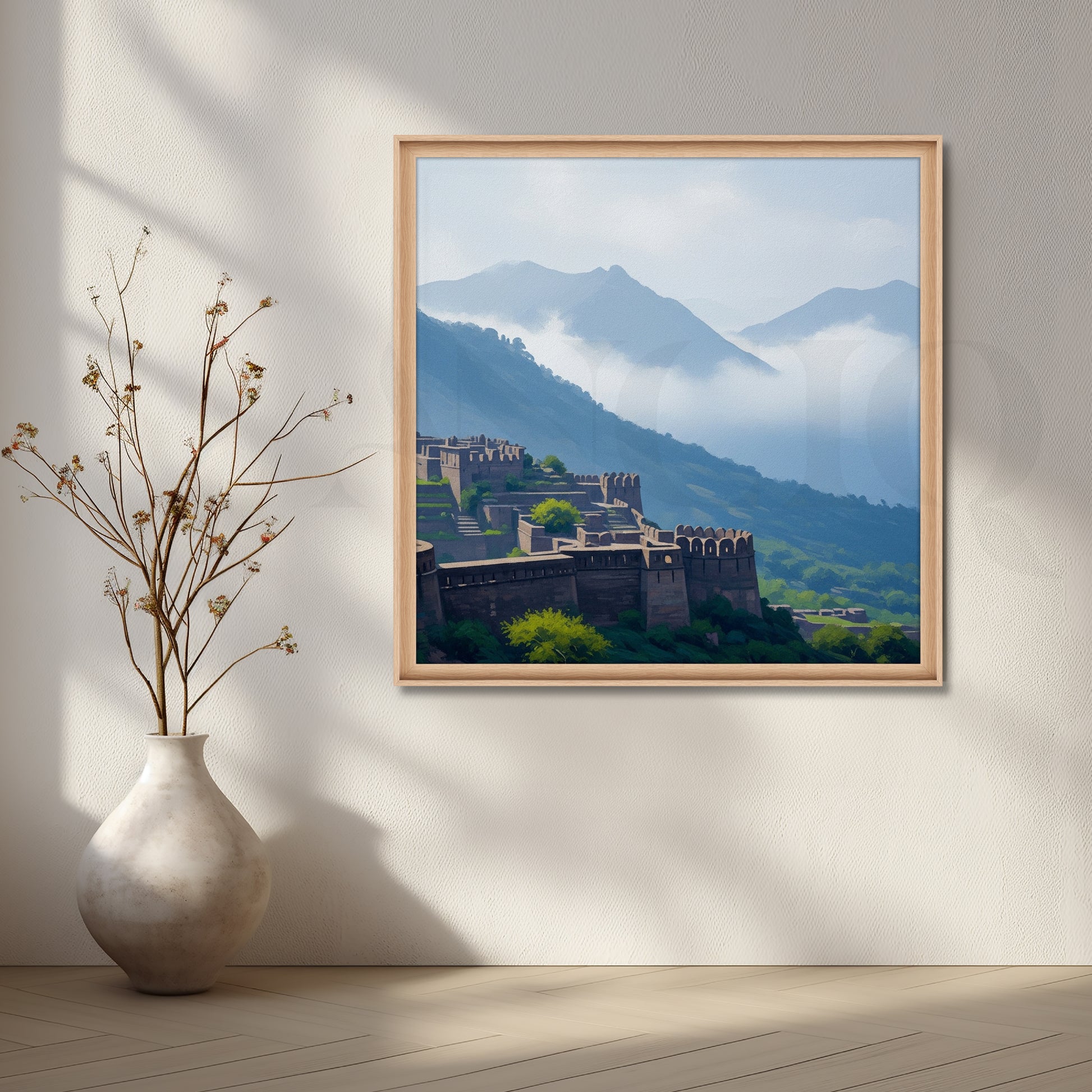 Anciq ‘Fortress in the Mist’ canvas artwork captures a majestic Indian fort nestled in the lush mountains, with rolling mist and morning sunlight setting a regal tone. Ideal for living rooms or offices seeking heritage-themed, scenic wall art. A perfect piece for those searching for modern Indian art, fort paintings, or landscape canvas décor.