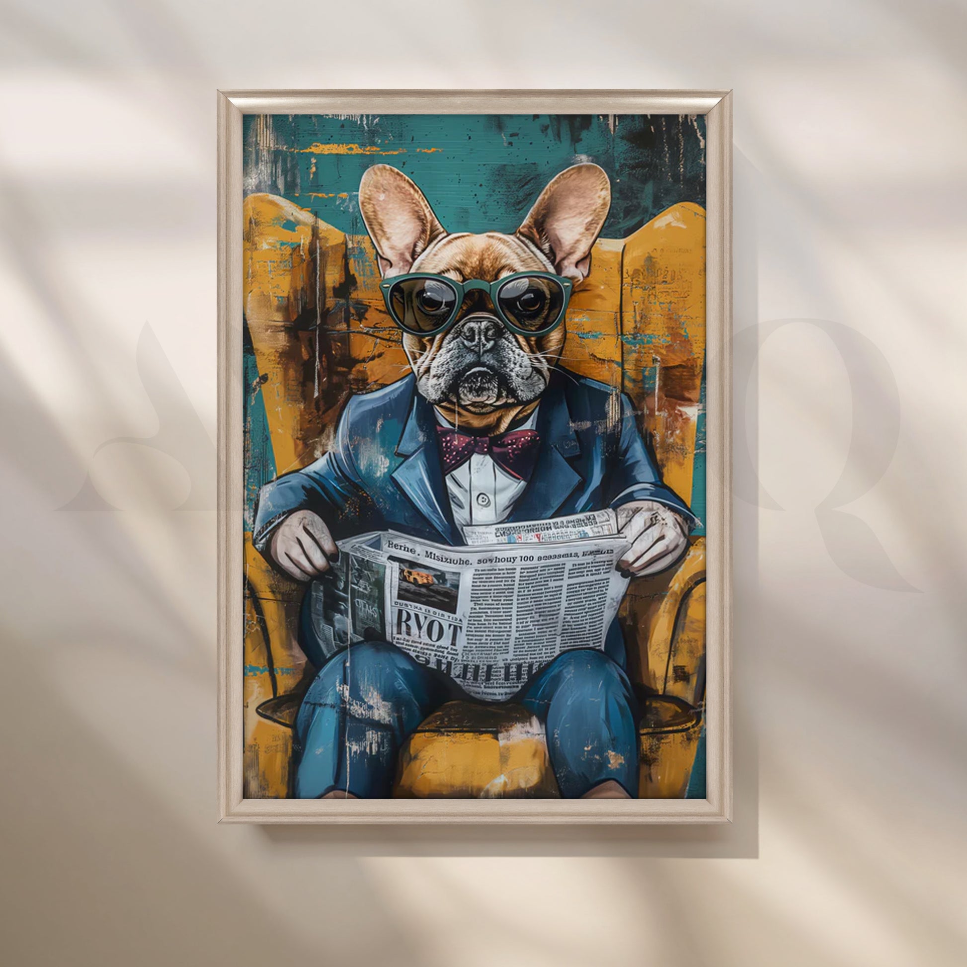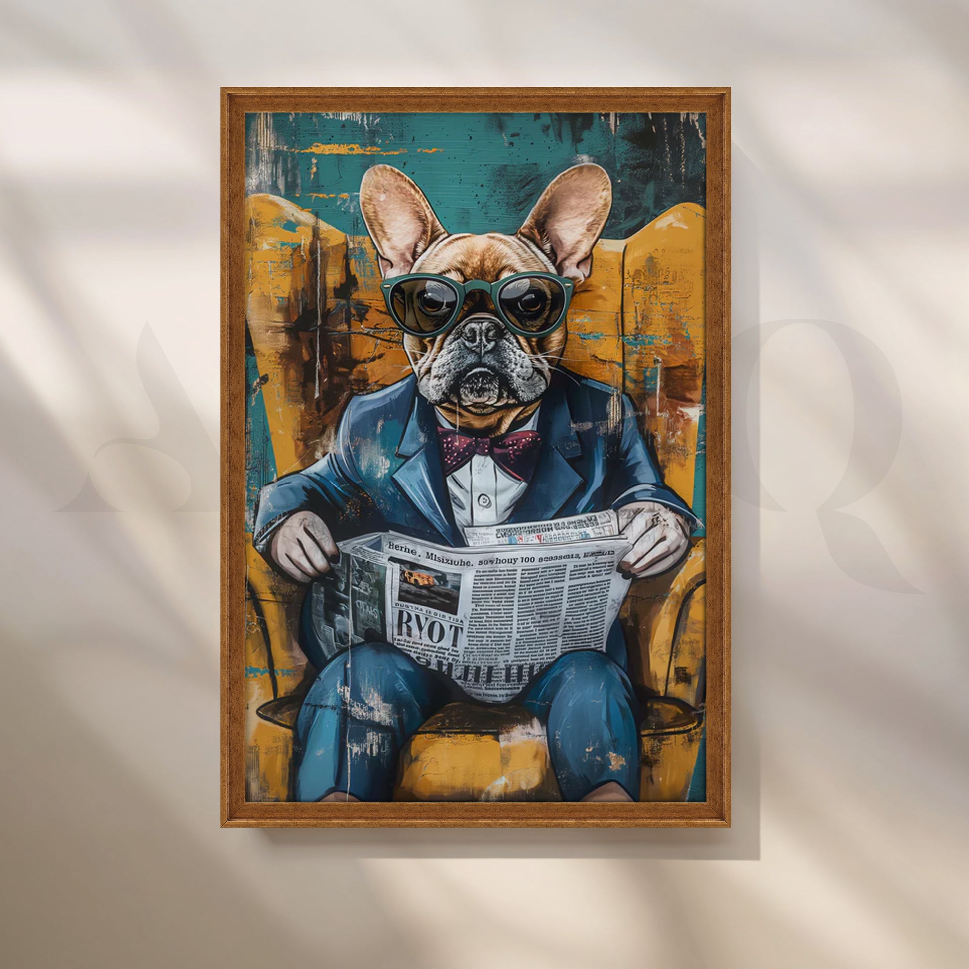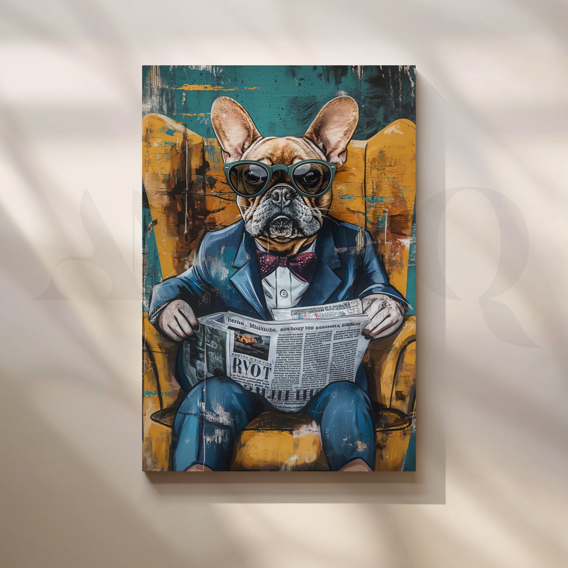Bring personality and wit to your workspace with this dapper bulldog in a tailored suit, oversized sunglasses, and chunky gold chain—rendered in a modern pop-art style with gritty graffiti textures and metallic gold accents. This whimsical dog art makes a standout focal point for a home office or study, adding cool urban character to neutral walls. Printed on premium canvas, it’s perfect as modern wall art, pop art décor, or large living room art for anyone who loves stylish, conversation-starting animal prints.