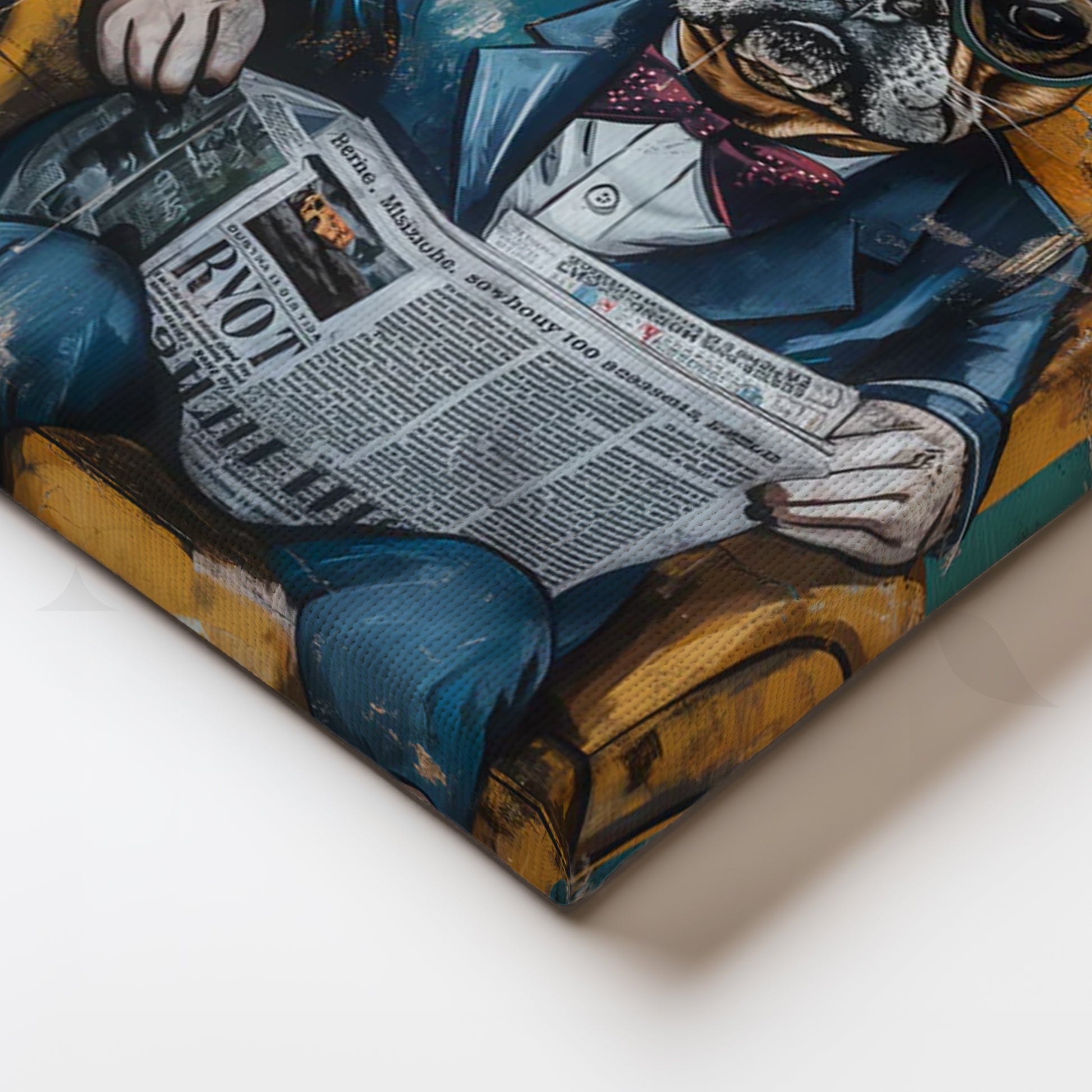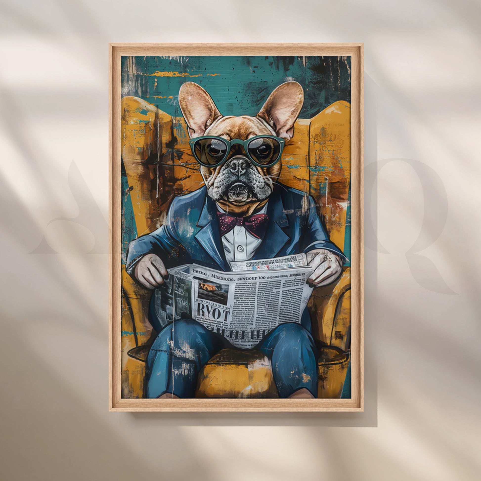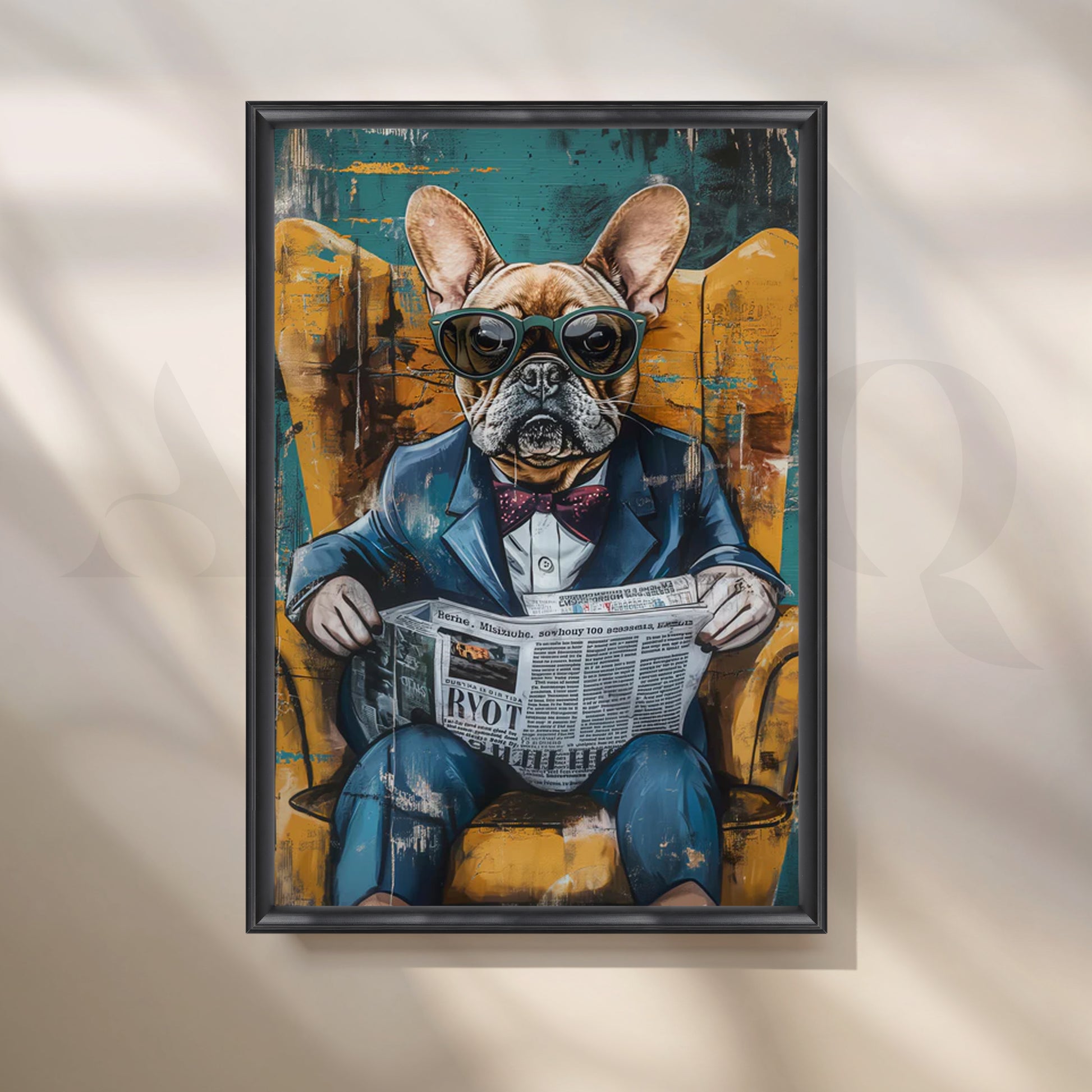 Bring personality and wit to your workspace with this dapper bulldog in a tailored suit, oversized sunglasses, and chunky gold chain—rendered in a modern pop-art style with gritty graffiti textures and metallic gold accents. This whimsical dog art makes a standout focal point for a home office or study, adding cool urban character to neutral walls. Printed on premium canvas, it’s perfect as modern wall art, pop art décor, or large living room art for anyone who loves stylish, conversation-starting animal prints.