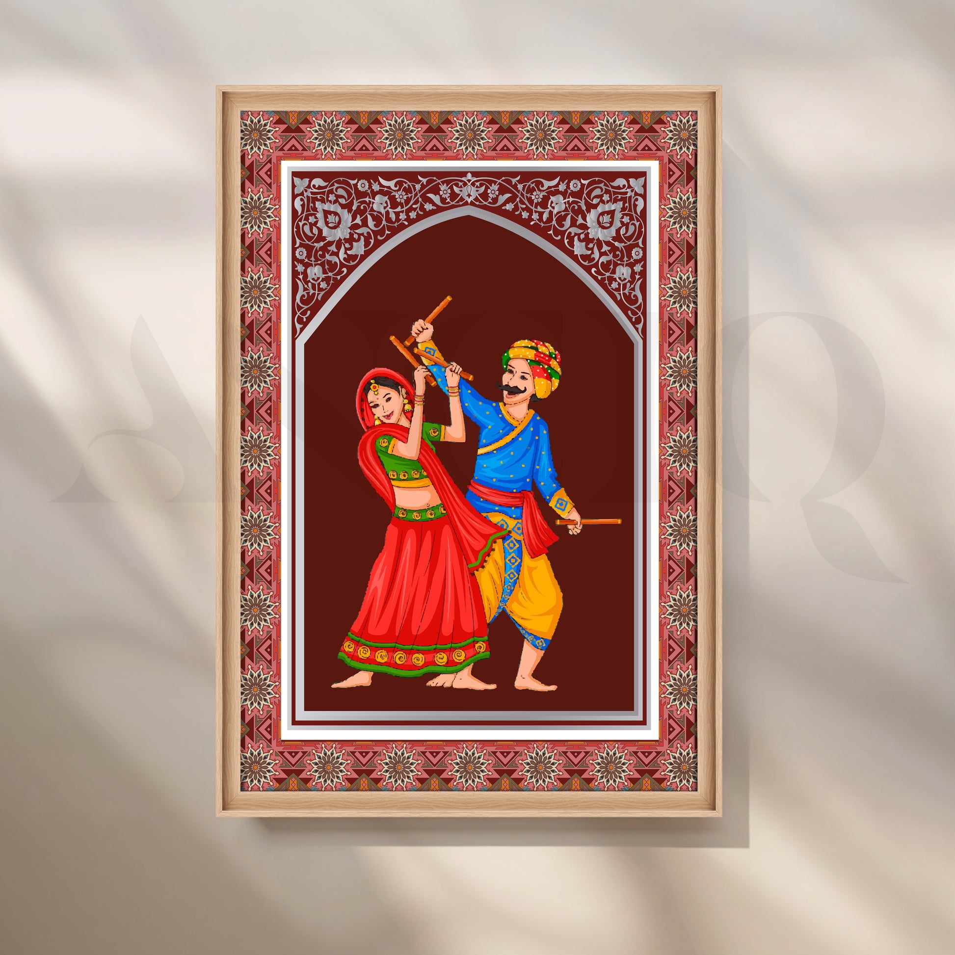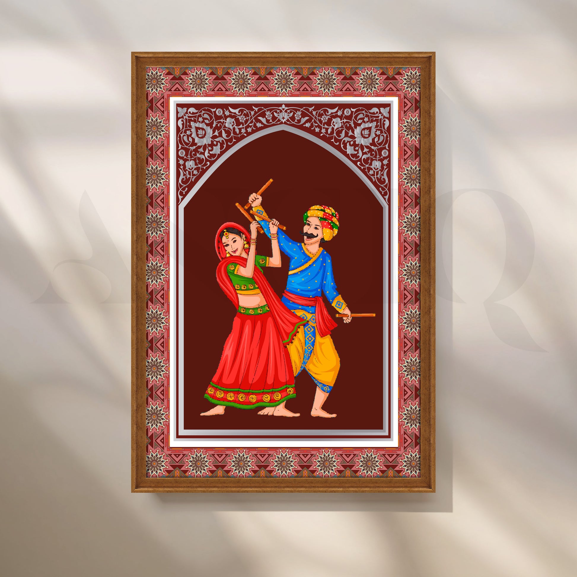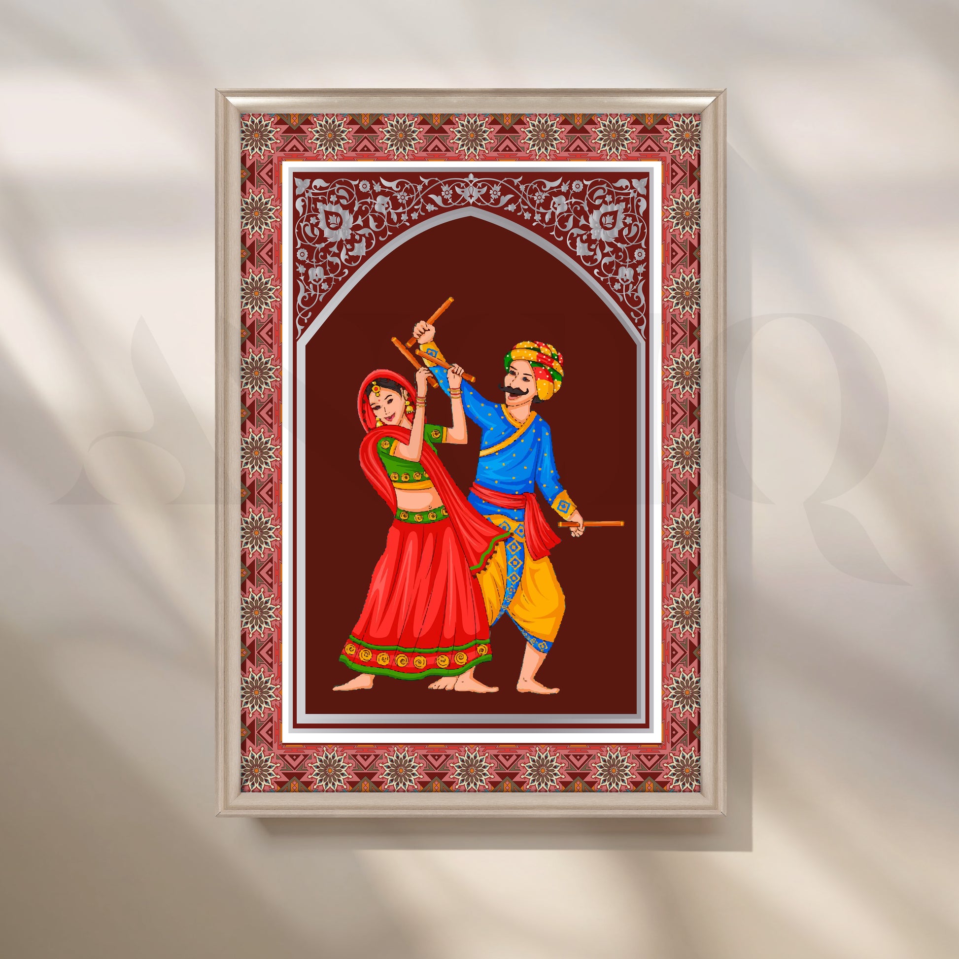 This joyful Rajasthani canvas artwork depicts a traditional couple performing garba with colourful outfits and ornate border motifs. Rich reds, blues and intricate arch details bring authentic Indian folk art energy to your walls. Ideal Rajasthani wall art for festive décor, dining spaces, entryways and cultural corners.