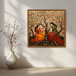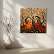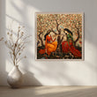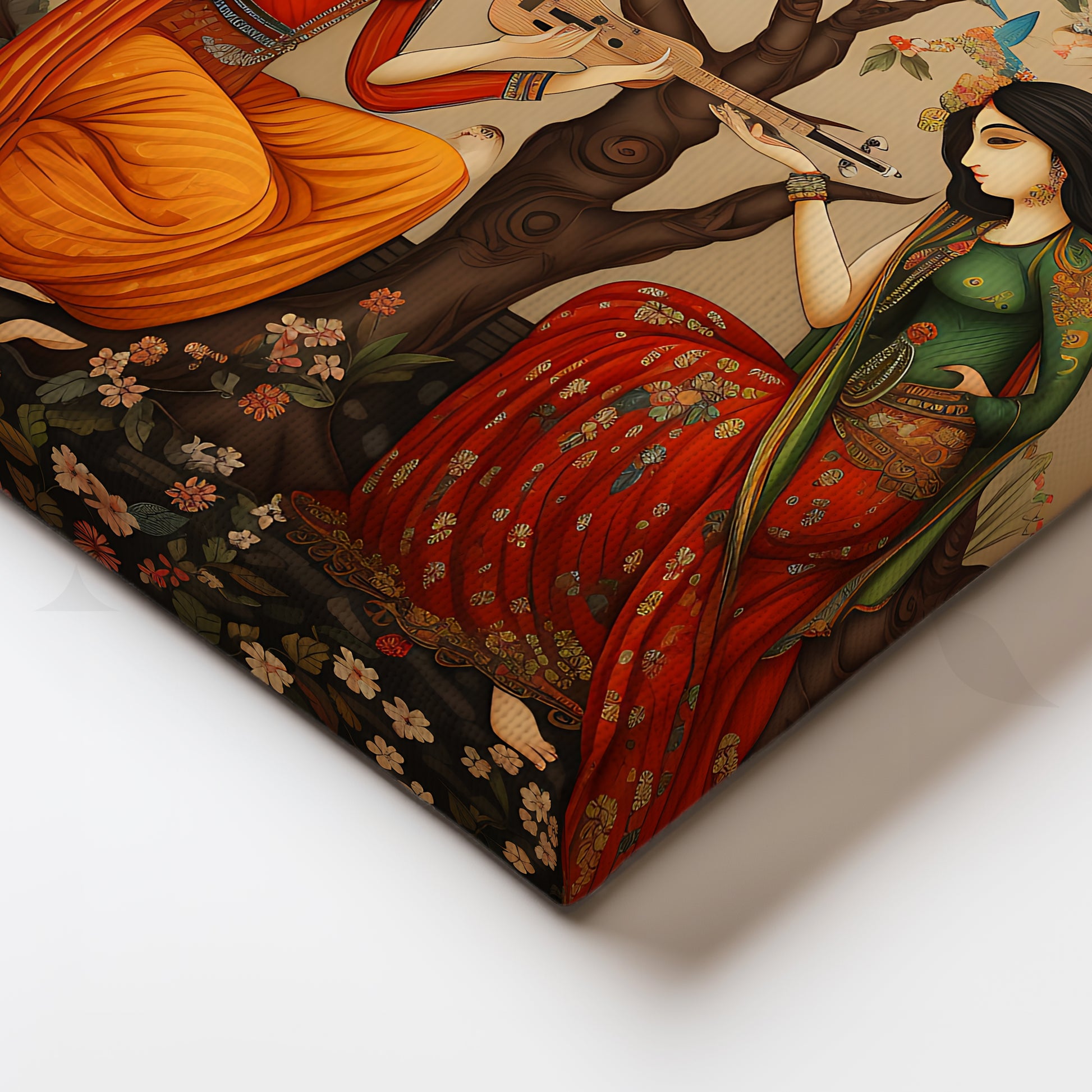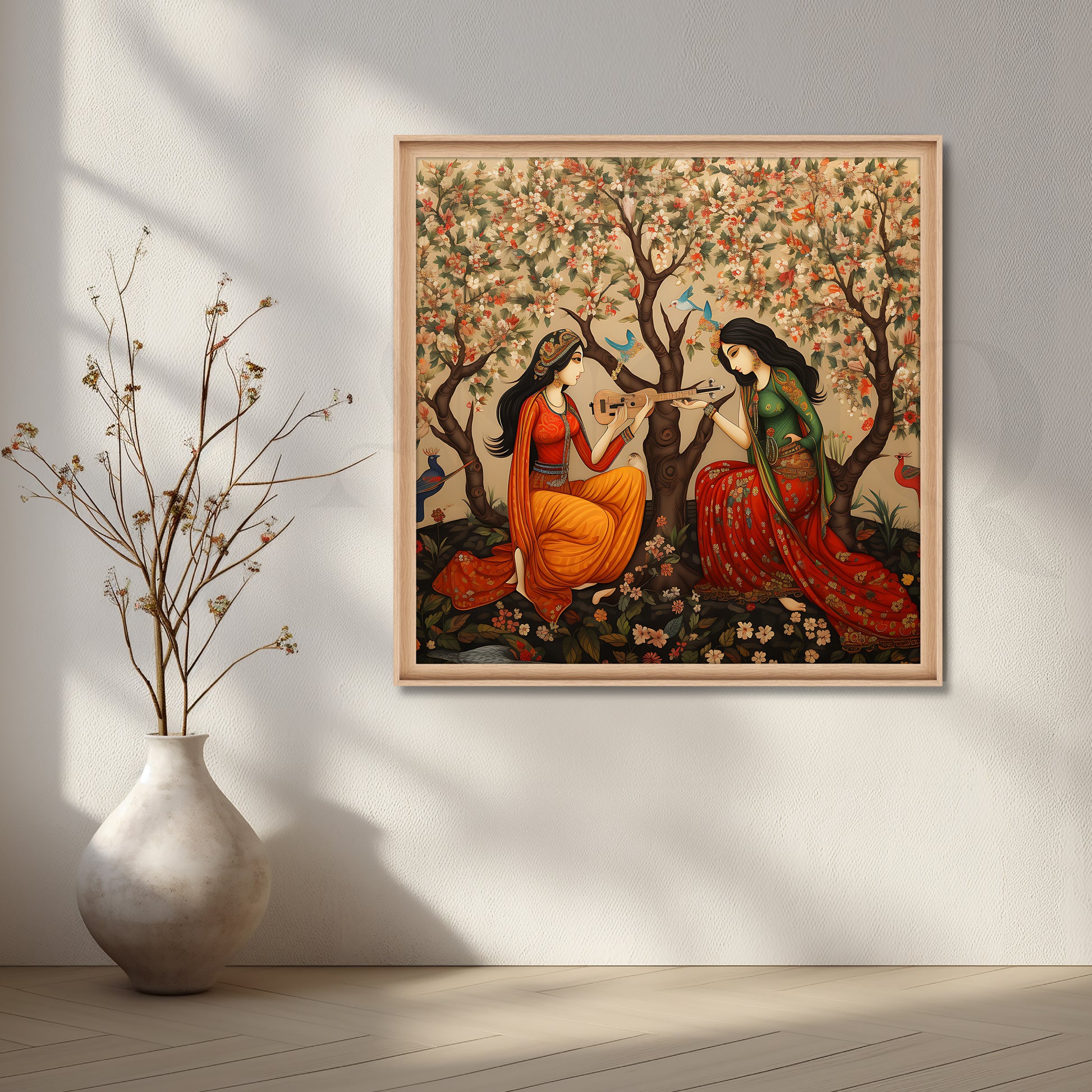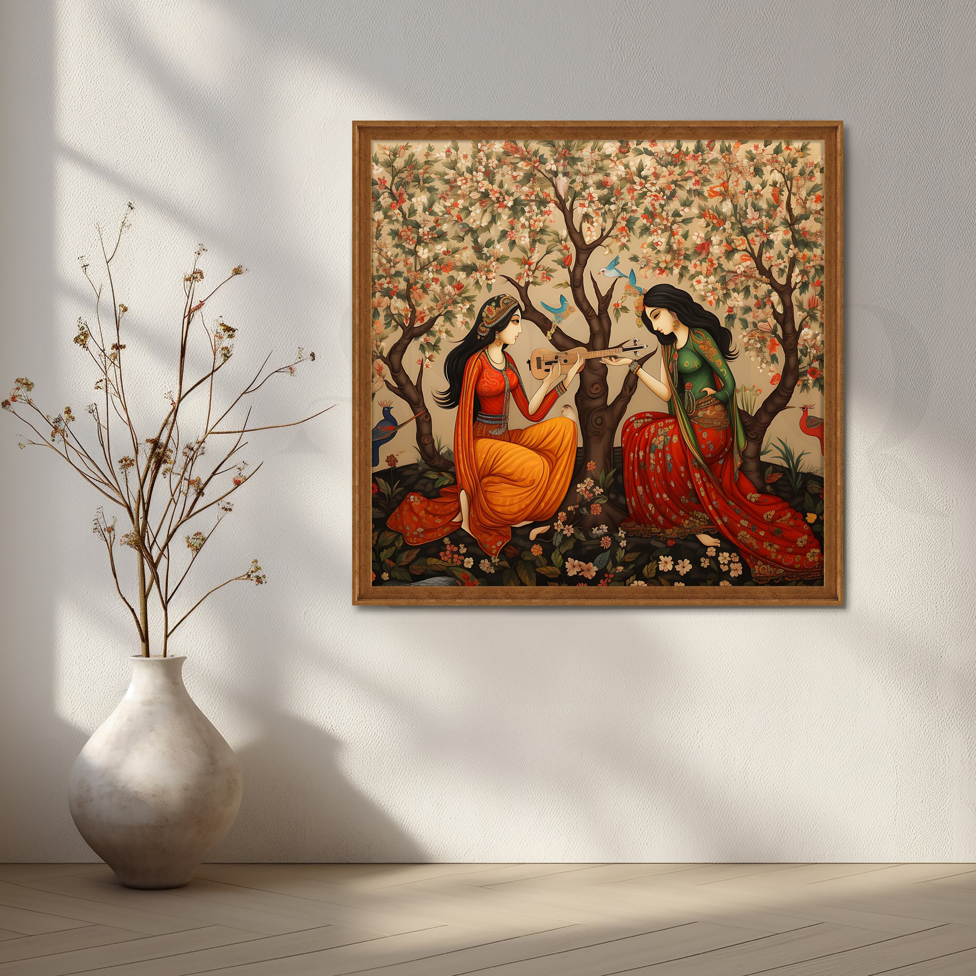 Celebrate music, friendship and nature with Anciq’s Garden of Melodies canvas artwork. Two graceful women in flowing traditional attire sit beneath blossoming trees, surrounded by songbirds and delicate flowers, as one plays an instrument and the other listens. Rich earthy tones and intricate detailing give this piece the charm of miniature painting and vintage Indian art.