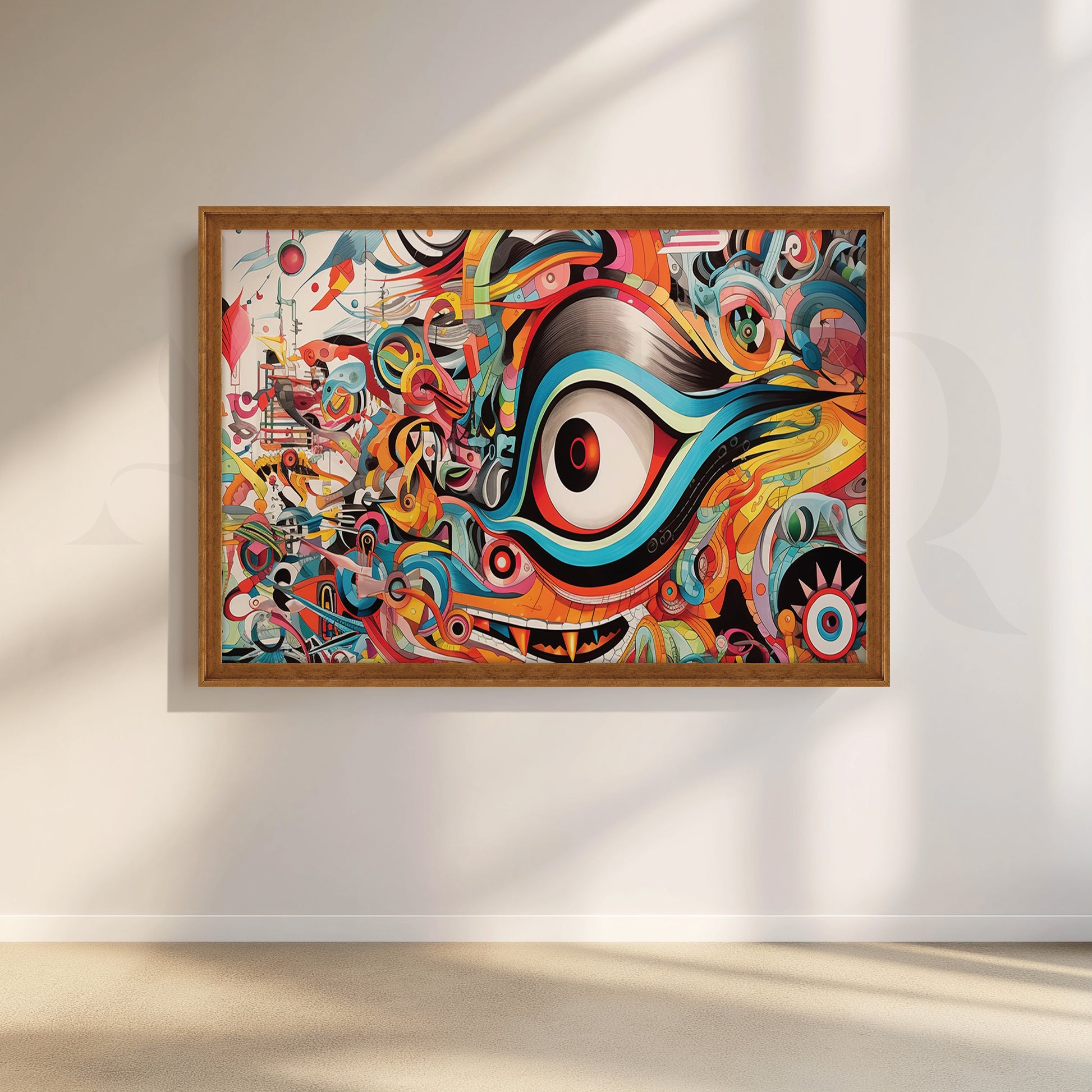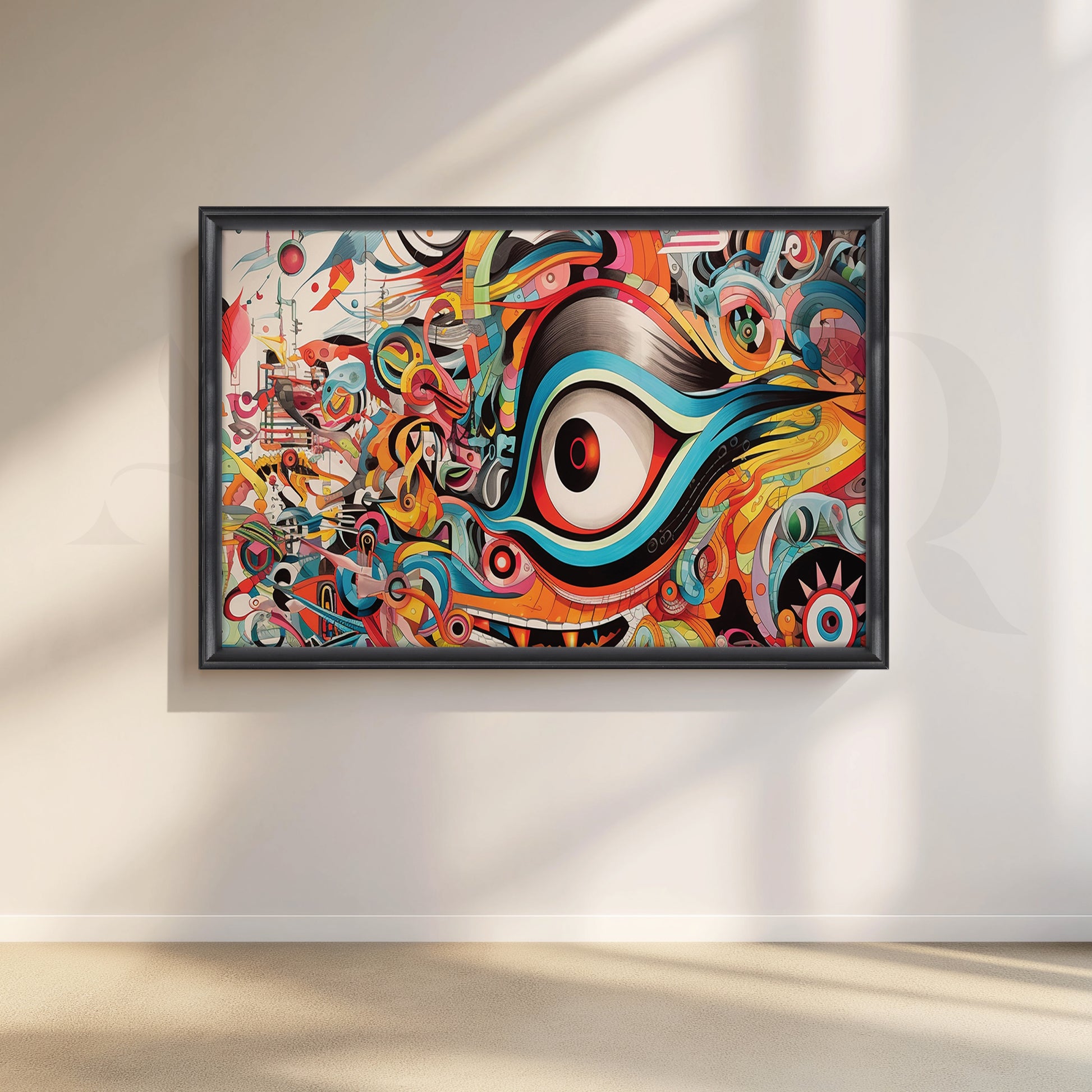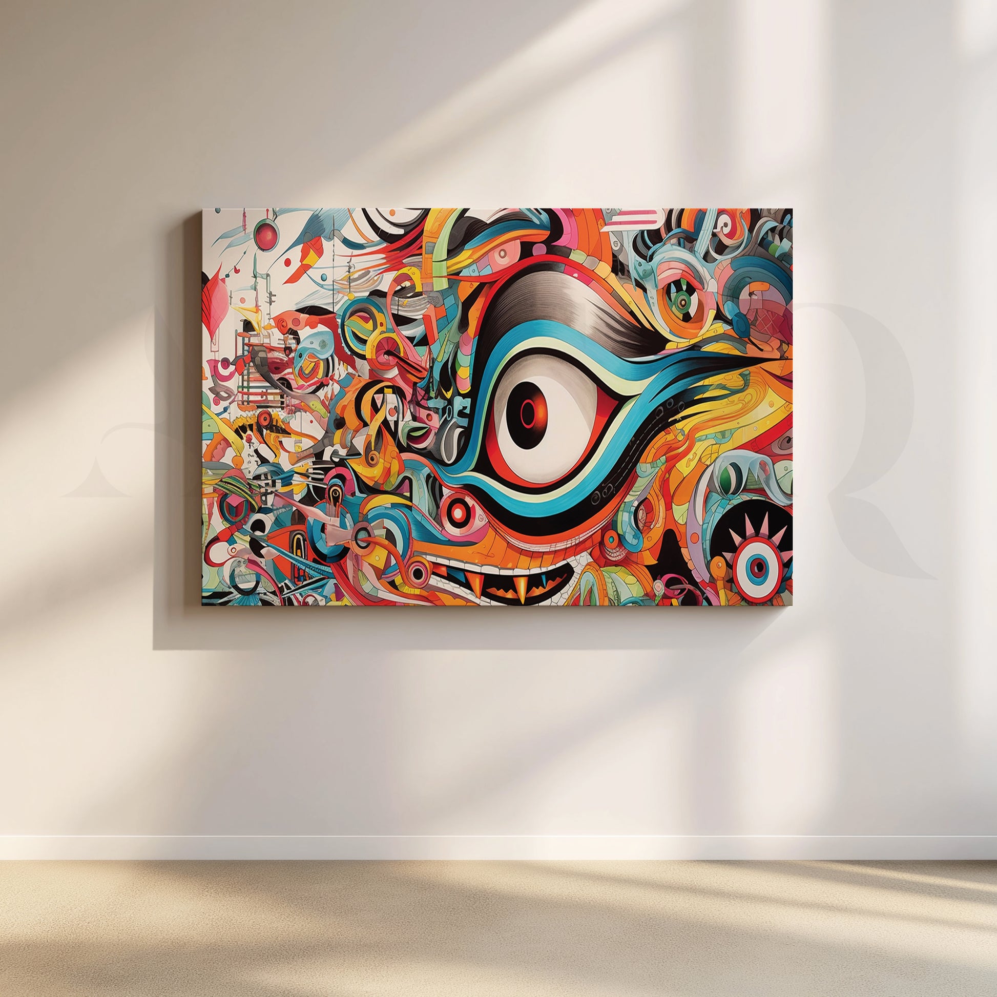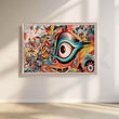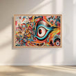 This animated canvas illustration showcases a bright and abstract eye. The eyes are set on a kaleidoscope of colors, with blue, green and red rotating around the red central eye. The background is filled with bold geometric patterns that match the colors of the eyes. This piece will definitely be a conversation starter and focal color for any room.