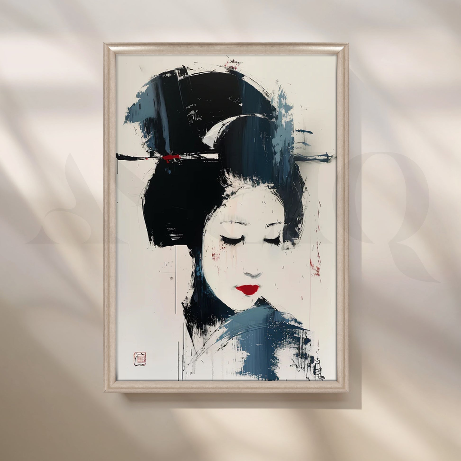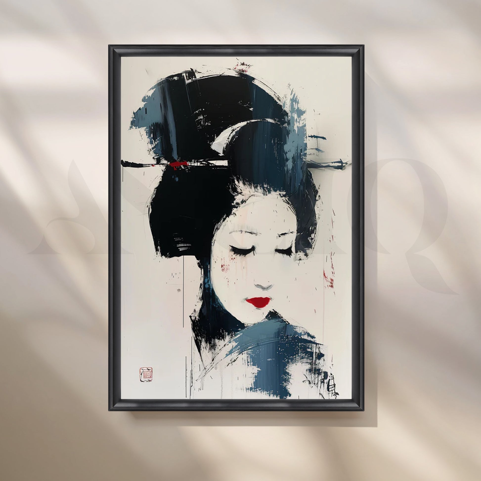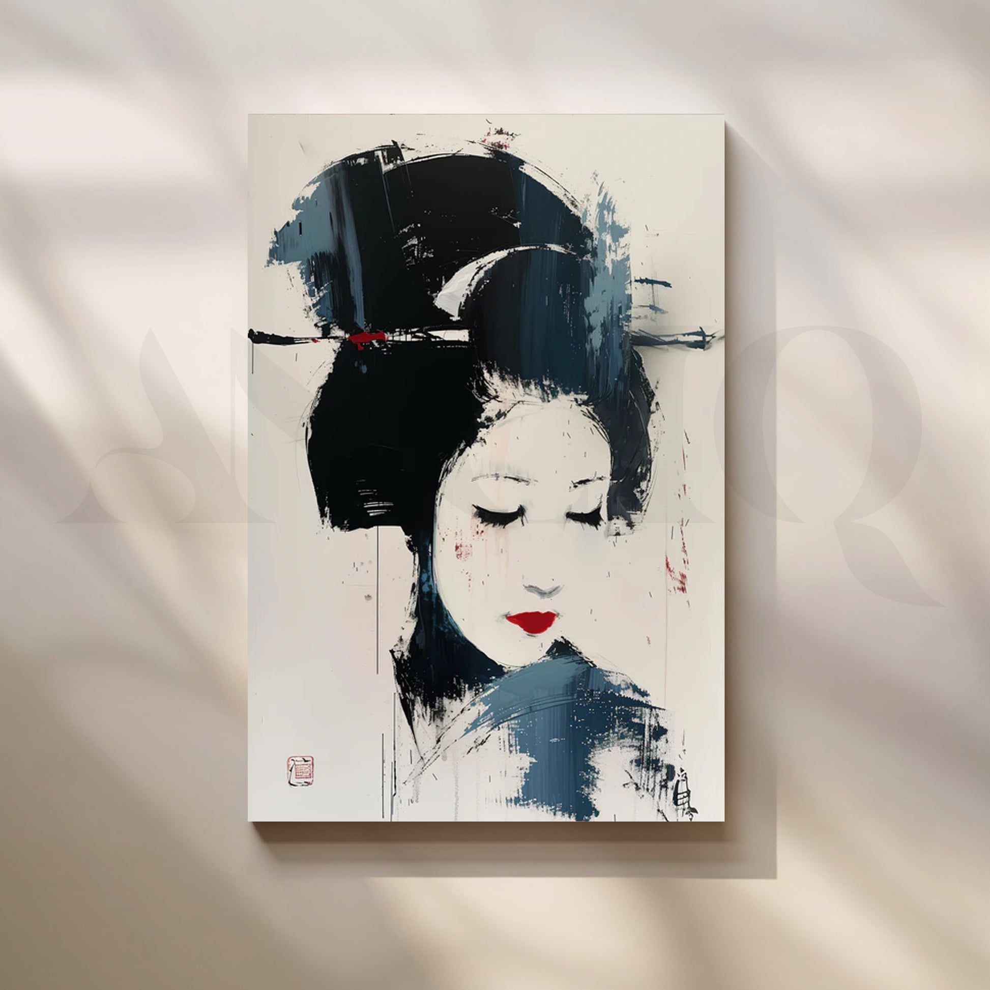 “Silent Geisha” blends Japanese minimalism with contemporary flair—an elegant portrait rendered in sumi-e–style brushwork, soft ivory tones, inky blacks and deep indigo, finished with a striking red lip. The tranquil composition and negative space create calming, gallery-worthy modern wall art that elevates a zen bedroom, serene entryway, or chic living room. This Asian canvas art brings wabi-sabi warmth to minimalist décor while remaining bold enough to serve as large living room art above a sofa. Perfect for shoppers seeking Japanese wall art, abstract portrait canvas, black and white wall art with a pop of color, modern canvas painting, and sophisticated bedroom décor.
