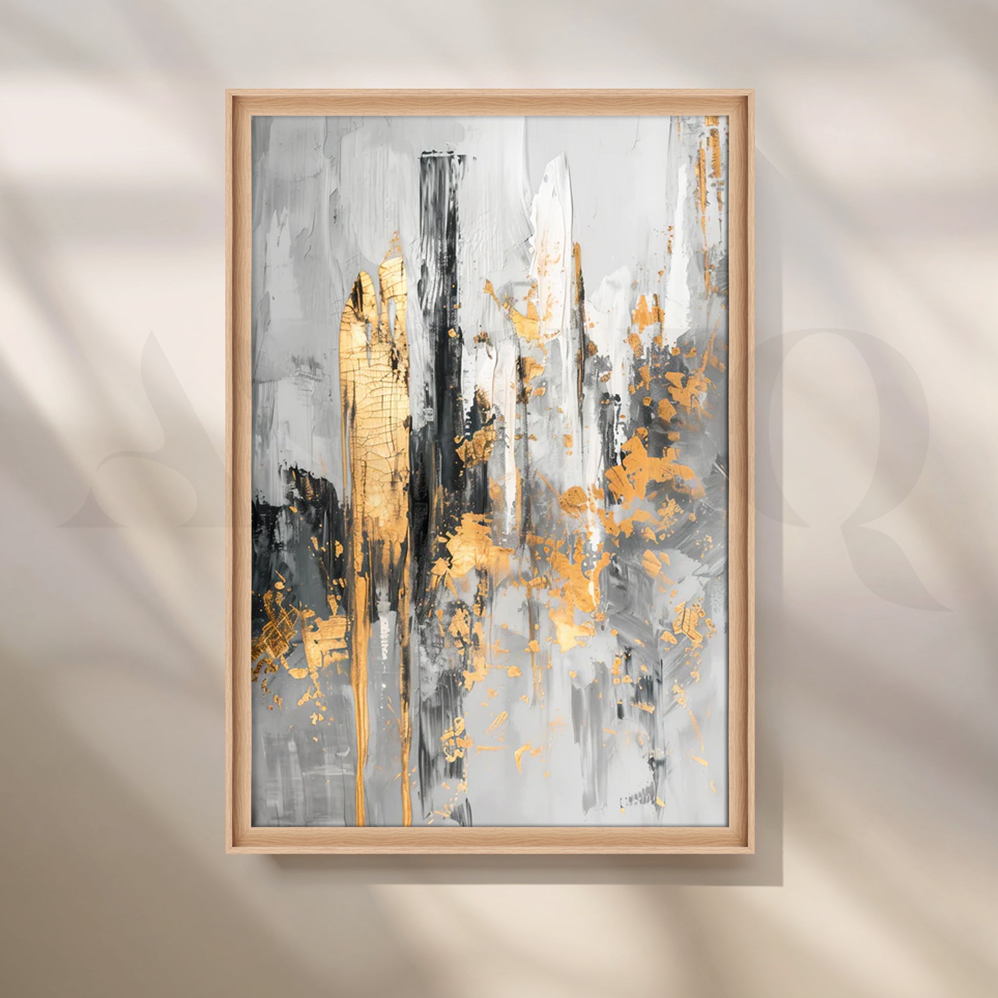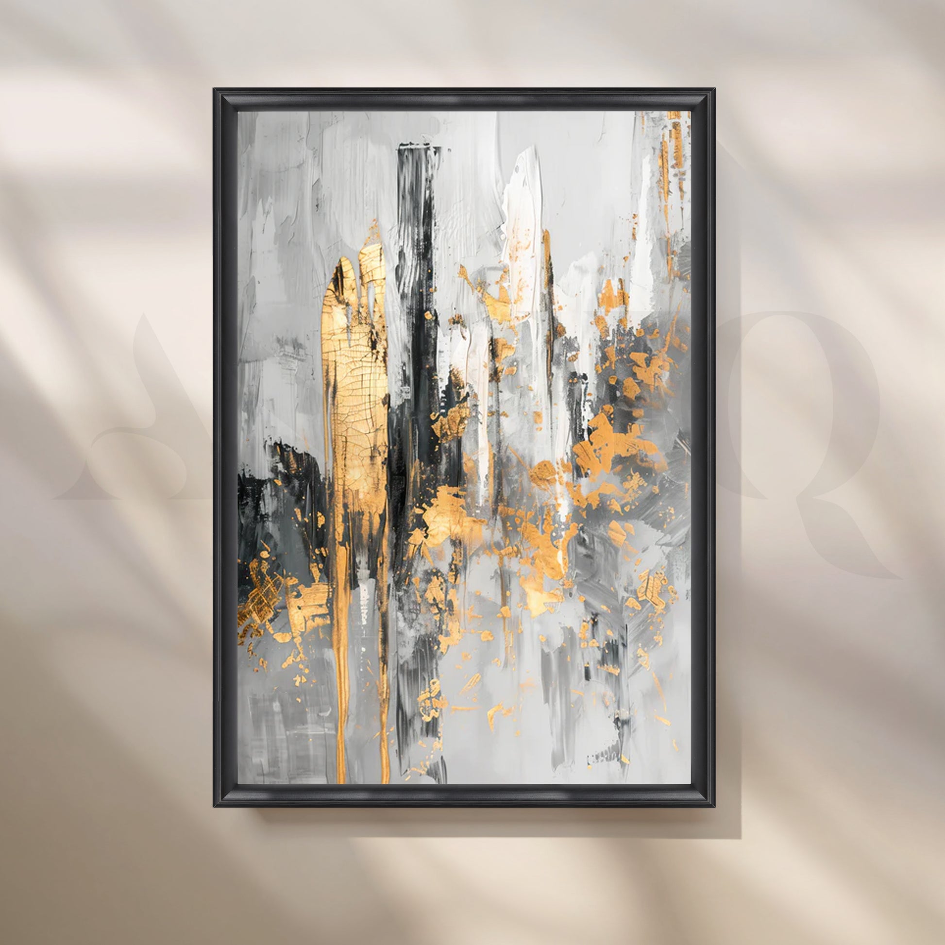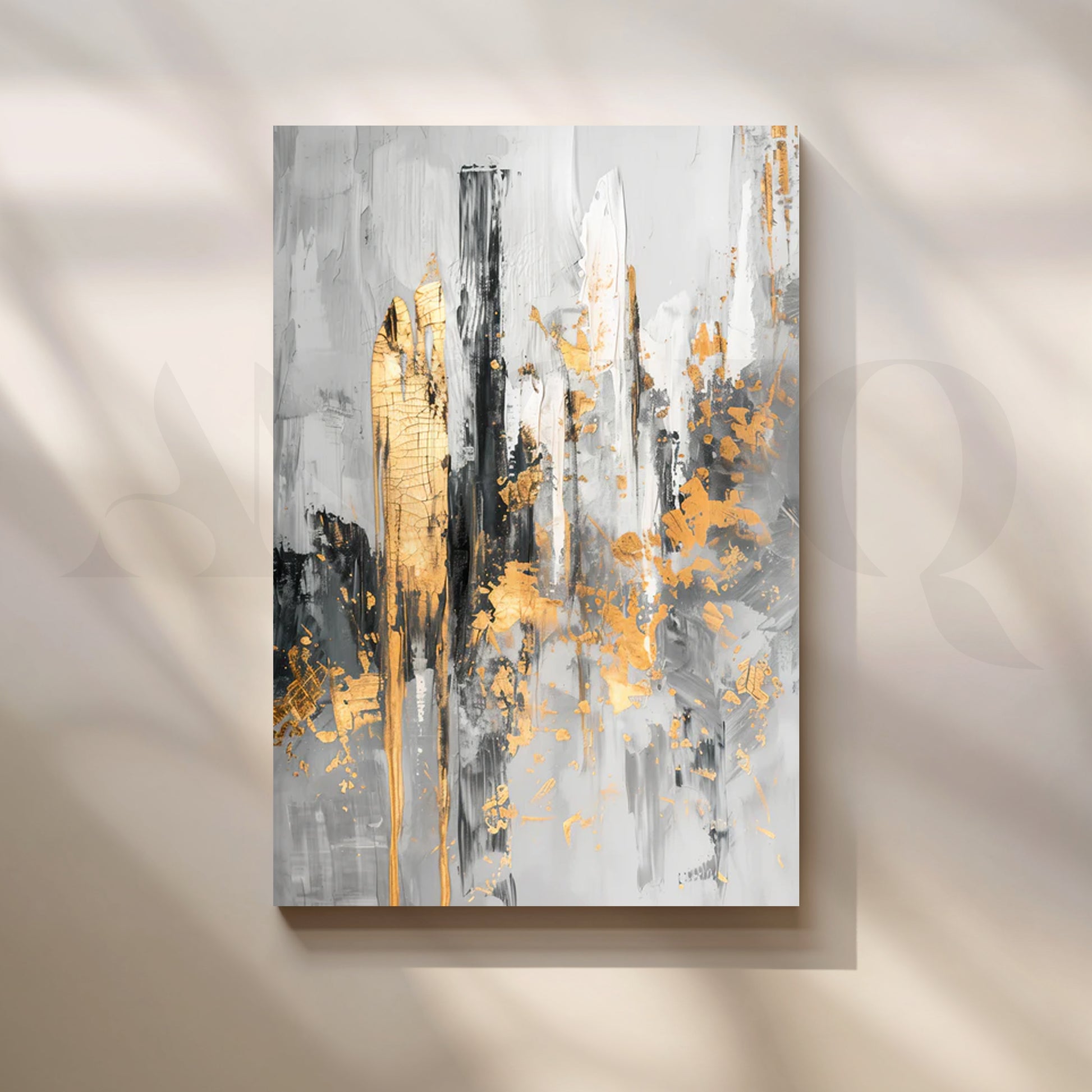 A luxe abstract canvas in layered greys and charcoal is struck with bold metallic gold accents, evoking weathered stone and brushed metal. This modern wall art adds sophisticated glam to a dining room, entryway, or chic office. The textured palette knife strokes and gold splash details create depth and shine, making it a statement piece for contemporary décor, glam interiors, and large wall art collections.