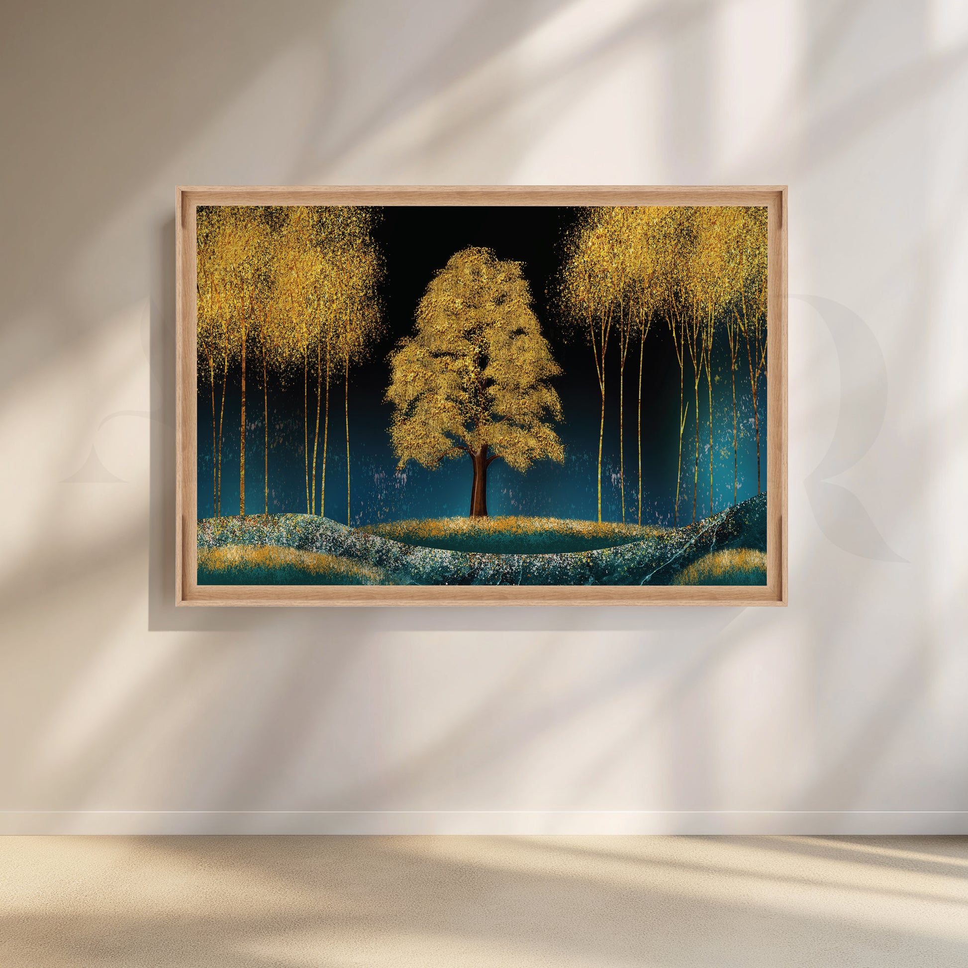 This vibrant canvas painting shows a stunning golden tree high in a dense forest. Sunlight streams through the blue sky, giving the tree’s bright leaves a brilliant glow. A complete conversation piece, this piece of art is sure to add a touch of luxury and sophistication to any space.