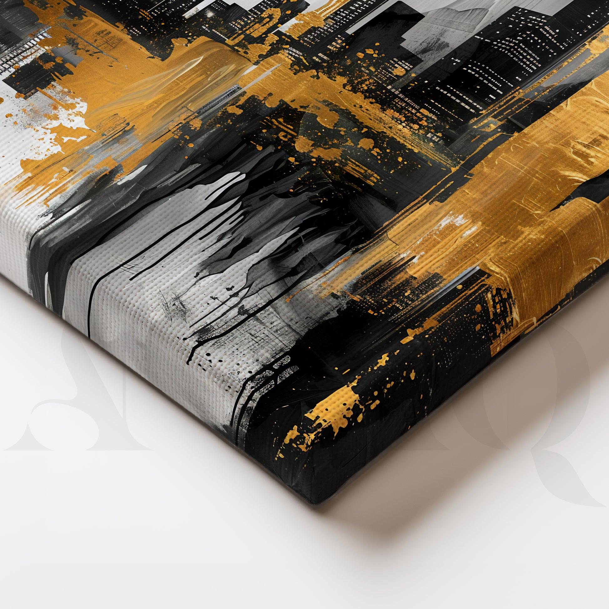 Anciq ‘Golden City Reflections’ Gallery Wall captures a dramatic skyline in black, white, and metallic gold, mirrored on water with expressive brushstrokes. Perfect for living rooms, offices, reception areas, and modern apartments, this 3-piece abstract cityscape adds a luxe urban edge. Ideal for city skyline wall art and contemporary statement décor above sofas or consoles.