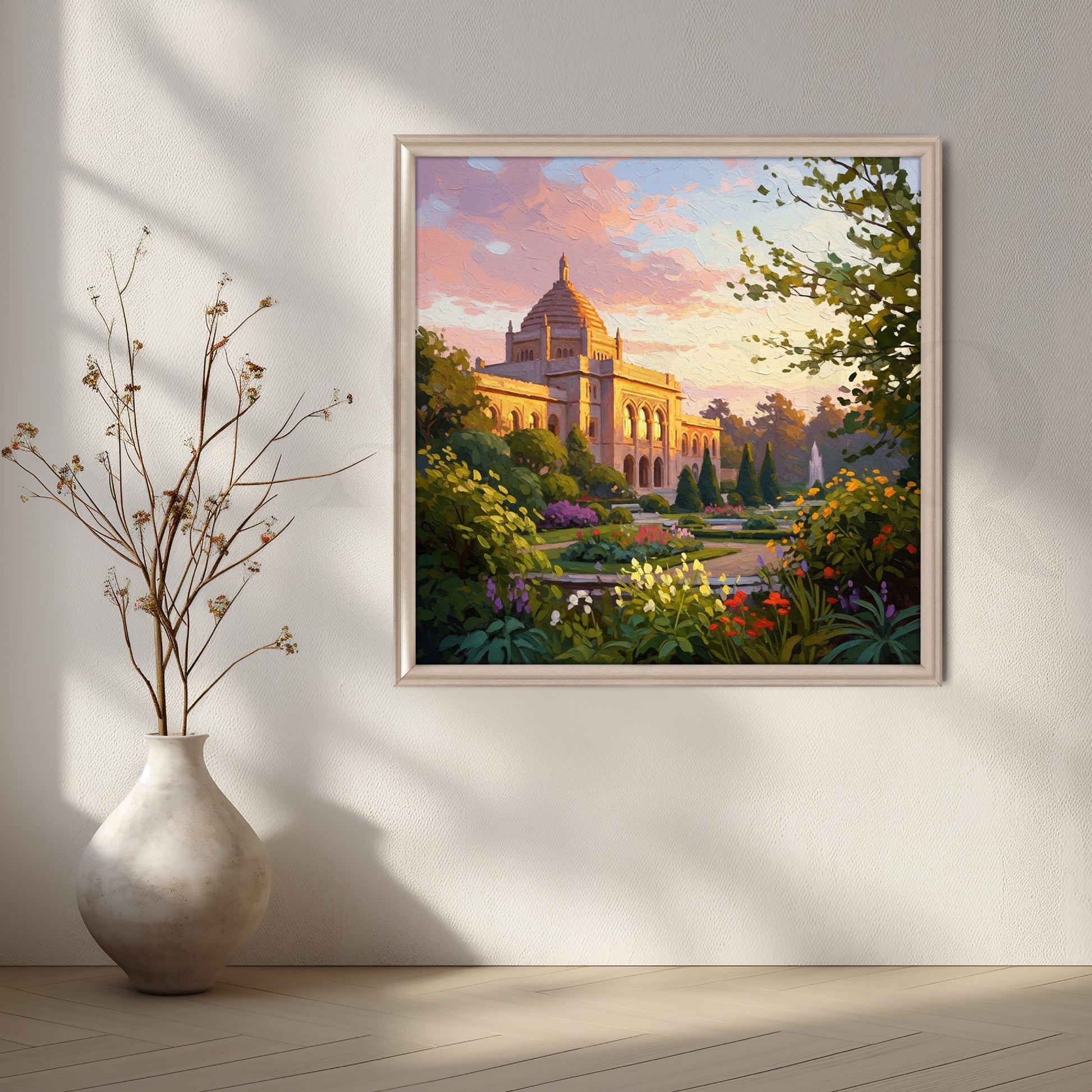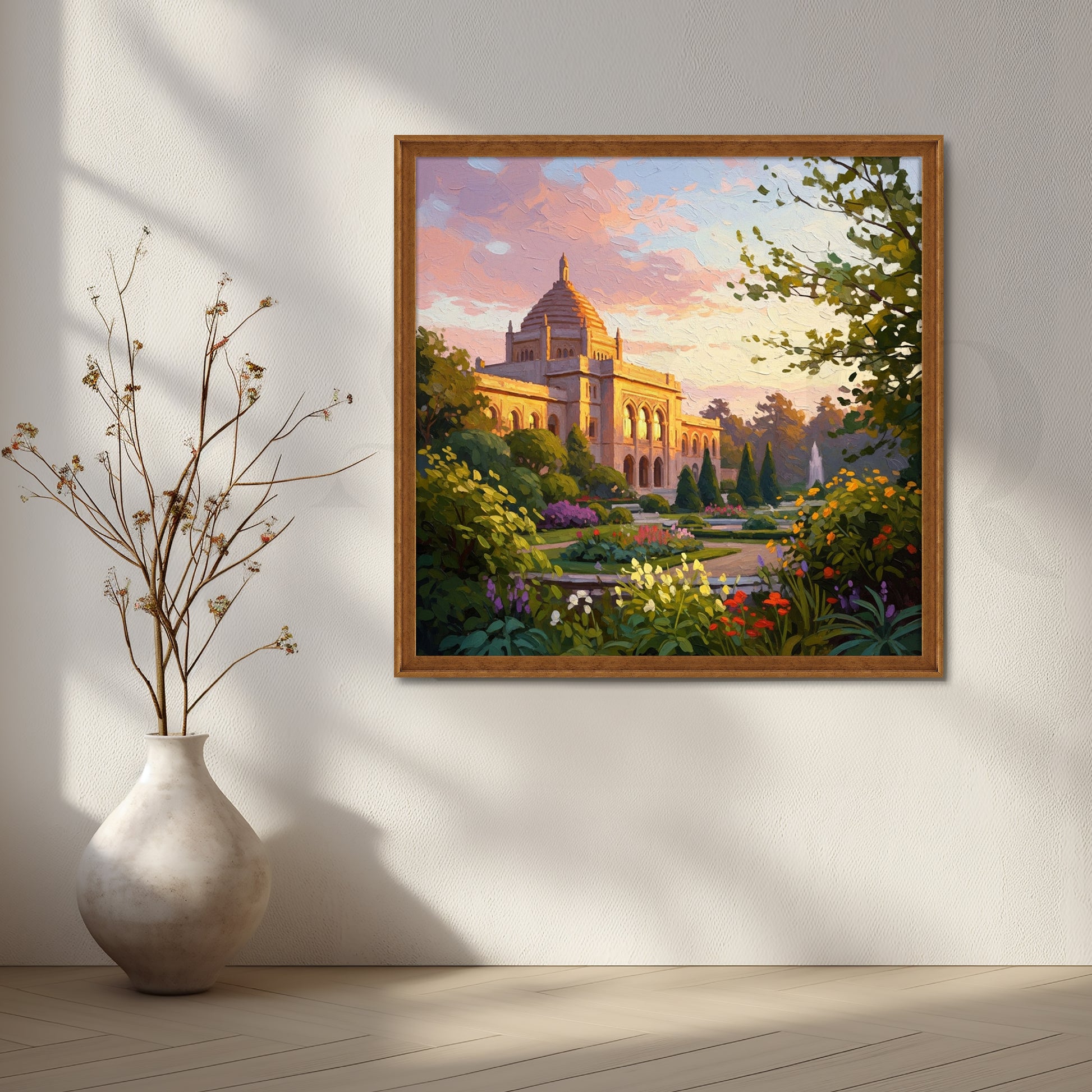Anciq ‘Golden Dome Garden’ presents a majestic Indian dome bathed in sunset hues, framed by lush florals. Ideal for entryways, formal living rooms, or heritage-themed interiors, this artwork blends architectural grandeur with botanical beauty. Works for buyers looking for royal Indian architecture art or Mughal-style canvas prints.