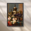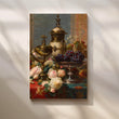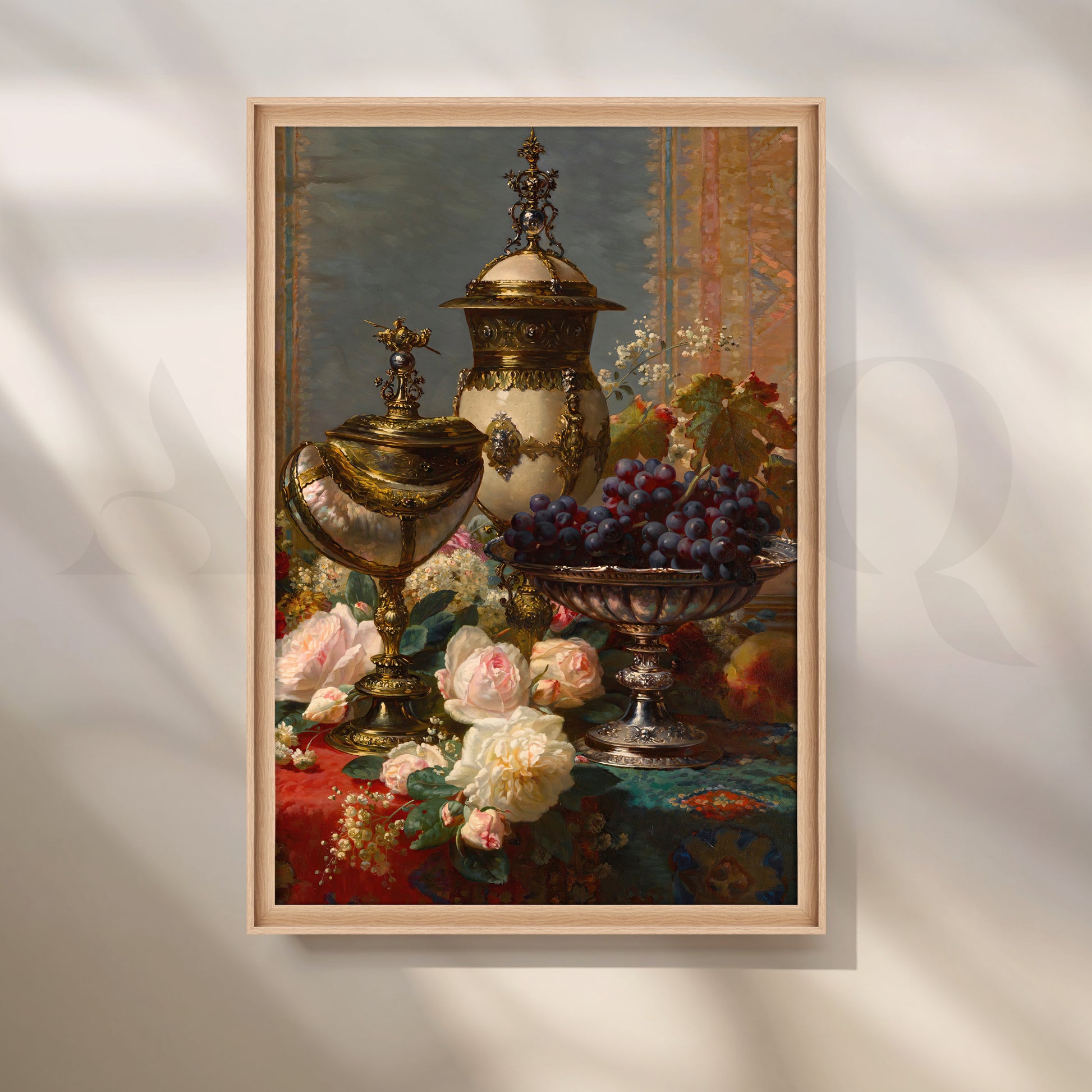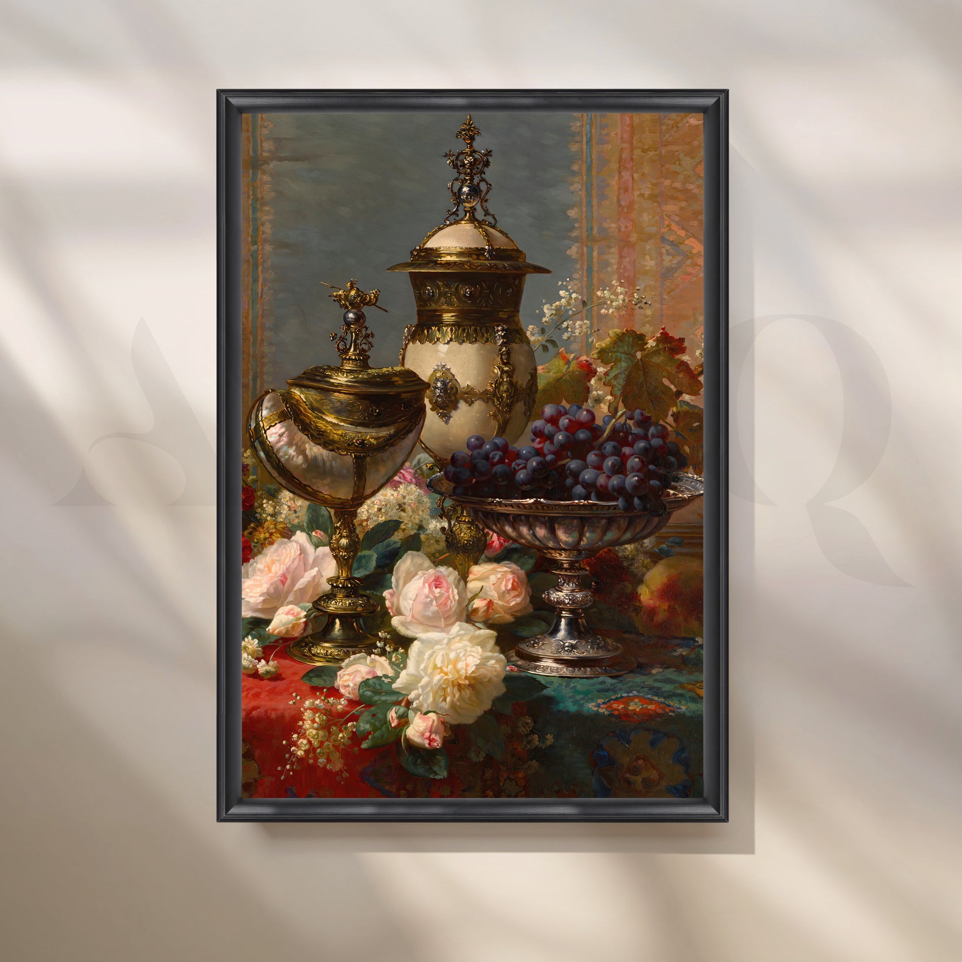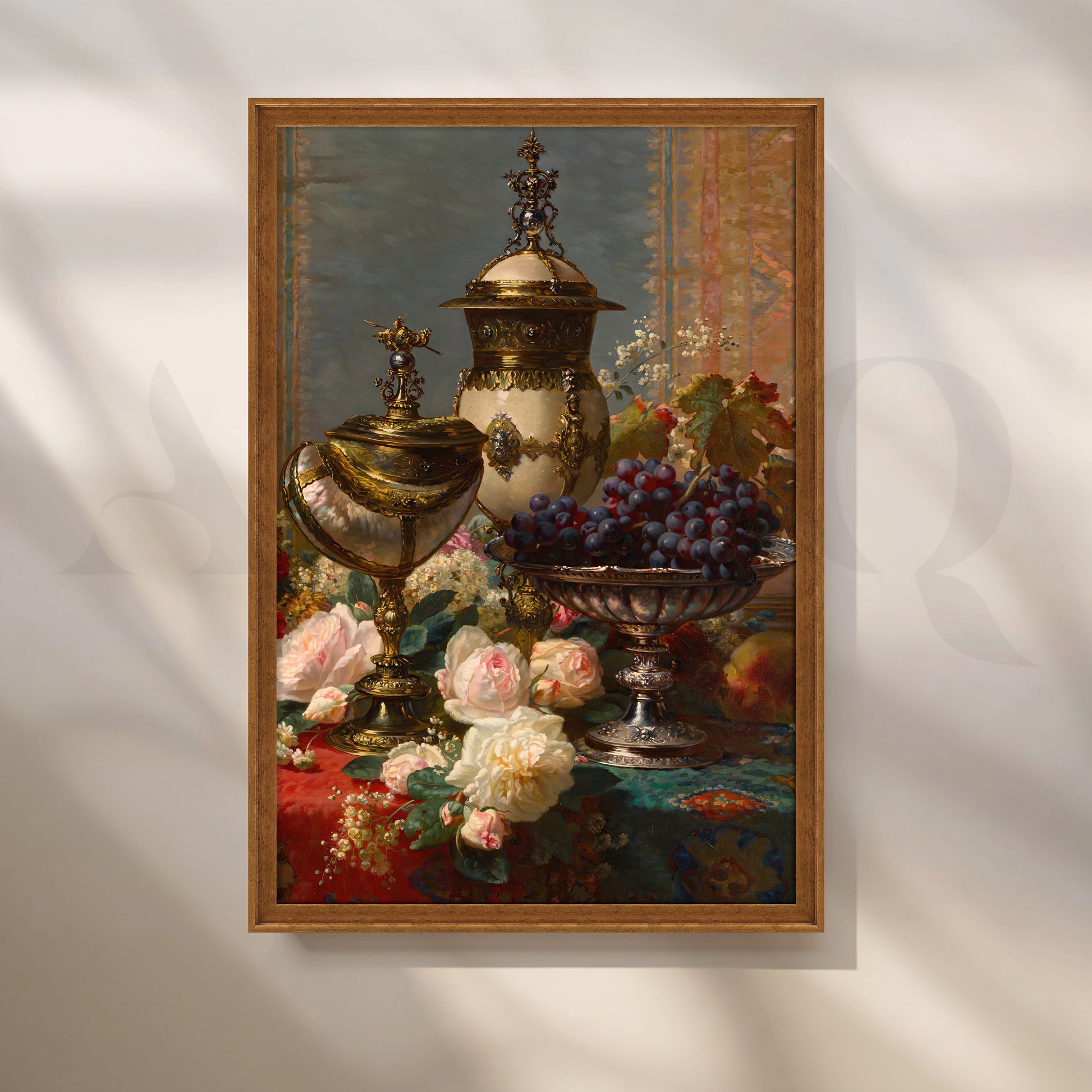 An ornate Anciq artwork showcasing gilded vases, roses, and grapes on an embroidered tablecloth—reflecting timeless opulence. Perfect for classic living rooms or formal spaces. Keywords: gold vase still-life, vintage floral artwork, royal home decor, European classic wall art, luxury interior canvas.