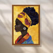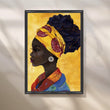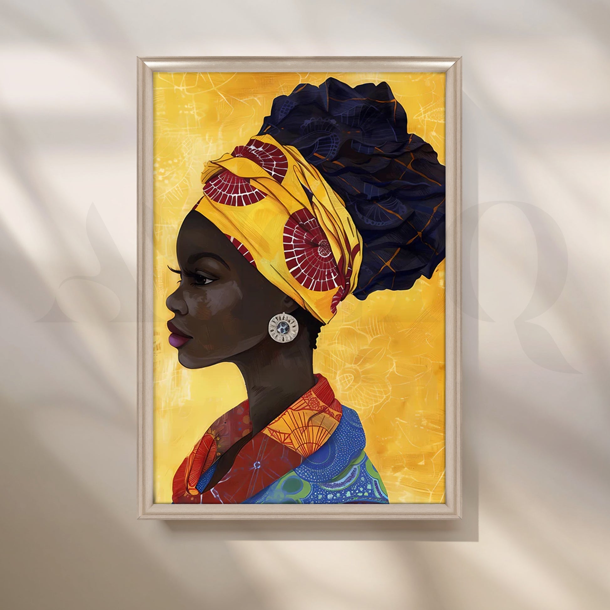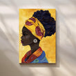 A poised side-profile rendered against a sunlit yellow field showcases intricate patterns and jewelry for a refined, Afrocentric statement. The warm palette and crisp lines make this modern canvas ideal for an entryway or hallway, setting a sophisticated tone the moment guests arrive. Works seamlessly as contemporary wall art, gallery-wall anchor, or upscale boho décor for dining rooms and home offices.