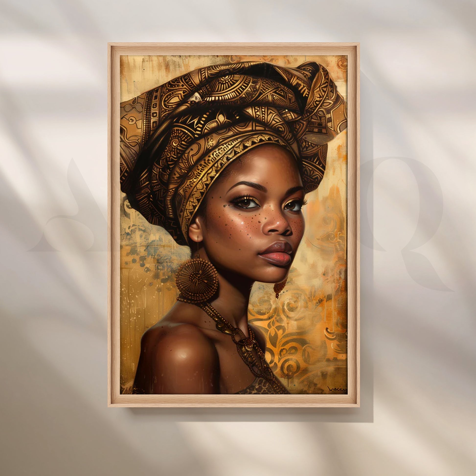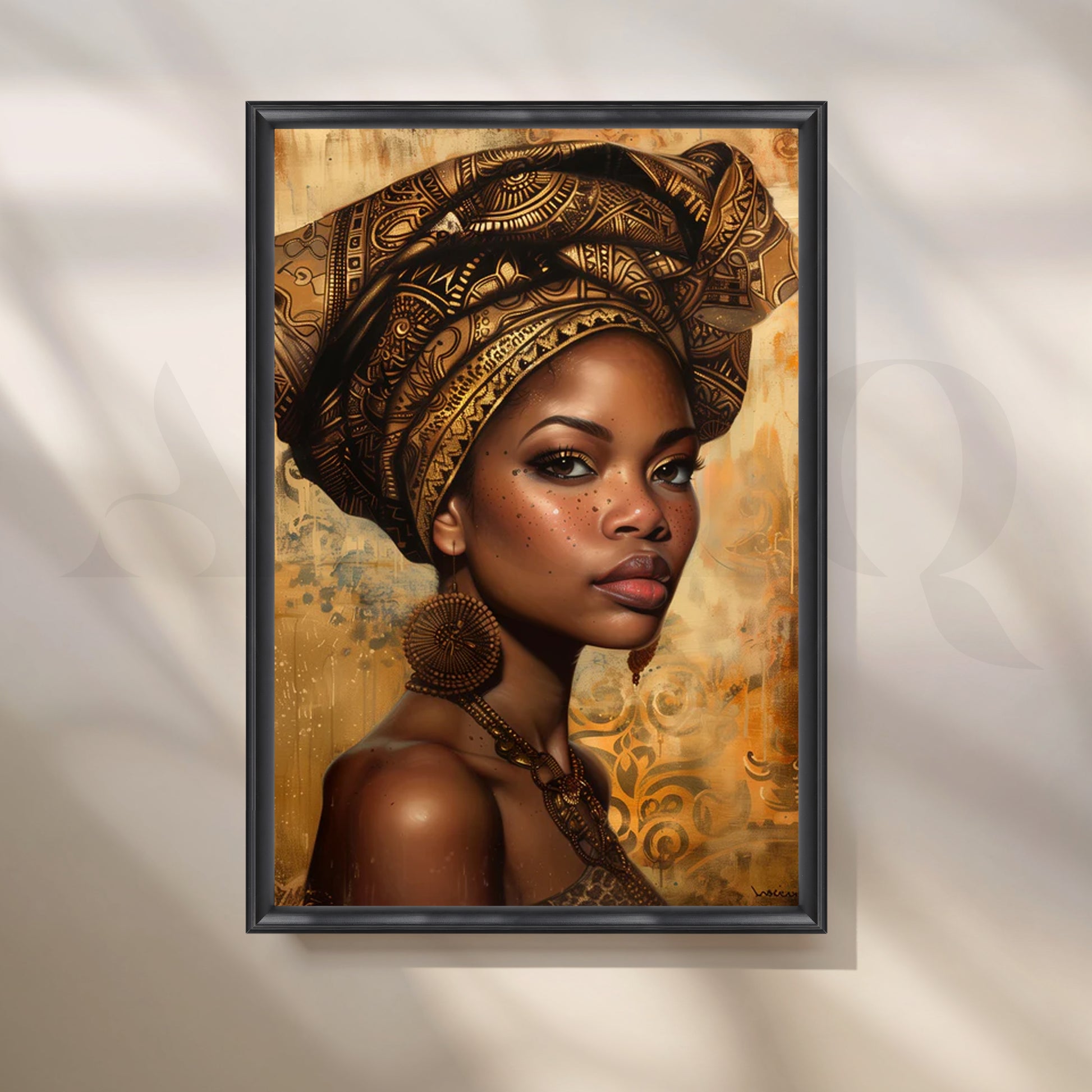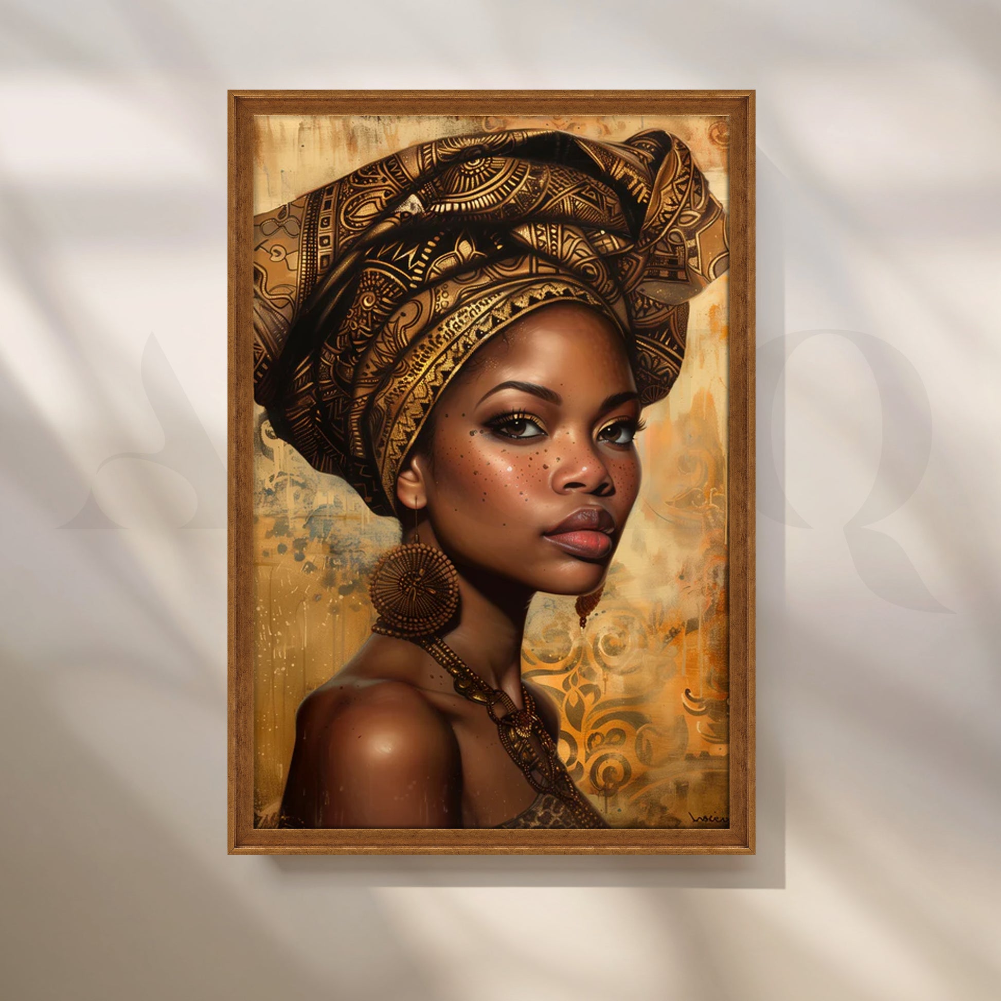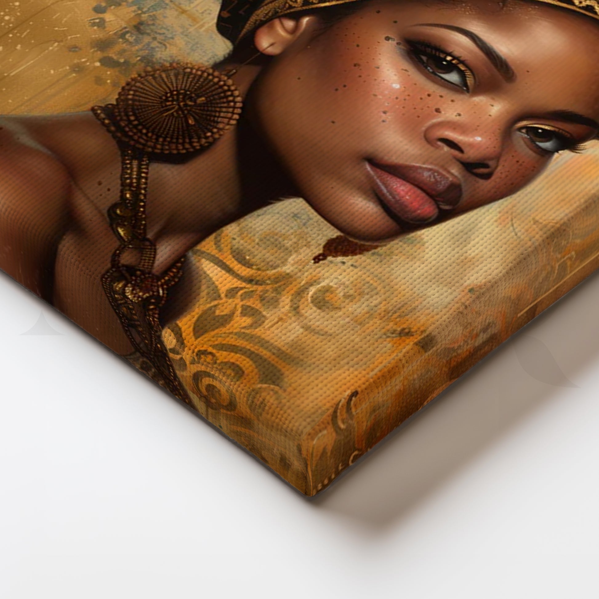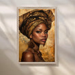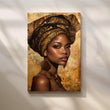 Radiant portrait canvas featuring a regal woman in an ornate golden headwrap on a warm, textured background—perfect modern wall art for a sophisticated living room. Rich amber, espresso, and bronze tones add luxury while the detailed patterning evokes Afrocentric décor. Ideal as large living room art, gallery-wall centerpiece, or statement portrait canvas painting for contemporary and boho interiors.