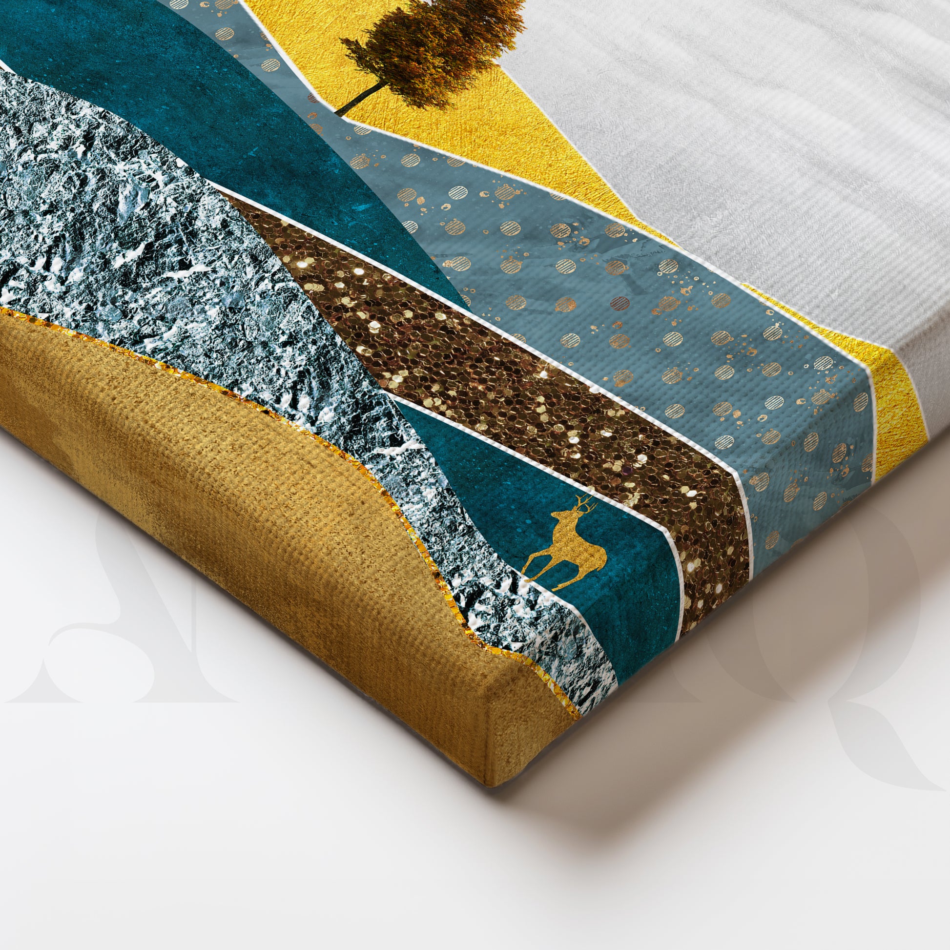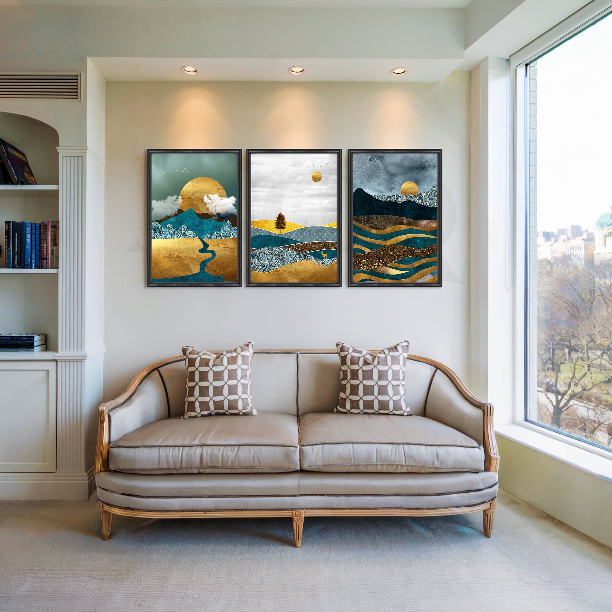 Anciq ‘Golden Horizon Landscapes’ Gallery Wall showcases dreamy layered hills, glowing suns, and flowing rivers in teal and gold textures. Perfect for living rooms, dining spaces, hallways, or office reception areas, this 3-piece abstract landscape set adds luxury and calm to modern interiors. Ideal for contemporary landscape wall art and statement décor.