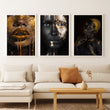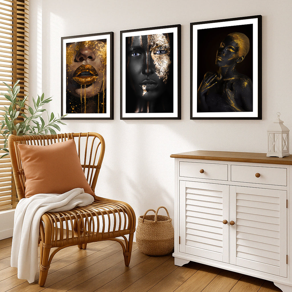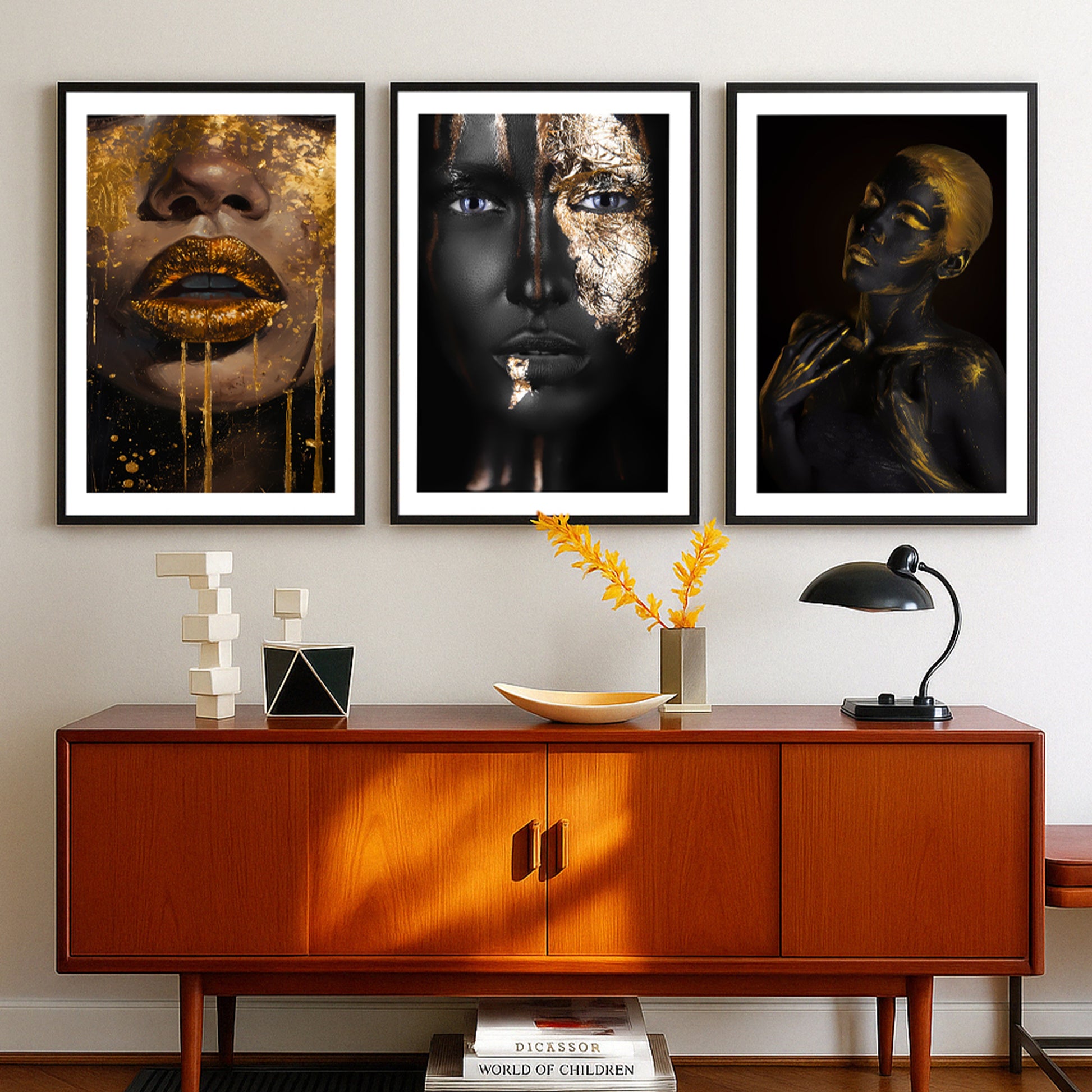 Golden Noir Glam Gallery Walls spotlight bold female portraits in black and gold, exuding power and elegance. These Gallery walls elevate interiors with a luxe, dramatic vibe—perfect for hallways, lounges, or statement corners.