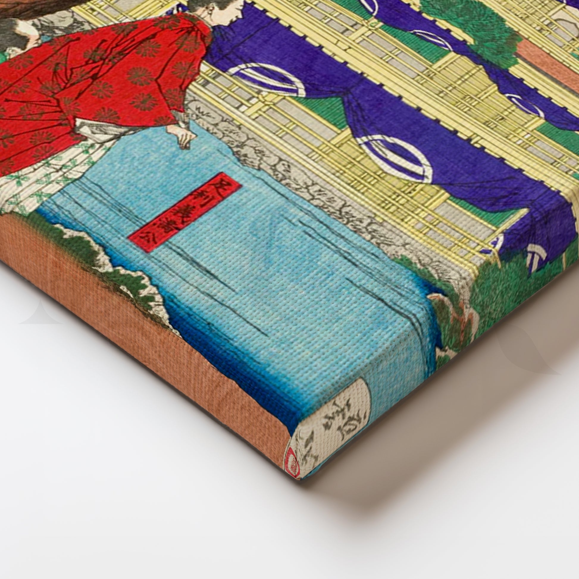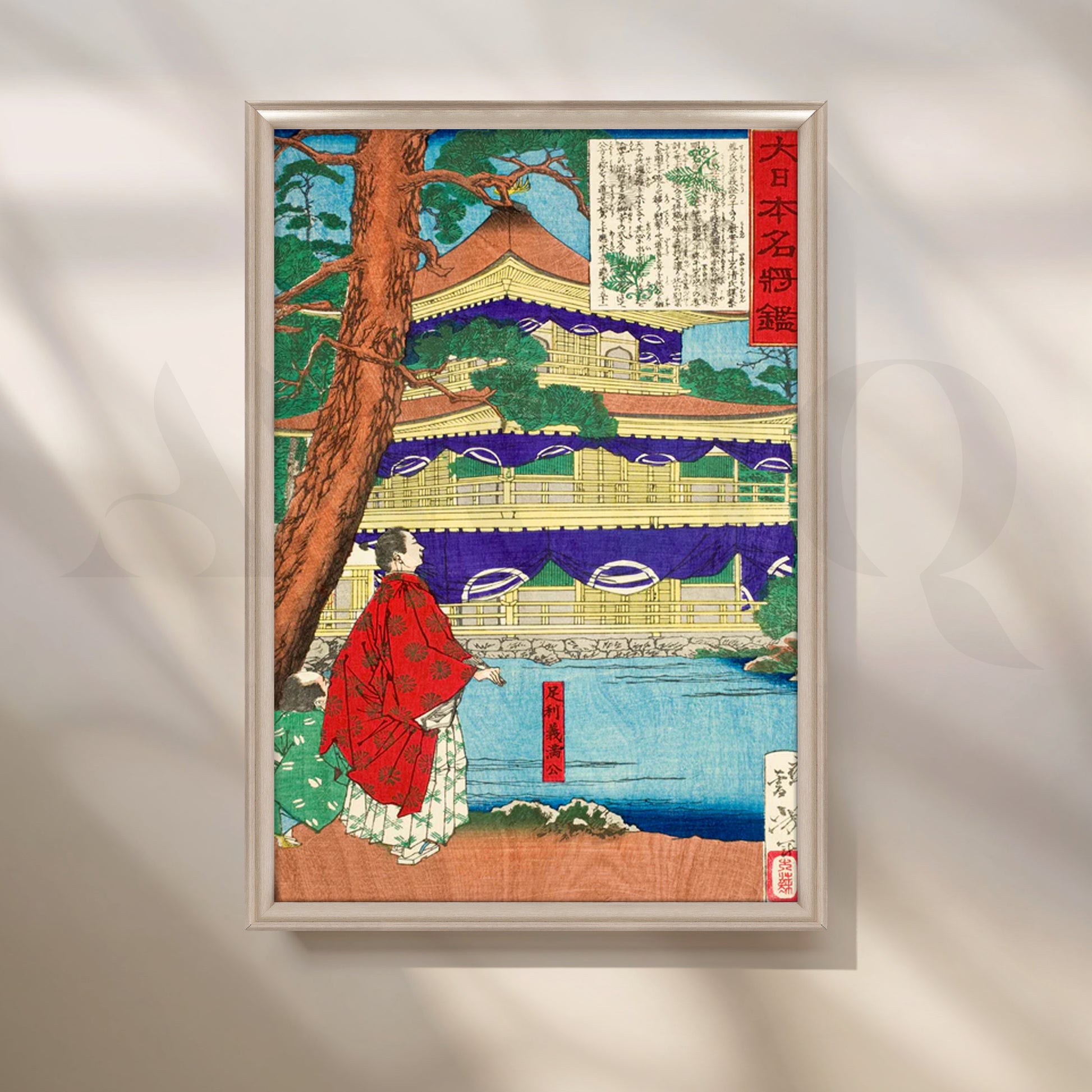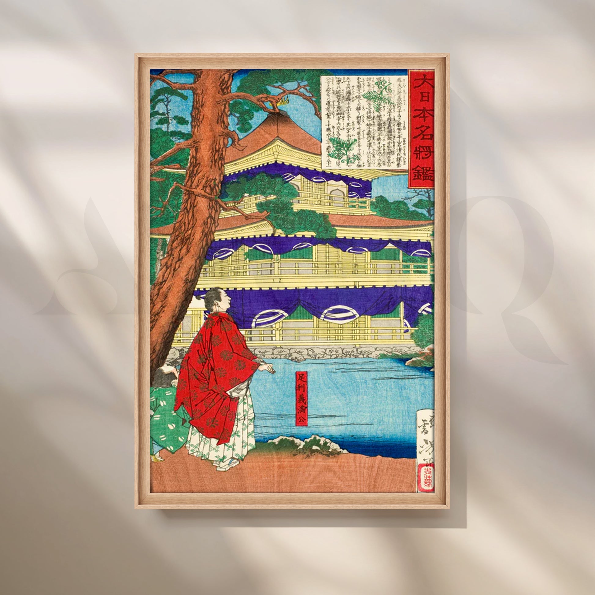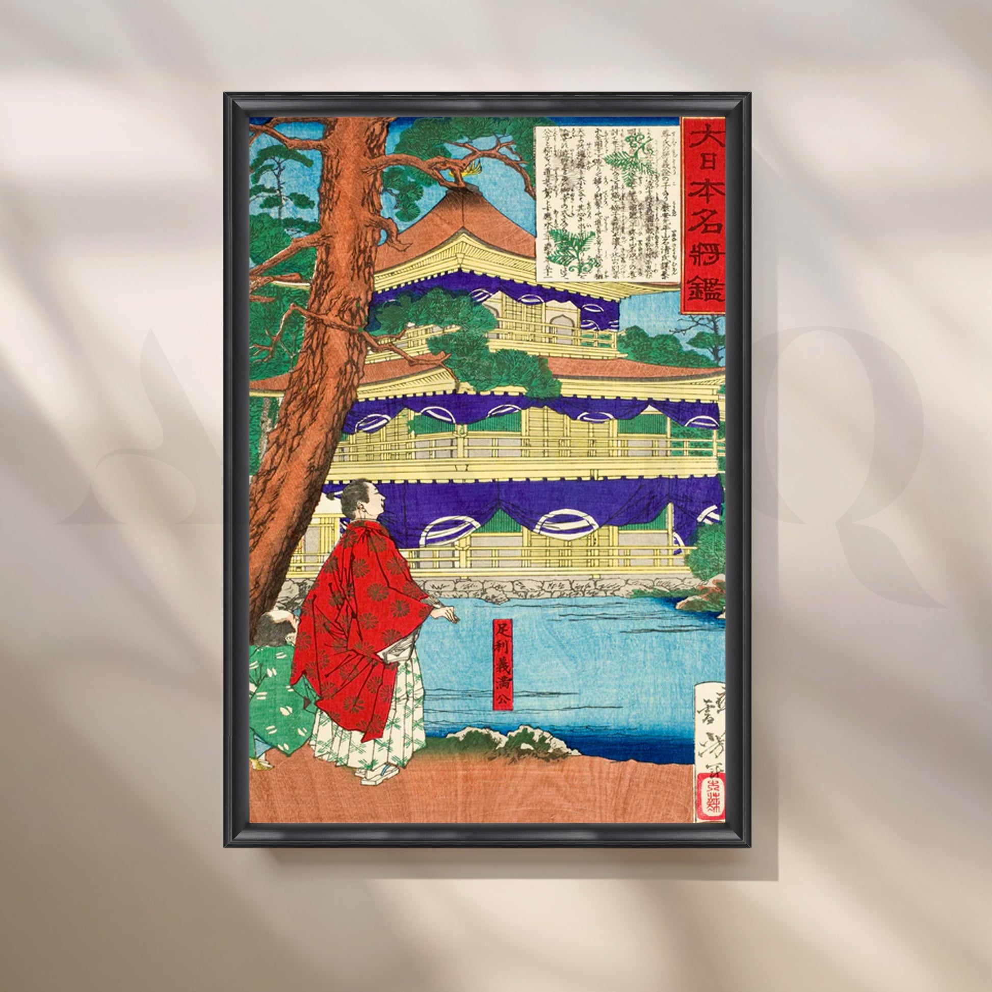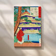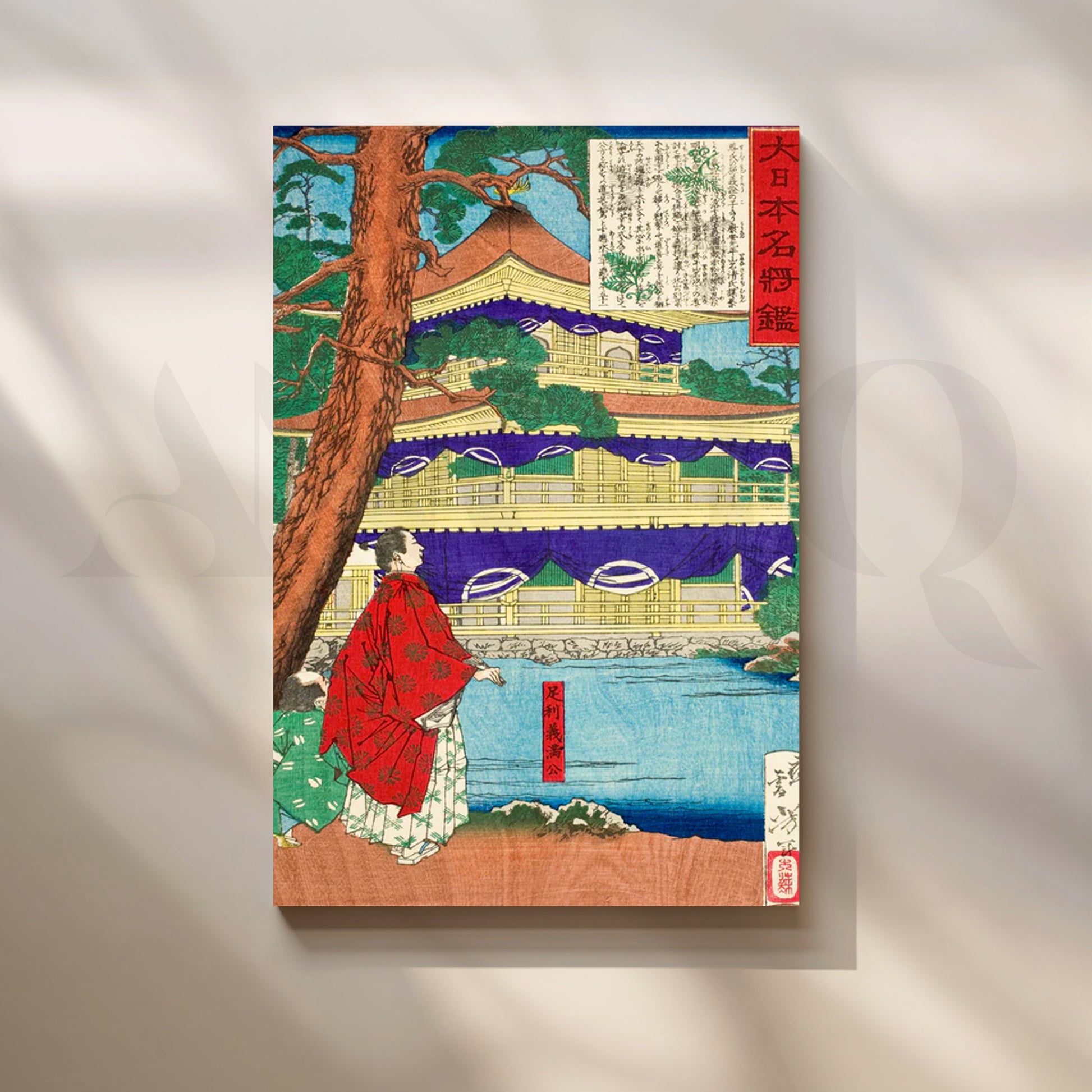 A serene Japanese landscape rendered in classic ukiyo-e style, this canvas features a golden tiered temple framed by a cinnamon pine, indigo drapery, and tranquil blue water with a robed figure in red—rich details that bring heritage elegance to modern wall art. The vivid palette of gold, purple, teal, and vermilion adds refined color without overpowering your space, perfect for a zen décor refresh. Ideal as a statement Japanese wall art print above a sofa, console, or credenza, this temple canvas painting suits living rooms, hallways, and home offices. Great for shoppers seeking vintage Japanese poster, Kyoto temple art, landscape canvas, and large living room art.