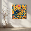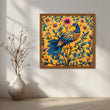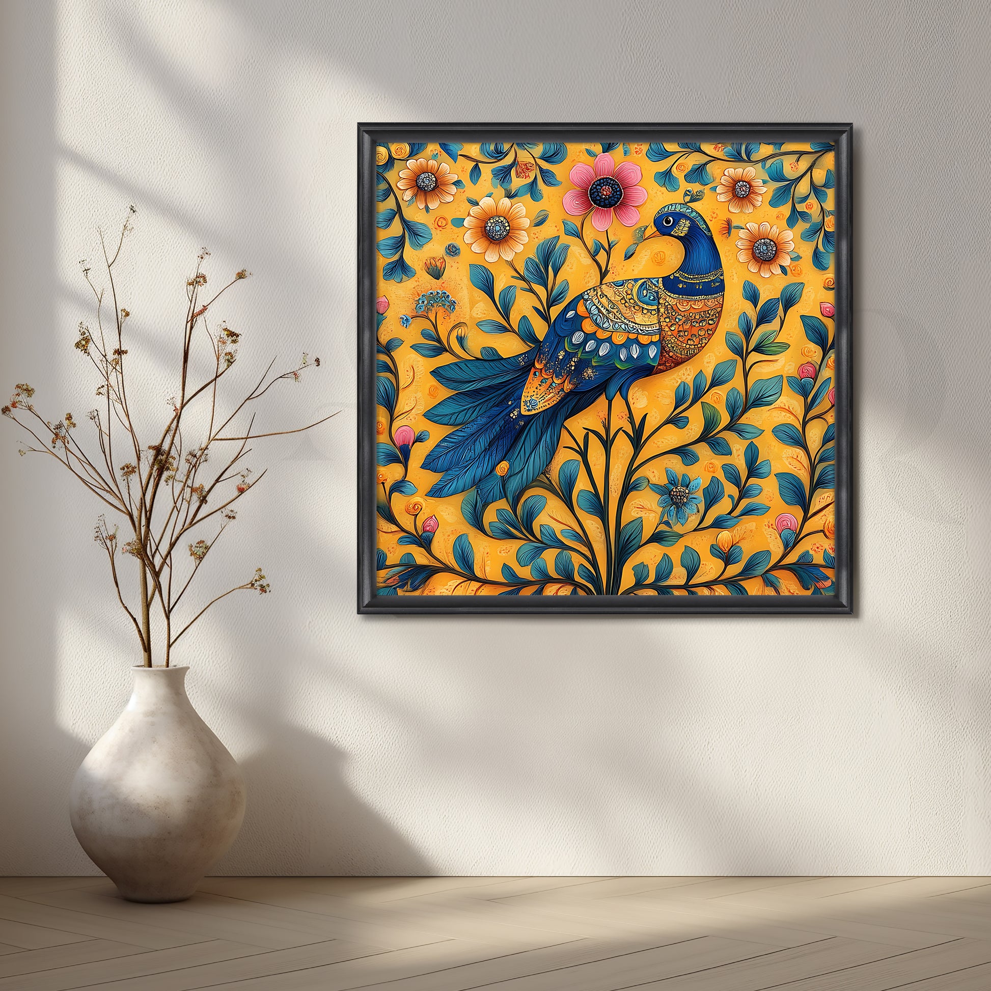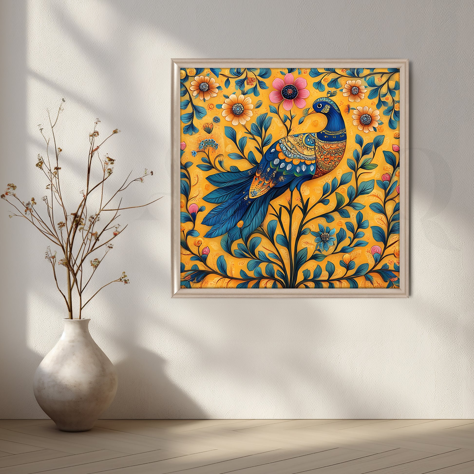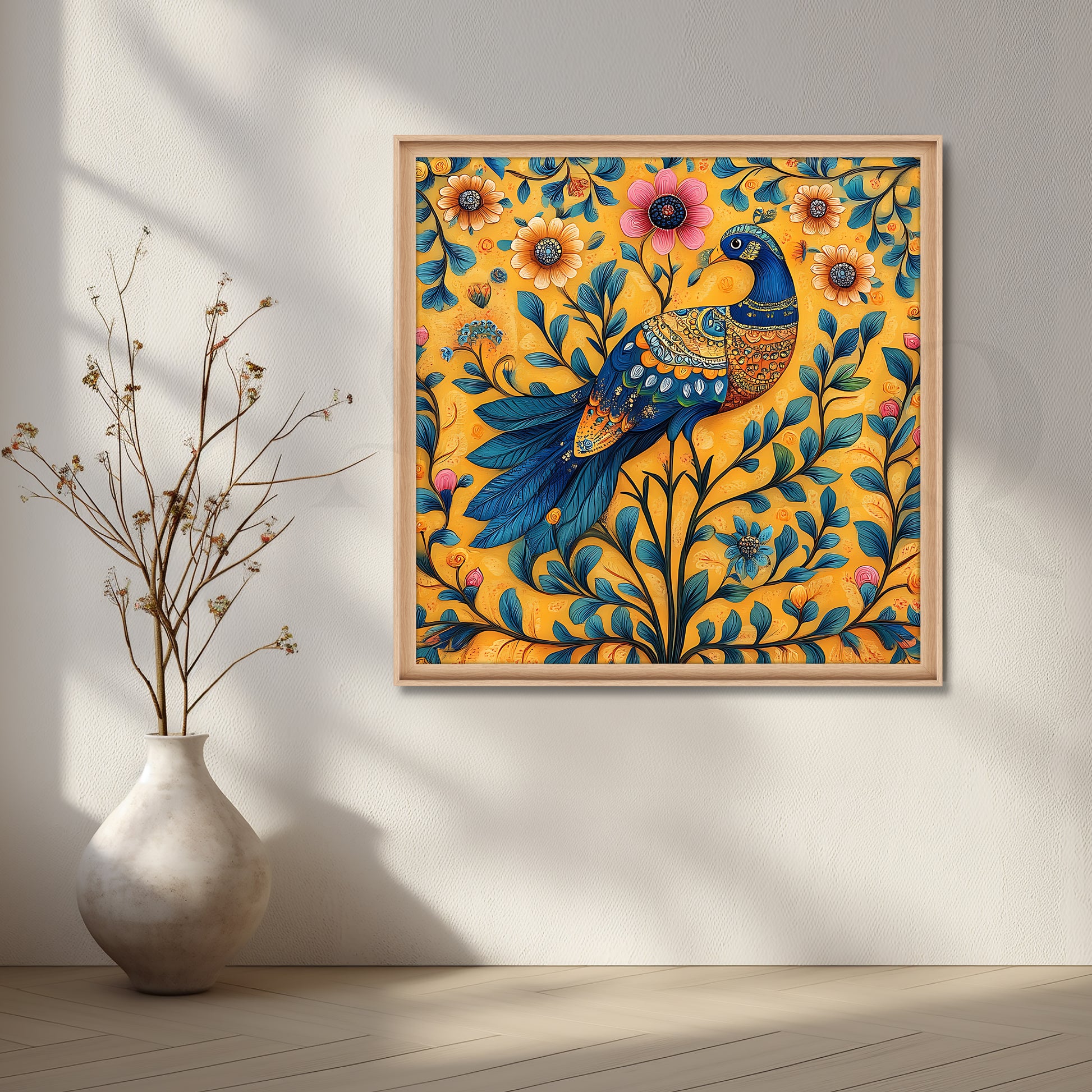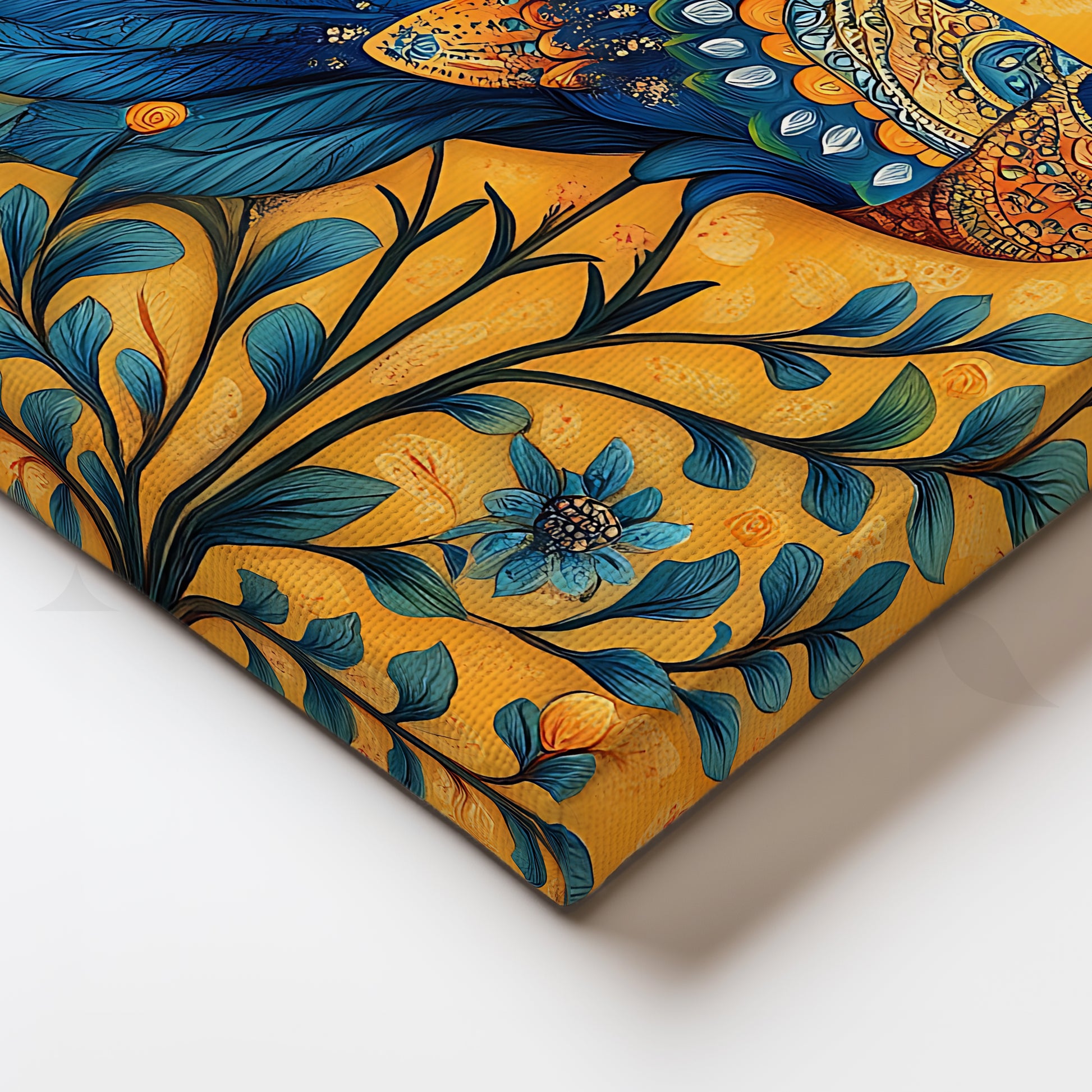 This Golden Peacock Garden folk canvas painting shows an ornate peacock nestled in lush teal leaves and colourful blossoms on a rich yellow ground. A striking piece of Indian-inspired wall art, it suits living rooms, hallways or festive décor themes that need vibrant colour and pattern.