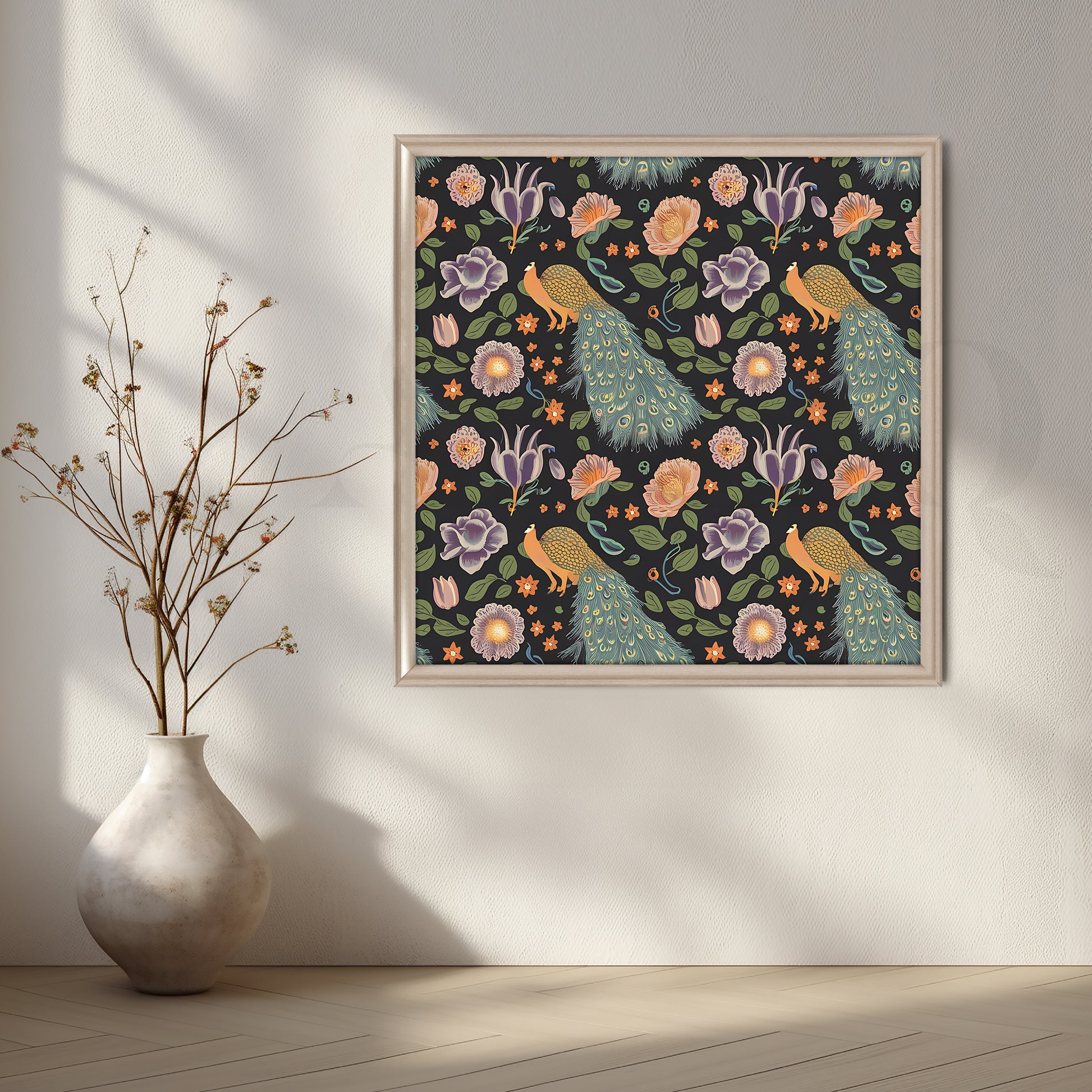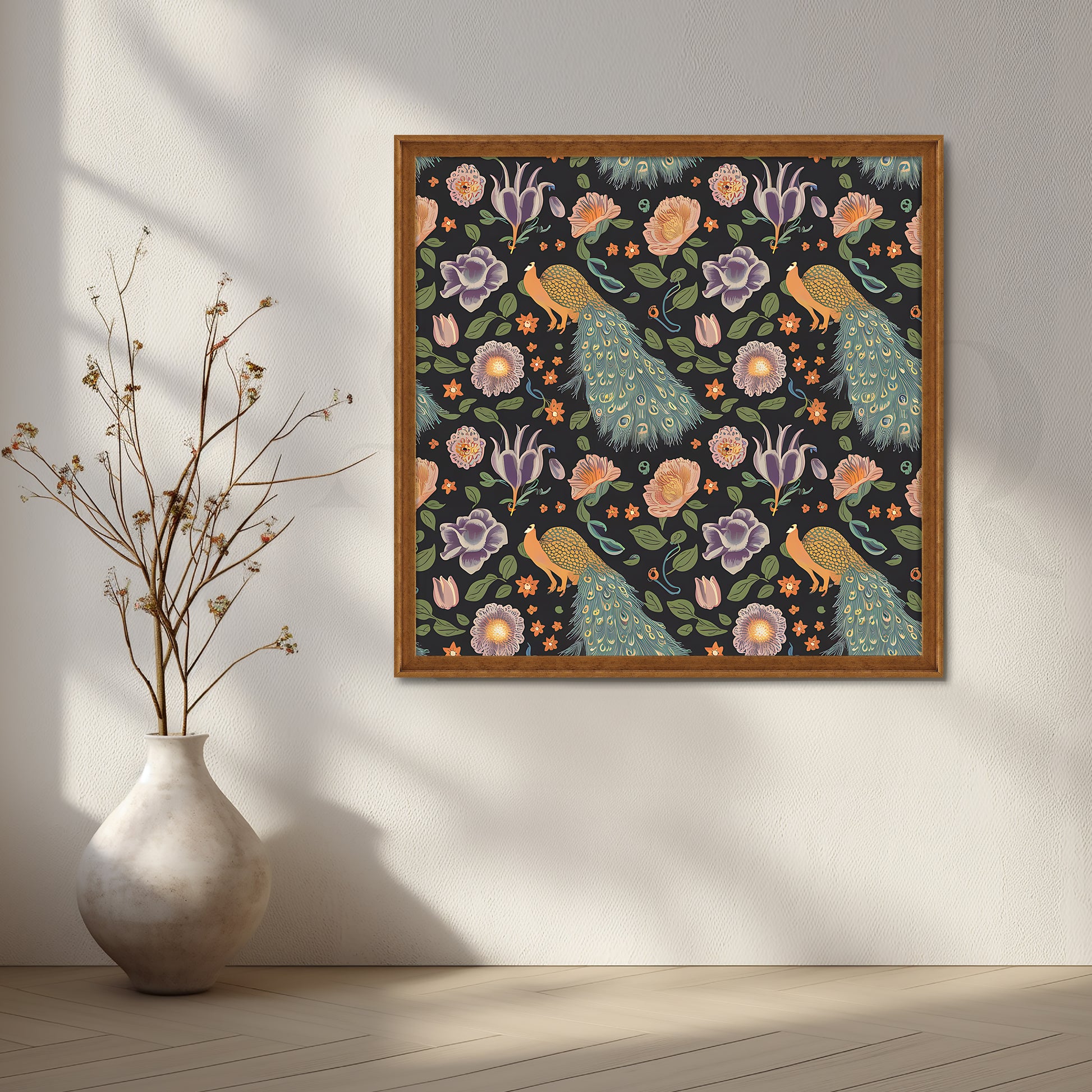 Anciq ‘Golden Peacocks’ Canvas Artwork combines elegance and vibrancy through golden peacocks set against a dark floral backdrop, ideal for adding warmth and sophistication to living rooms. Keywords: peacock art, floral pattern canvas, luxury home decor, dark wall painting, heritage peacock design.
