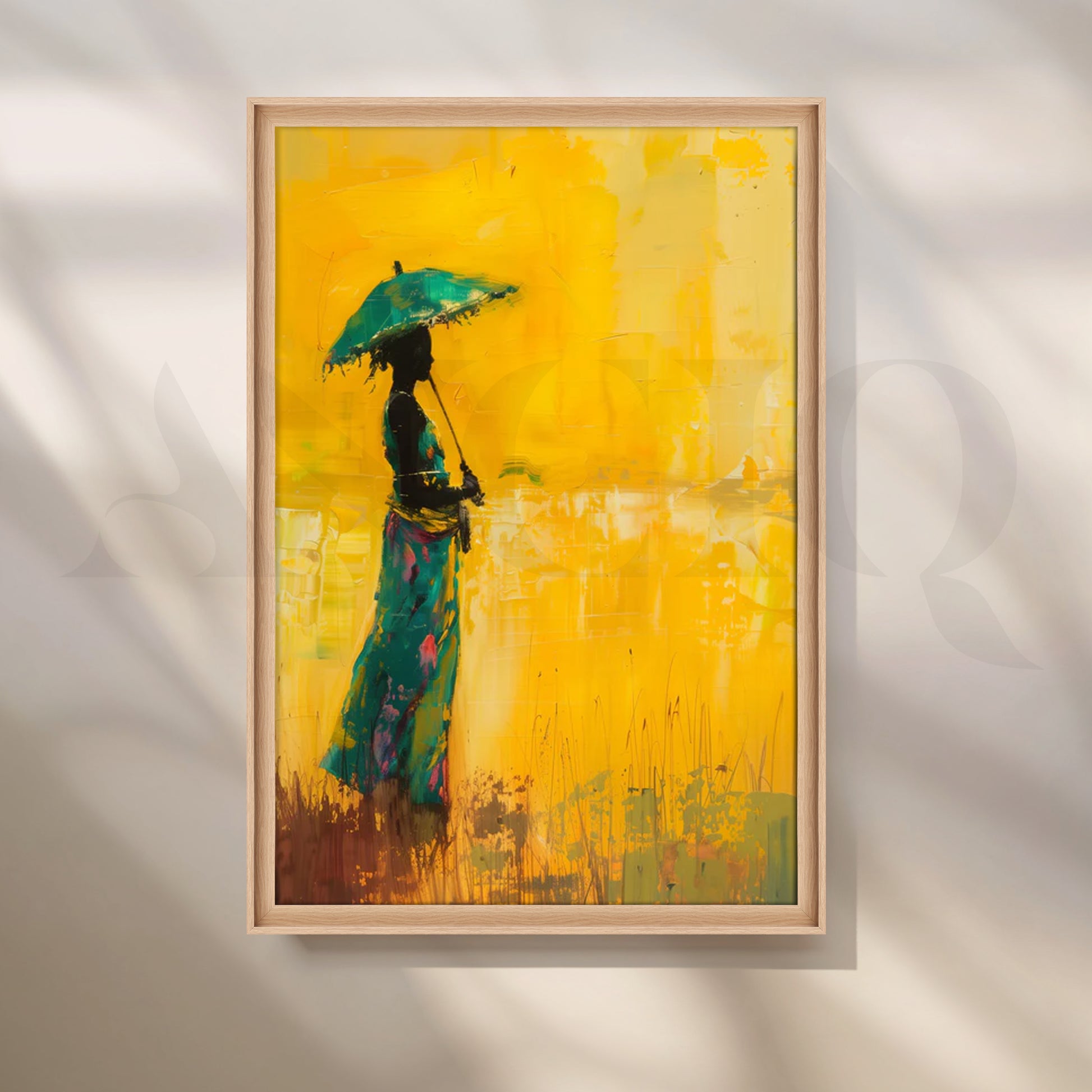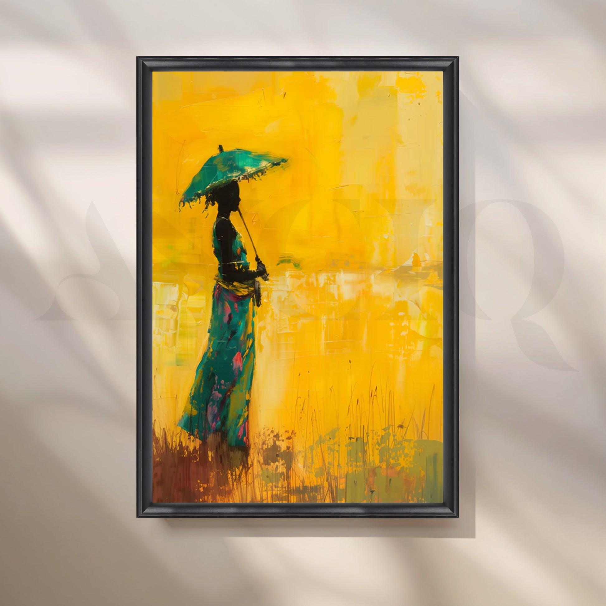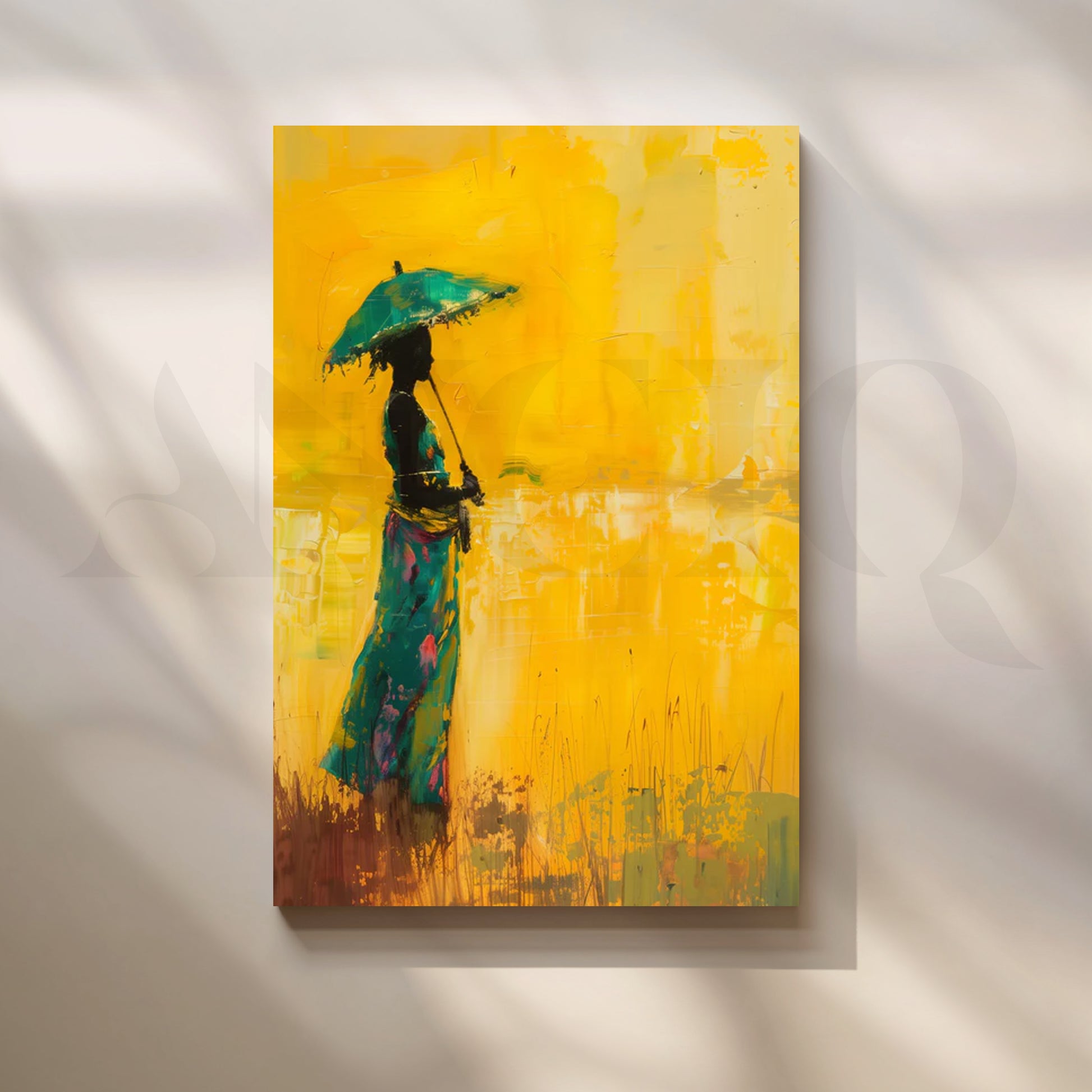 “Sunlit Stroll” captures a serene silhouette beneath a teal umbrella, awash in golden yellow light and soft painterly textures. The calm, minimalist composition makes striking entryway or hallway wall décor while complementing modern, mid-century, or boho interiors. This abstract canvas painting adds warmth and movement to small spaces, offices, or reading nooks—perfect as large wall art that instantly brightens your home with cheerful, contemporary style.