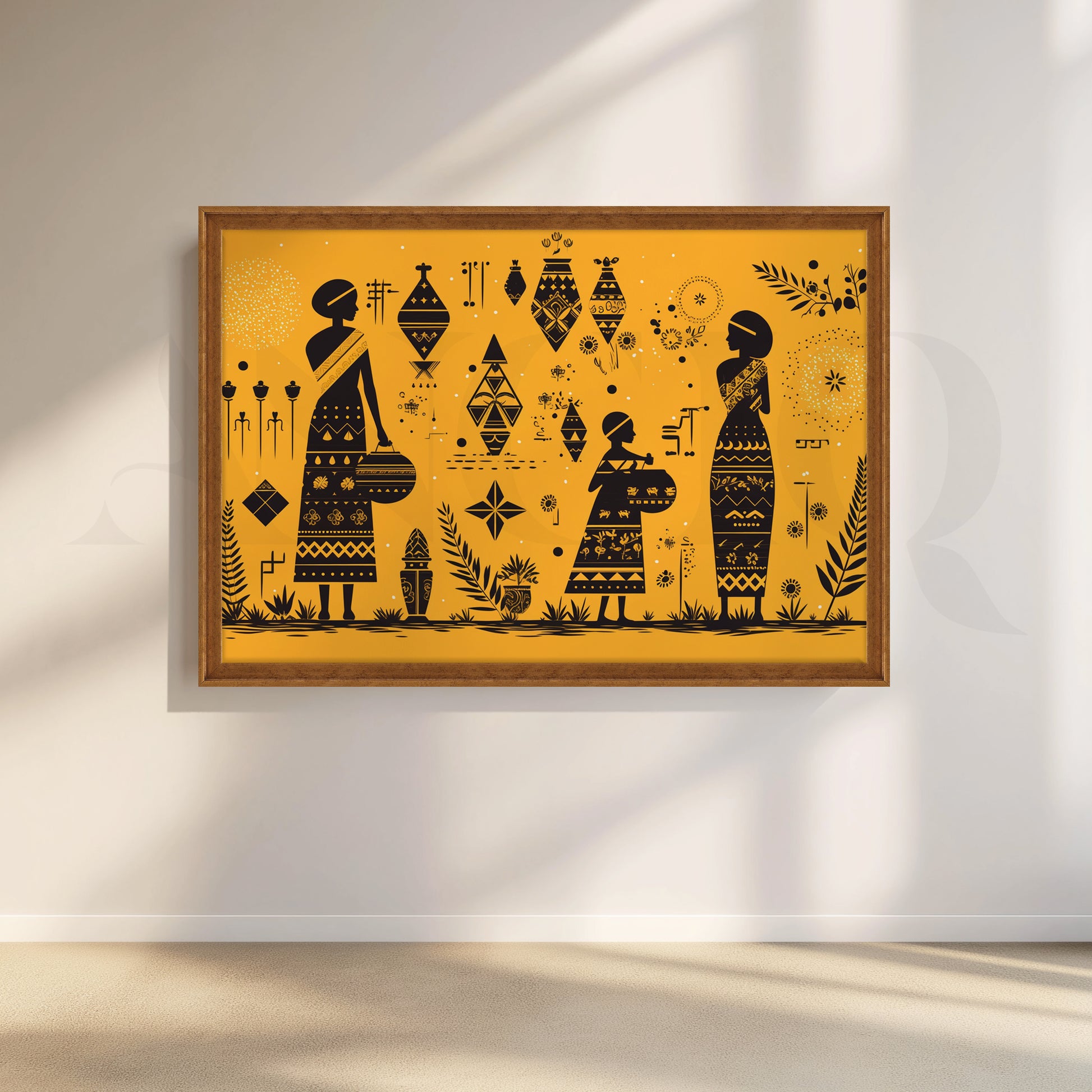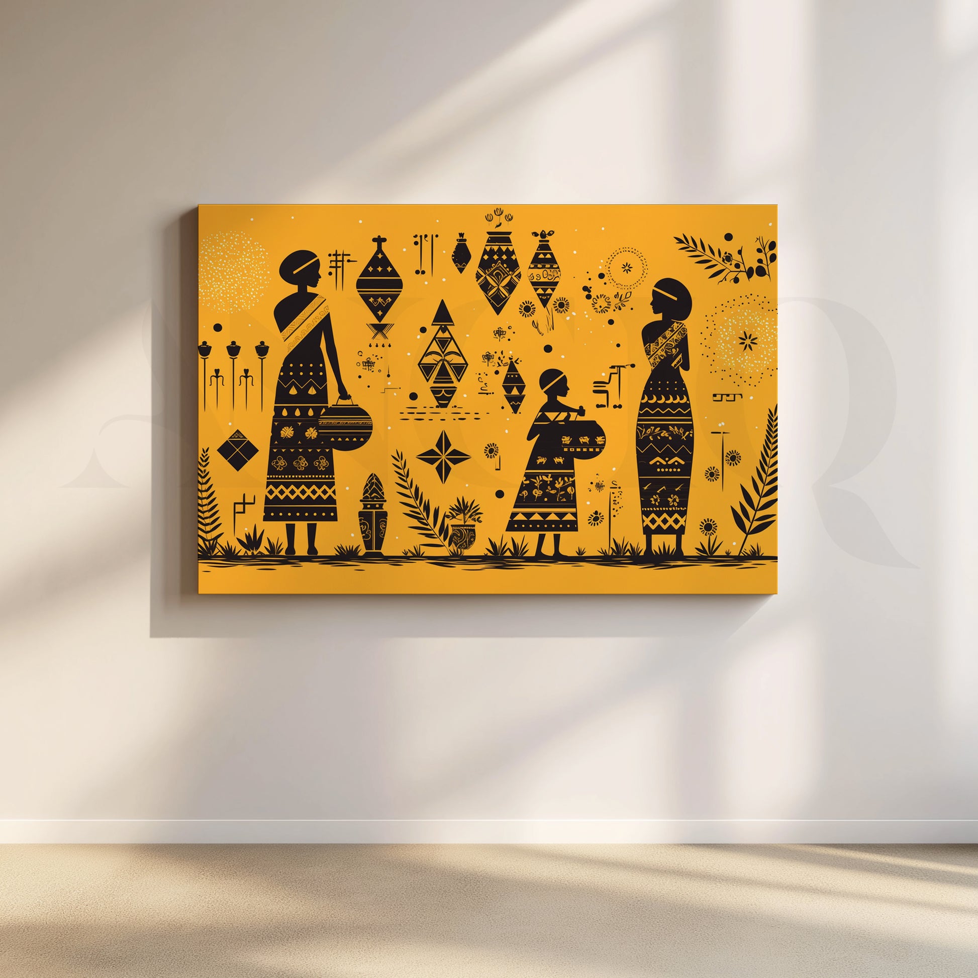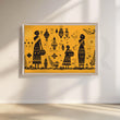 This mustard-yellow Anciq artwork depicts tribal women carrying baskets amidst geometric motifs and flora, radiating warmth and cultural richness. Ideal for living rooms or entryways. Keywords: tribal women painting, mustard wall art, boho ethnic canvas, cultural folk artwork, Indian modern decor.