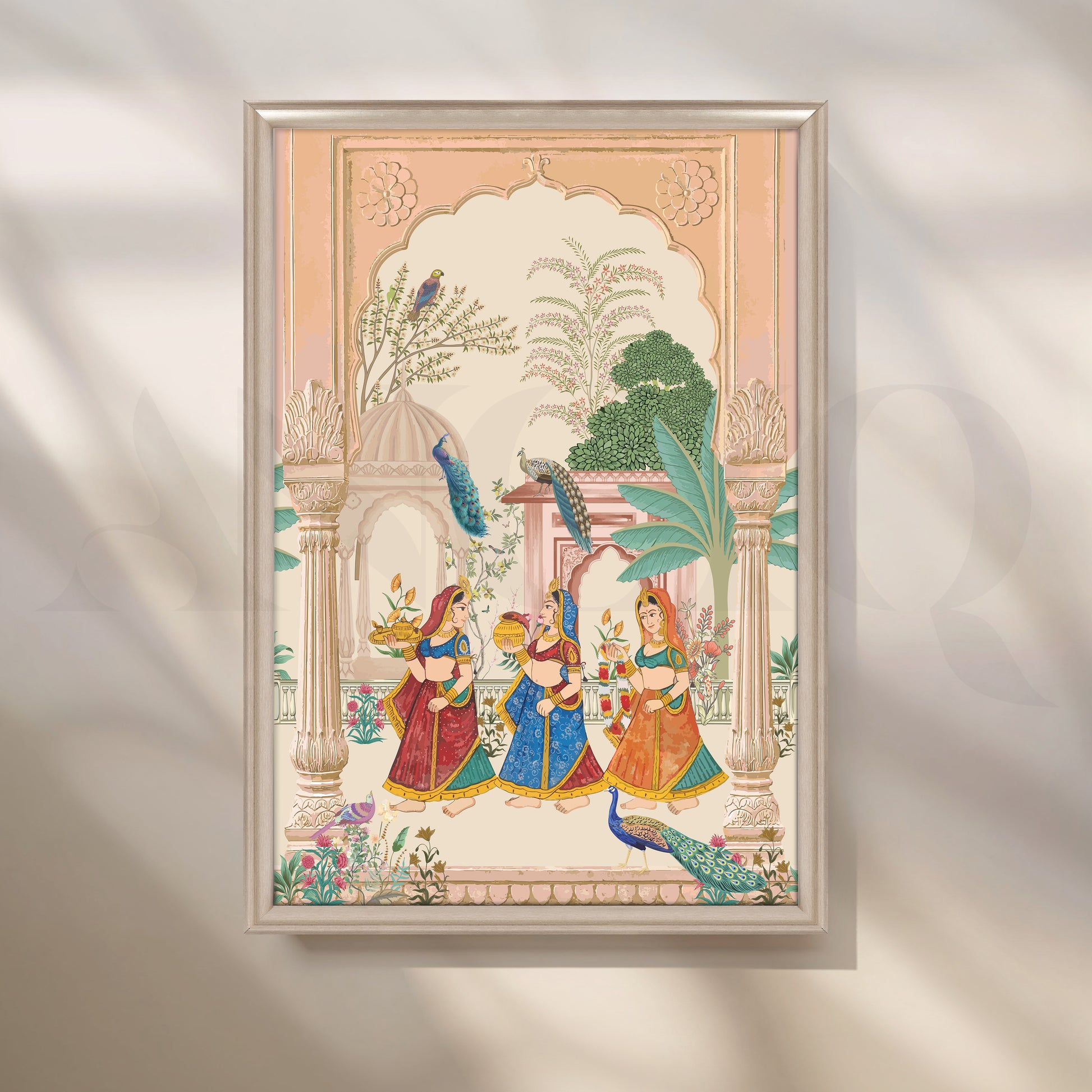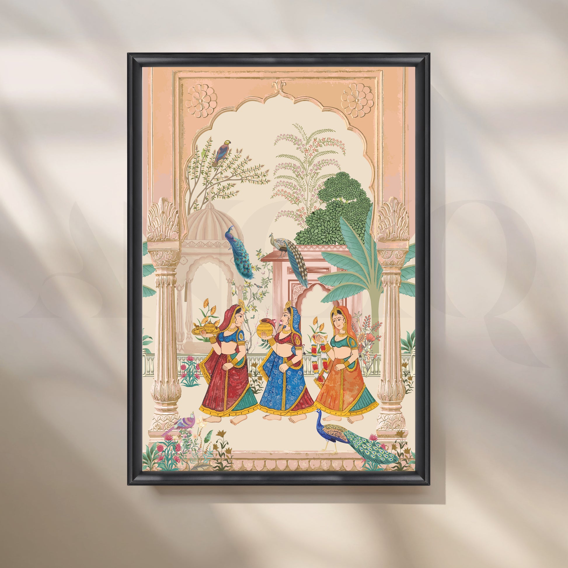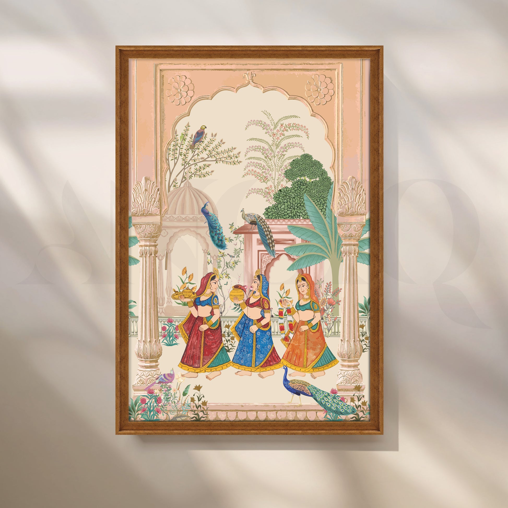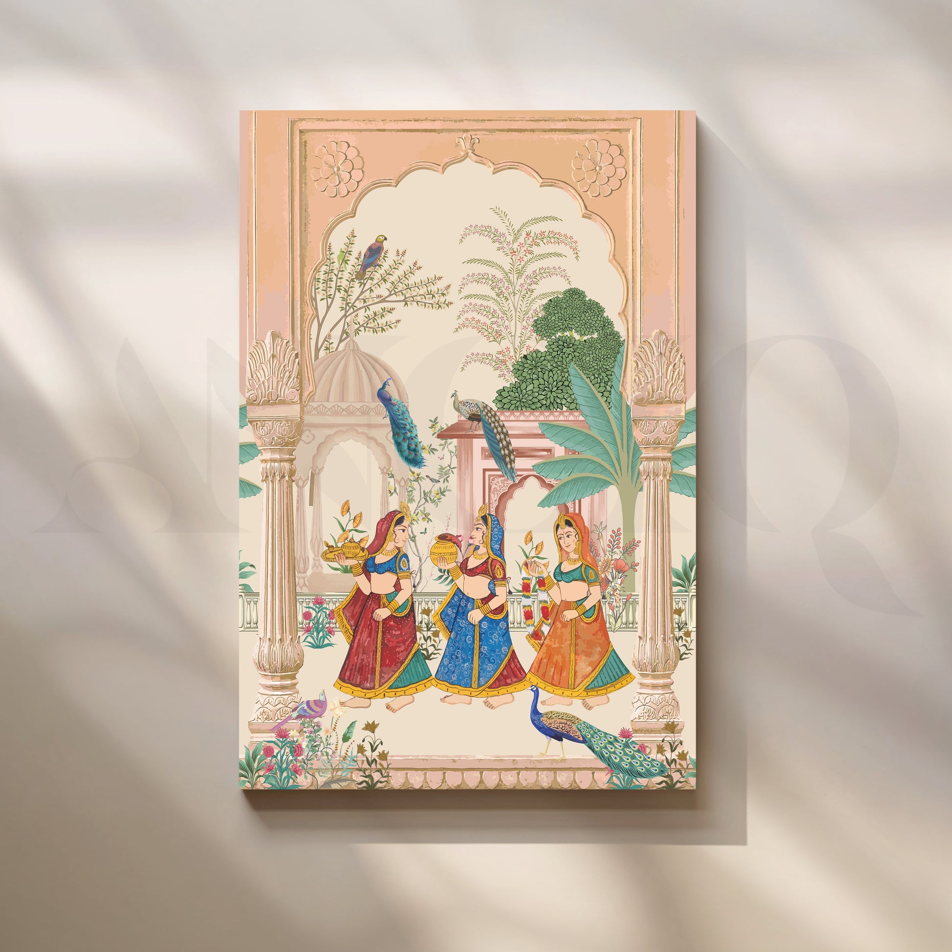This vibrant canvas print depicts a lively scene of three women adorned in traditional attire, carrying offerings as they walk through an ornate courtyard. Surrounded by lush greenery and majestic peacocks, the artwork captures the essence of cultural tradition and the beauty of communal celebration. A delightful addition for those who cherish heritage and the artistry of festive moments.