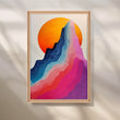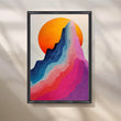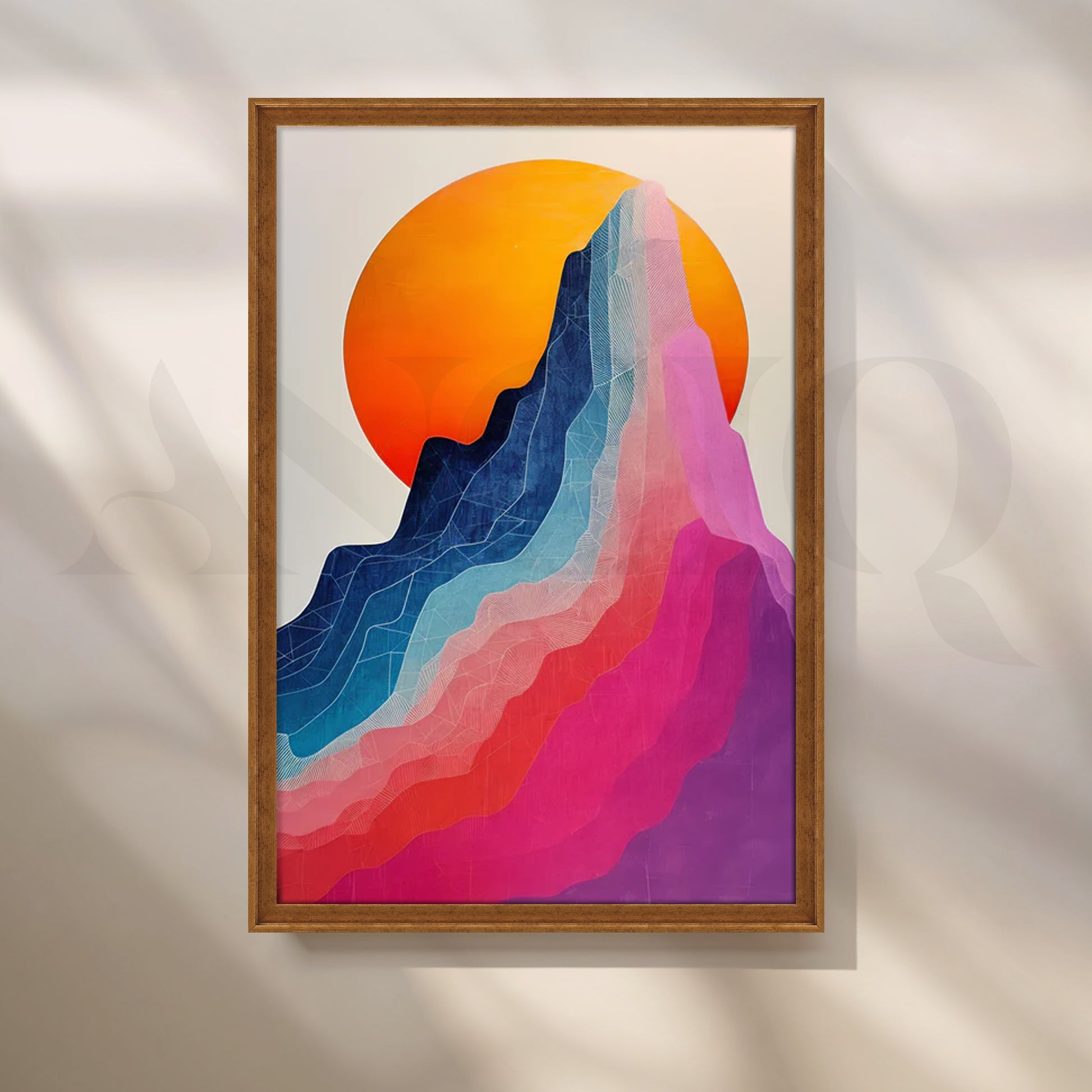 The Gradient Peaks Wall Painting captures a breathtaking abstract mountain range bathed in vibrant layers of pink, blue, and purple tones, set against a bold orange sun. This captivating composition brings an energetic and modern aesthetic to your space, making it a striking centerpiece for contemporary decor.
