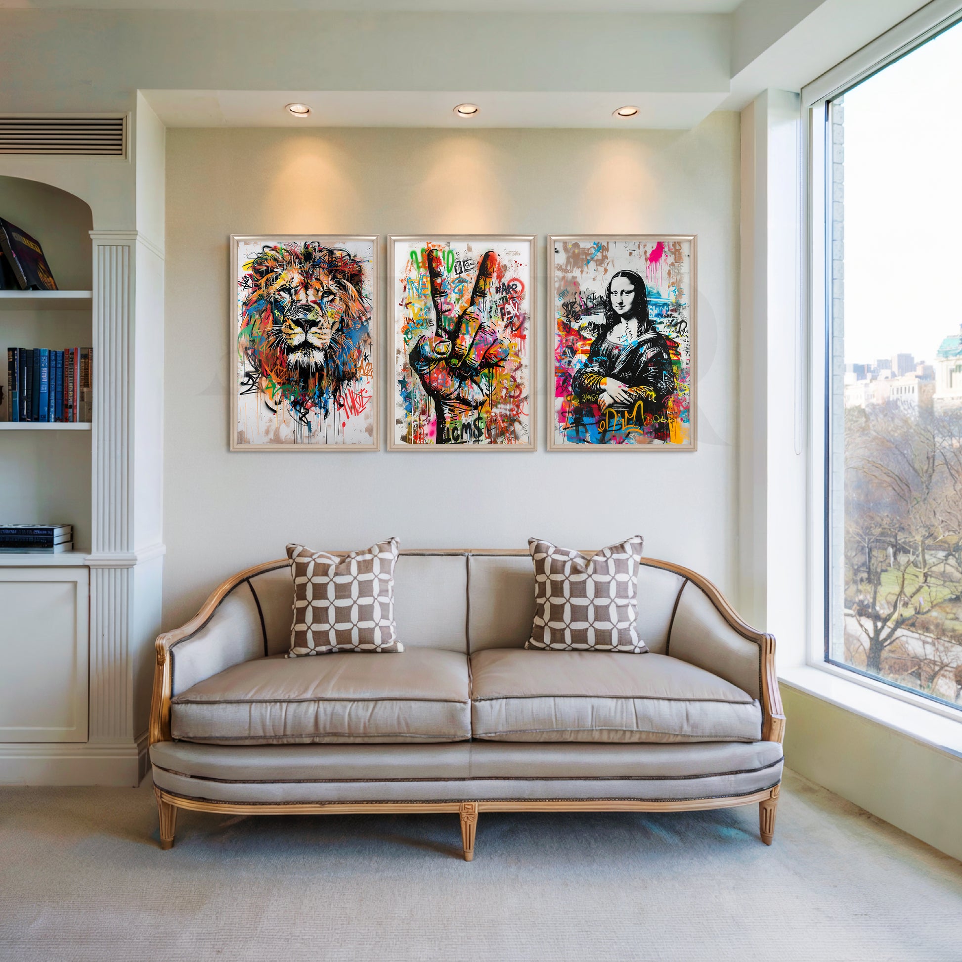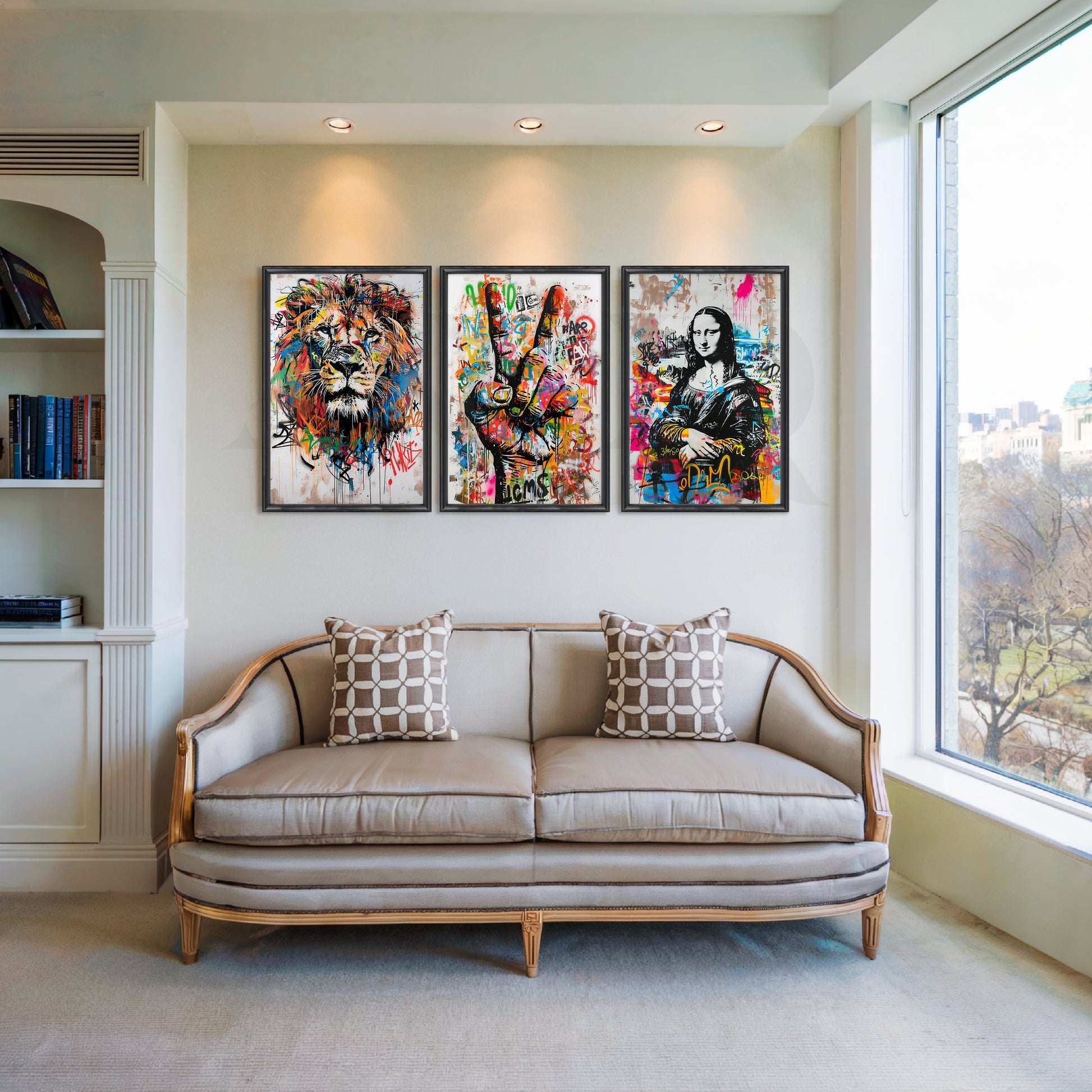 Anciq ‘Graffiti Icons’ Gallery Wall fuses street-art energy with iconic imagery—a roaring lion, peace sign hand, and modern Mona Lisa. Perfect for living rooms, lounges, game rooms, or creative studios, this 3-piece pop art set instantly becomes a conversation starter. Ideal for urban wall décor and colourful contemporary home interiors.