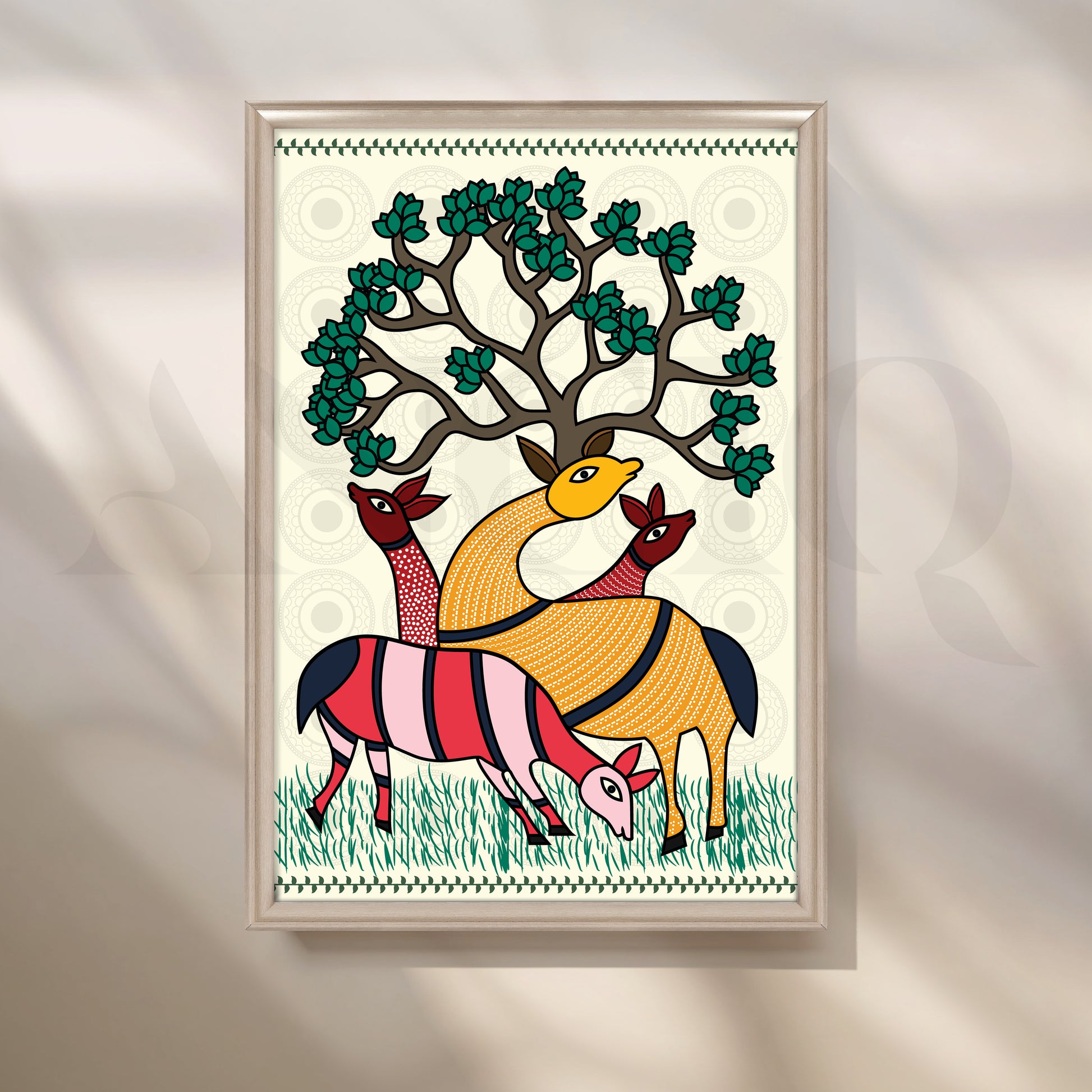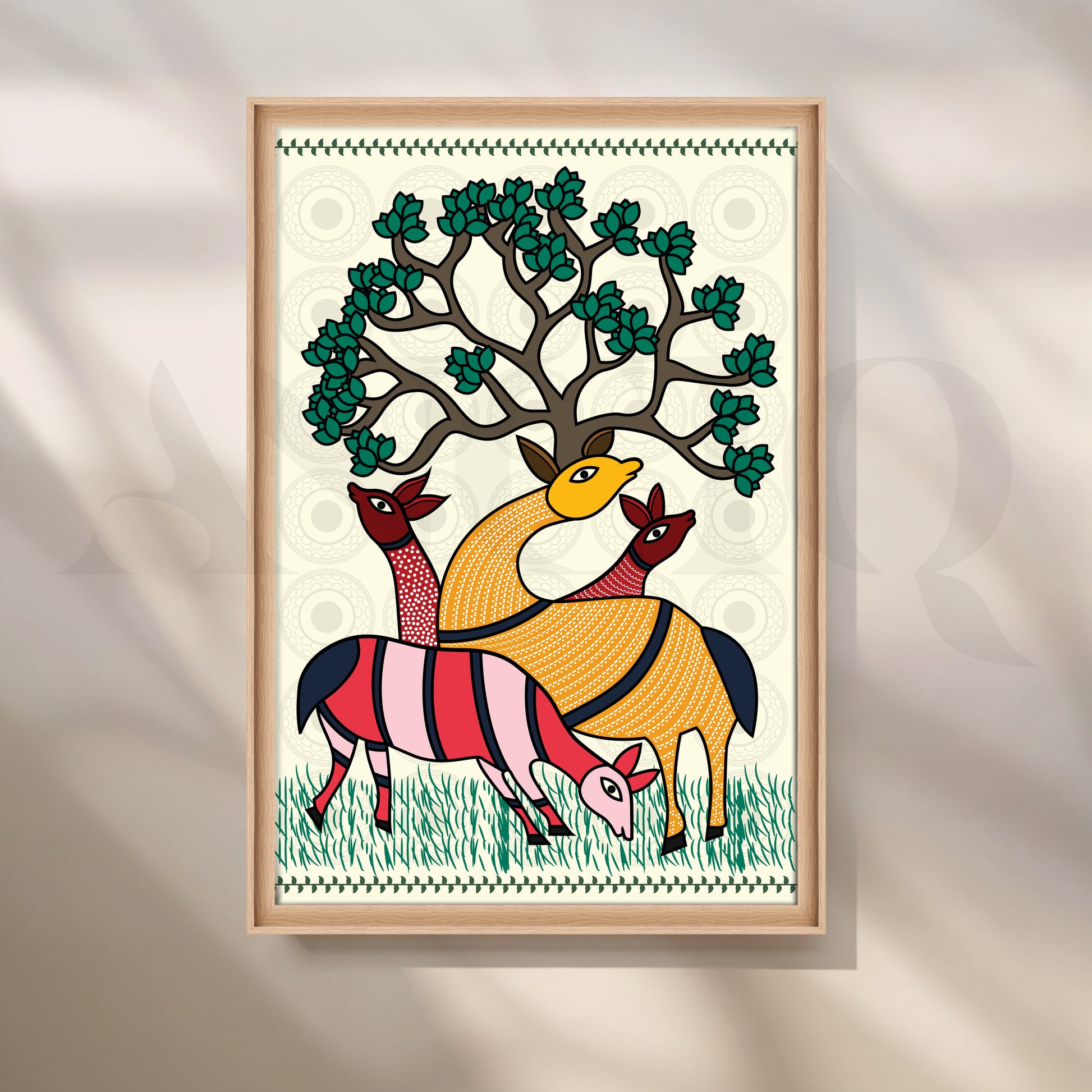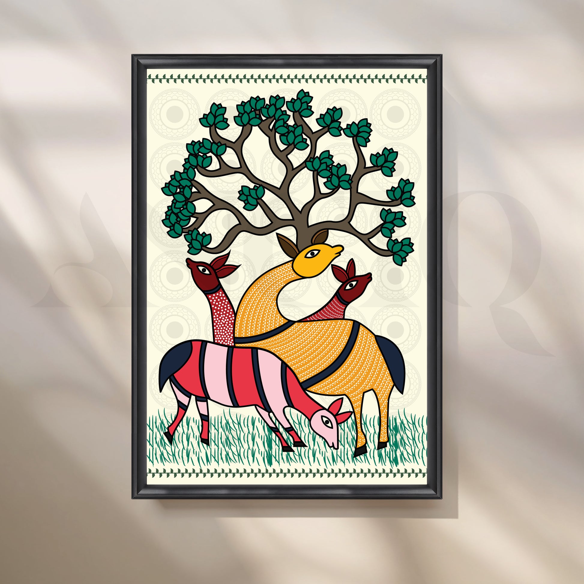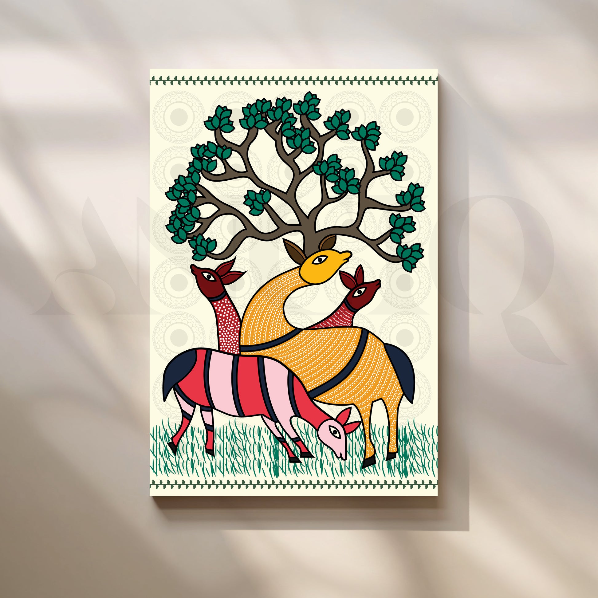 Inspired by Indian folk and Gond art, Anciq’s “Grazing Harmony” canvas artwork portrays three stylised deer beneath a lush flowering tree, rendered in warm yellows, reds and blues with rhythmic dotted patterns. The repeating circular motifs in the background create a sense of movement and unity, making this piece perfect for dining room walls, hallways, staircase galleries and cosy corners.