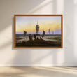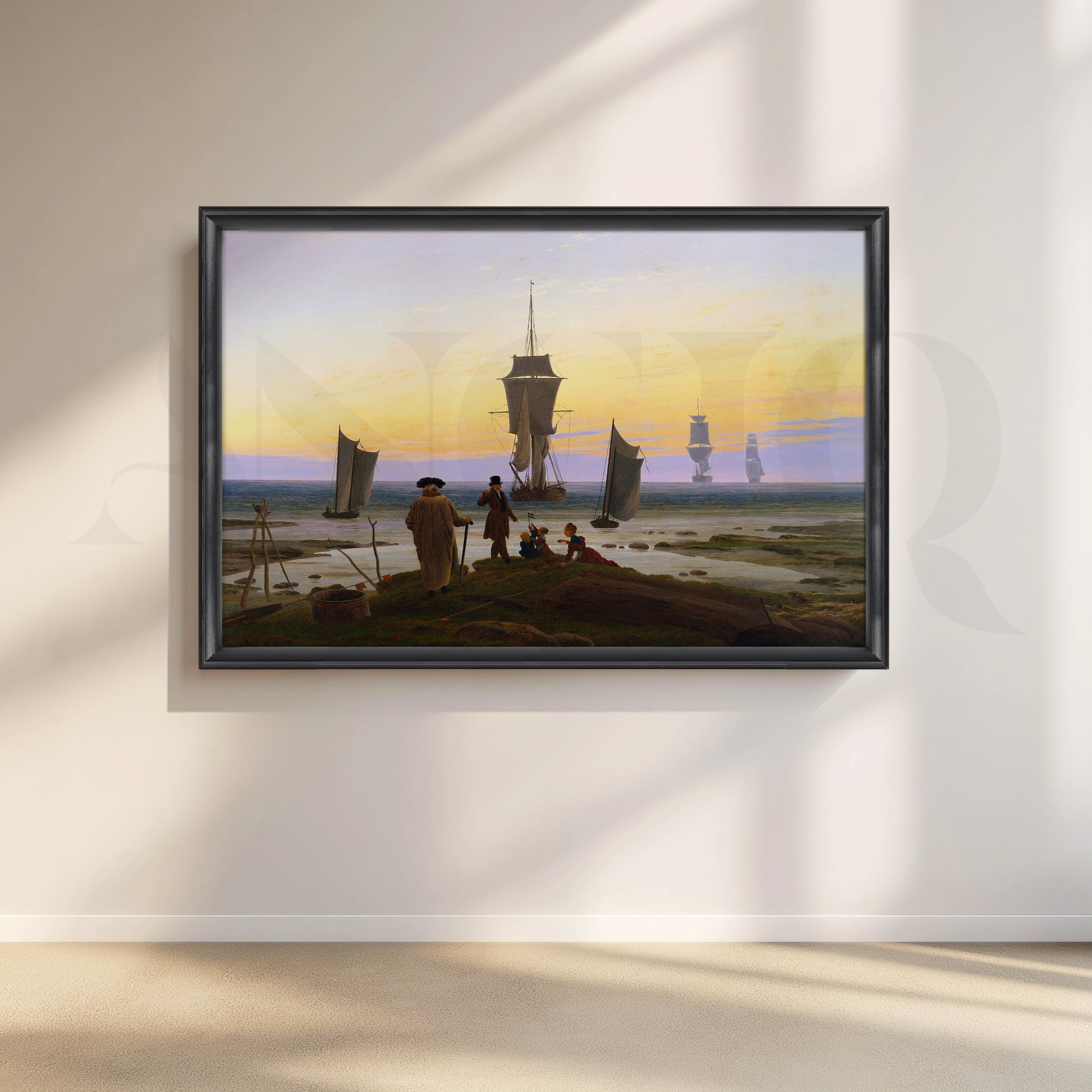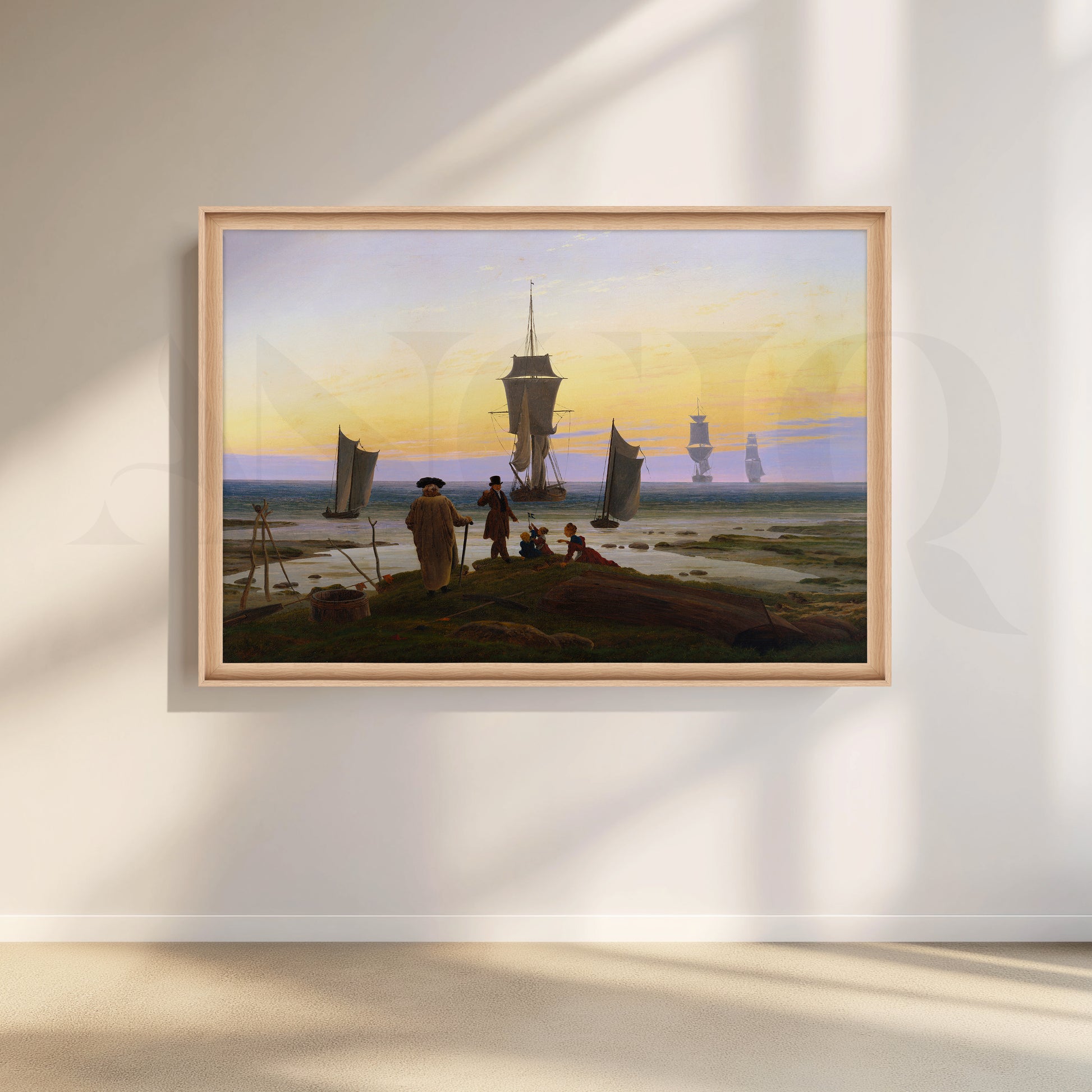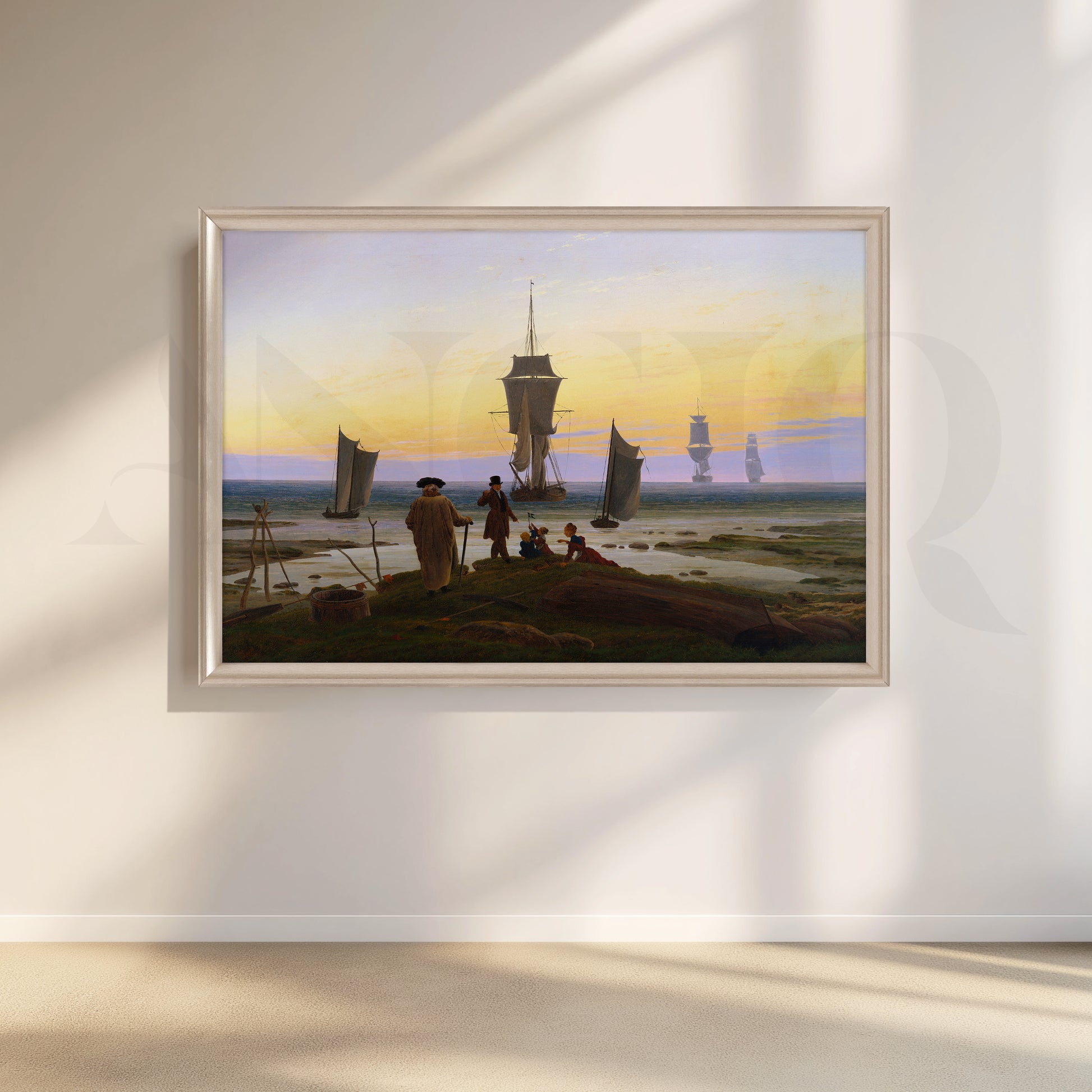 A romantic coastal scene with tall-masted ships at low tide and a small group on the shore beneath a golden-lavender sky. The warm dusk glow adds calm, nostalgic charm—perfect large wall art for living room or study. Keywords: harbor sunset wall art, romantic seascape canvas, sailboat painting, coastal landscape print, vintage European art, shoreline artwork, large canvas for living room décor.