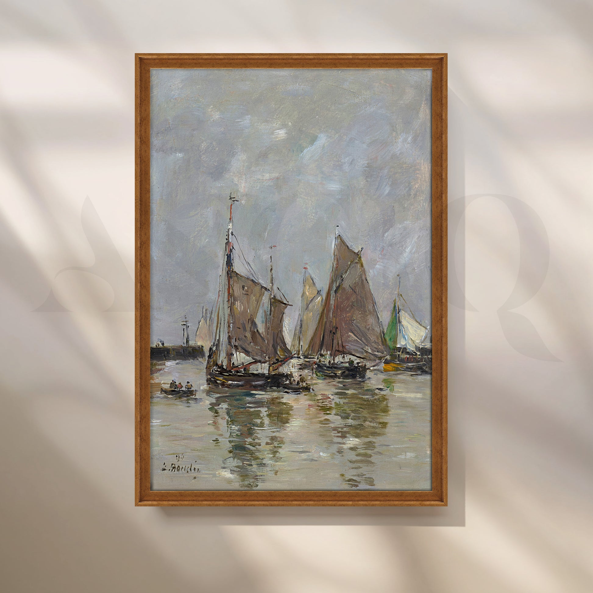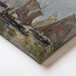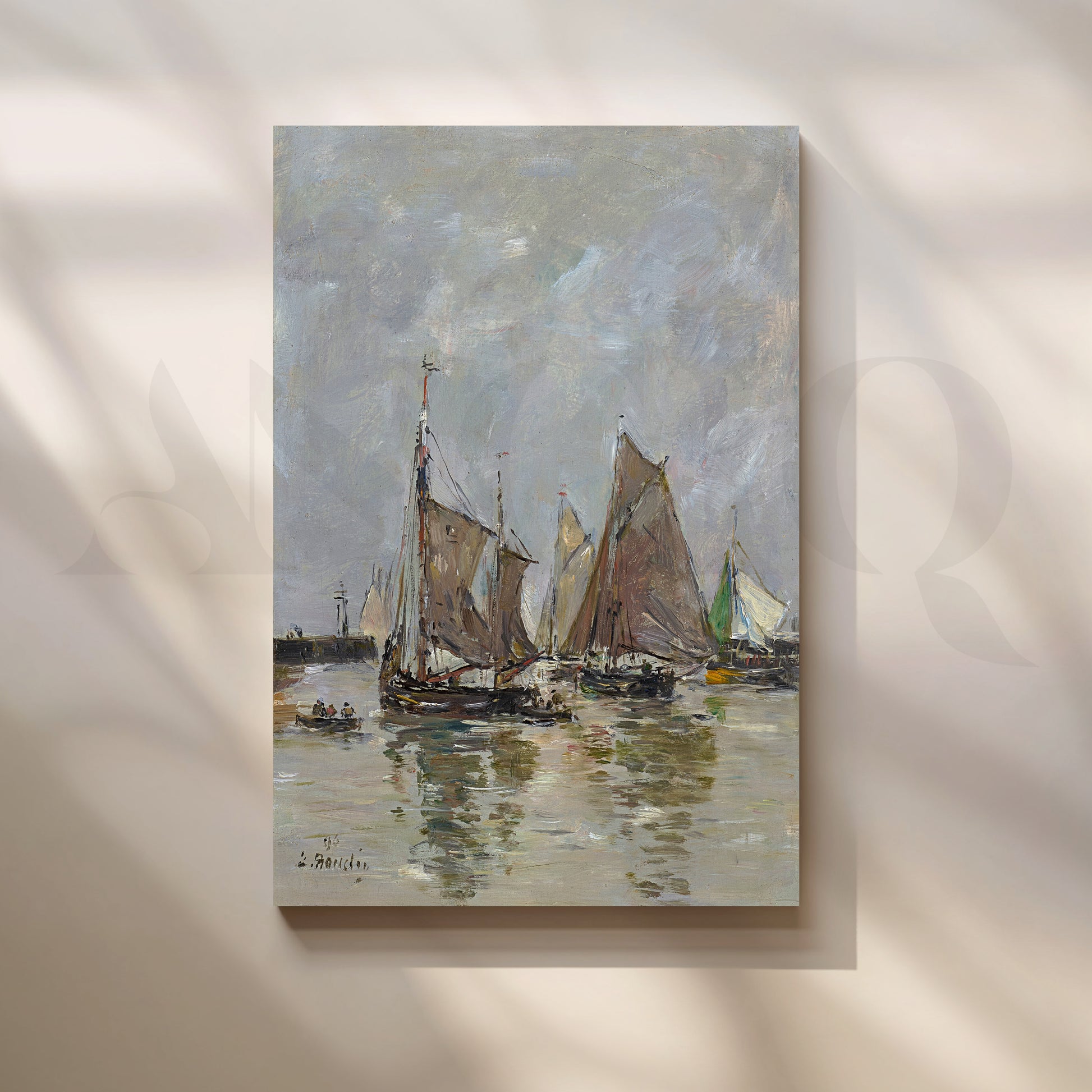 An impressionistic harbor view with clustered sailboats and their reflections on shimmering water, this vertical canvas artwork brings movement and texture to your walls. Subtle greys and muted tones suit modern interiors, making it ideal as hallway wall art, living room canvas décor, or office seascape painting for those seeking elegant nautical wall art.