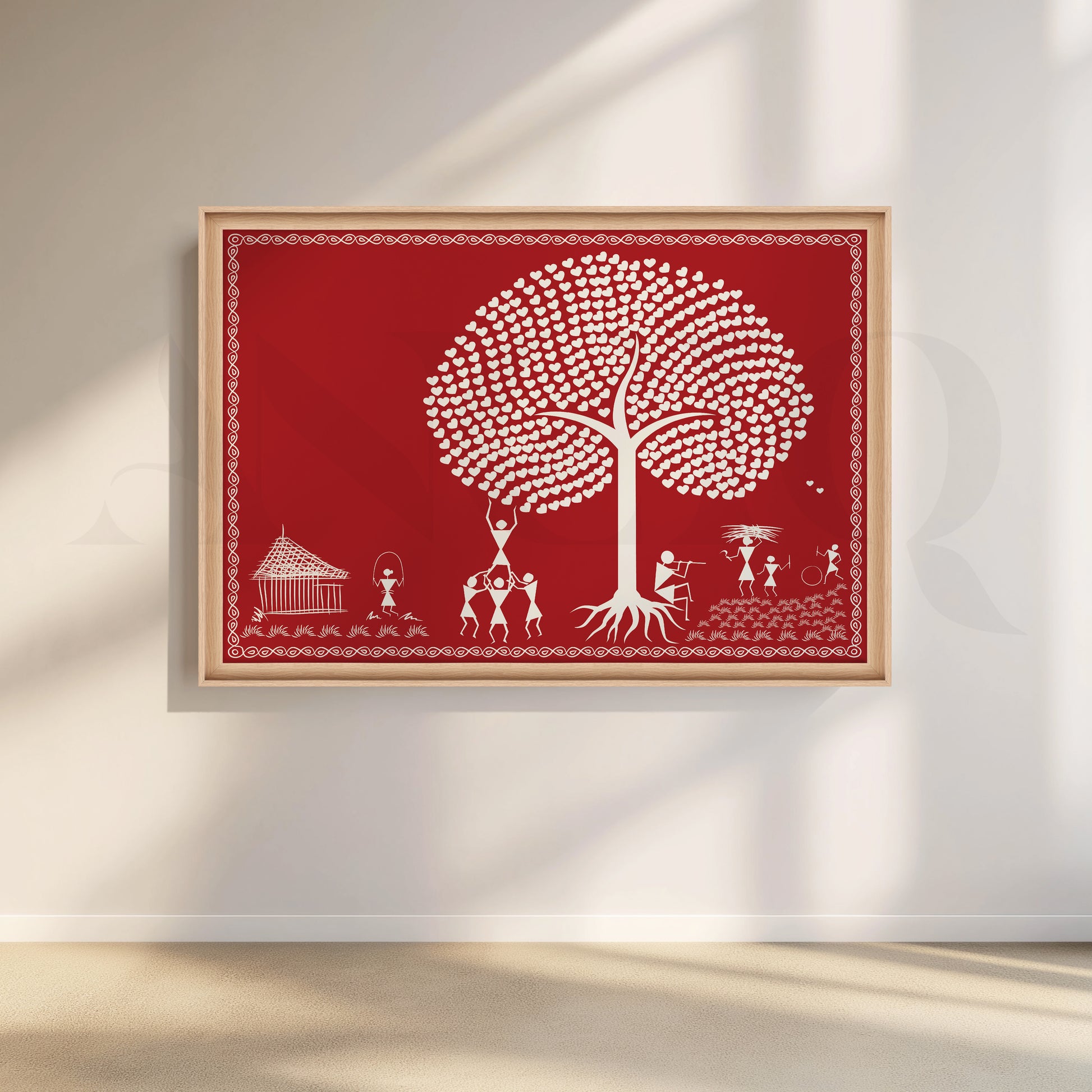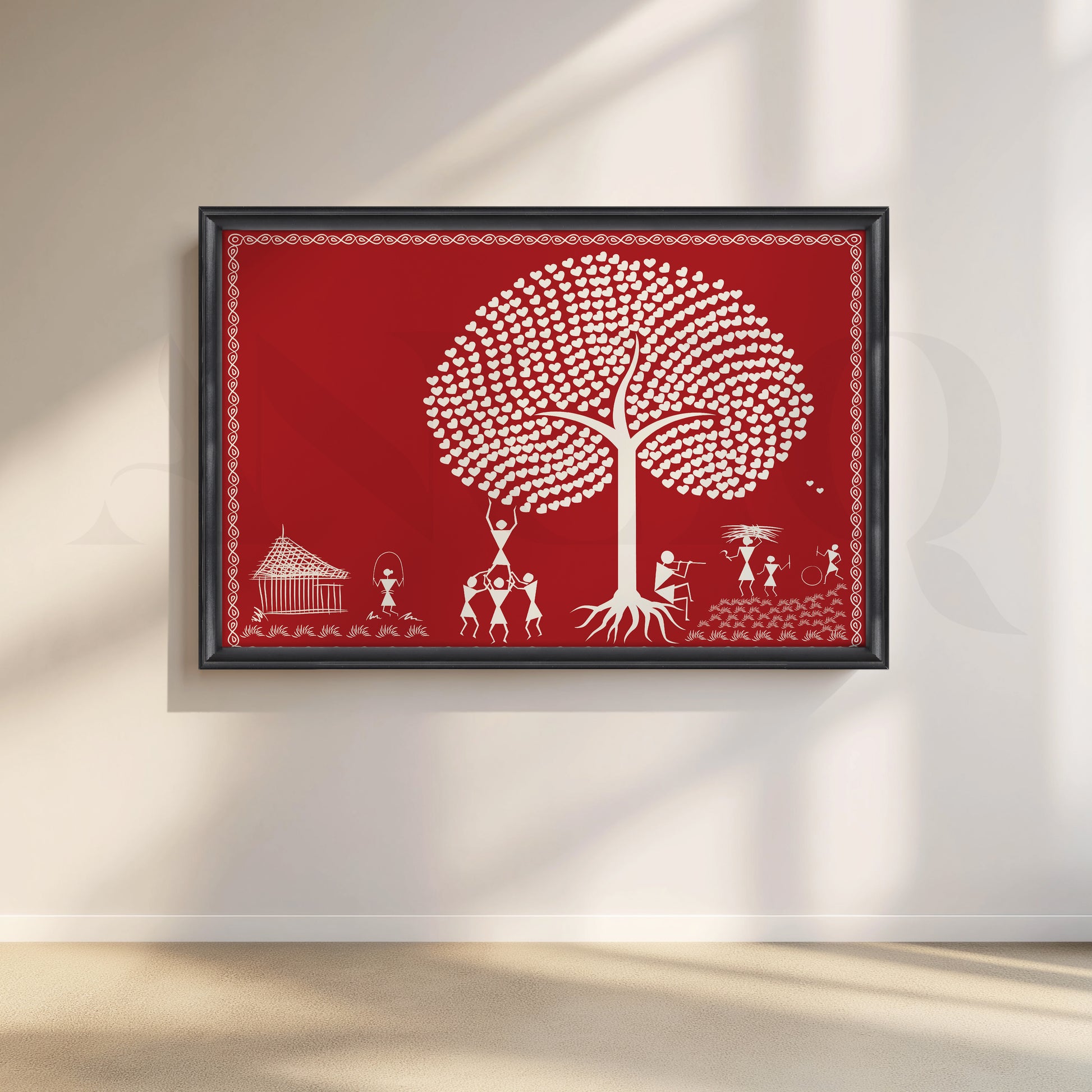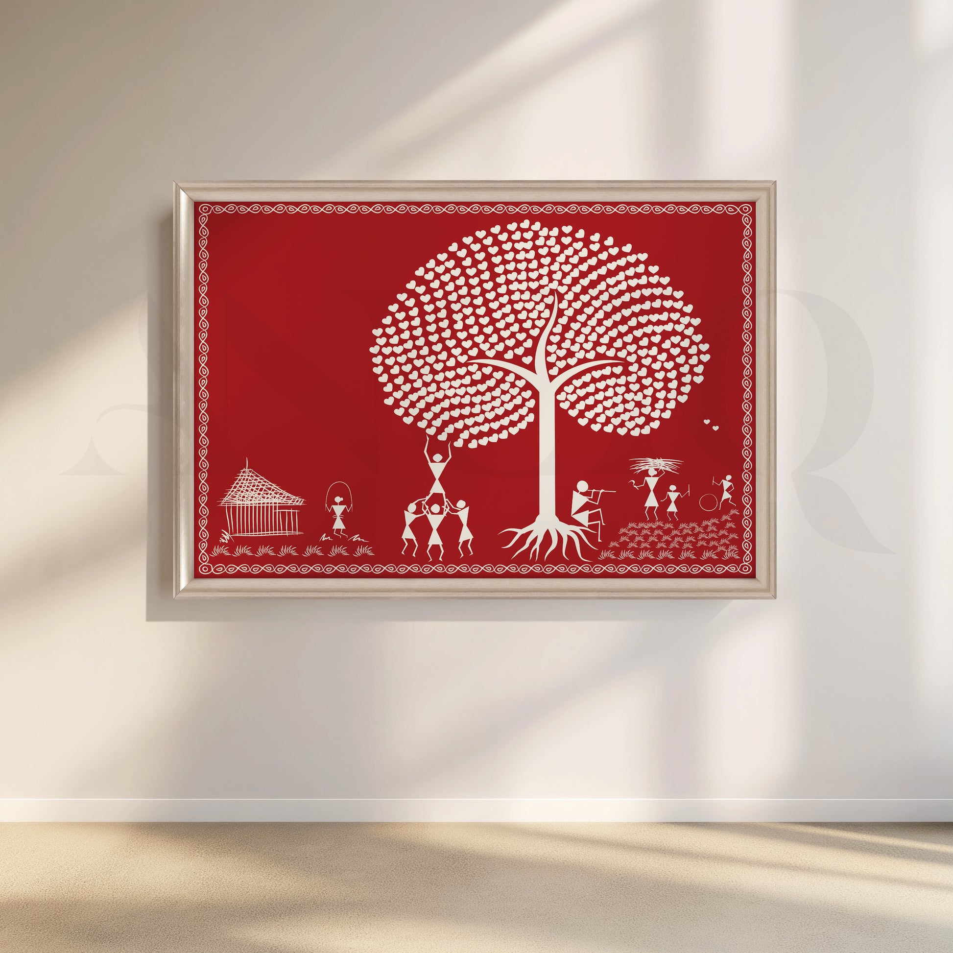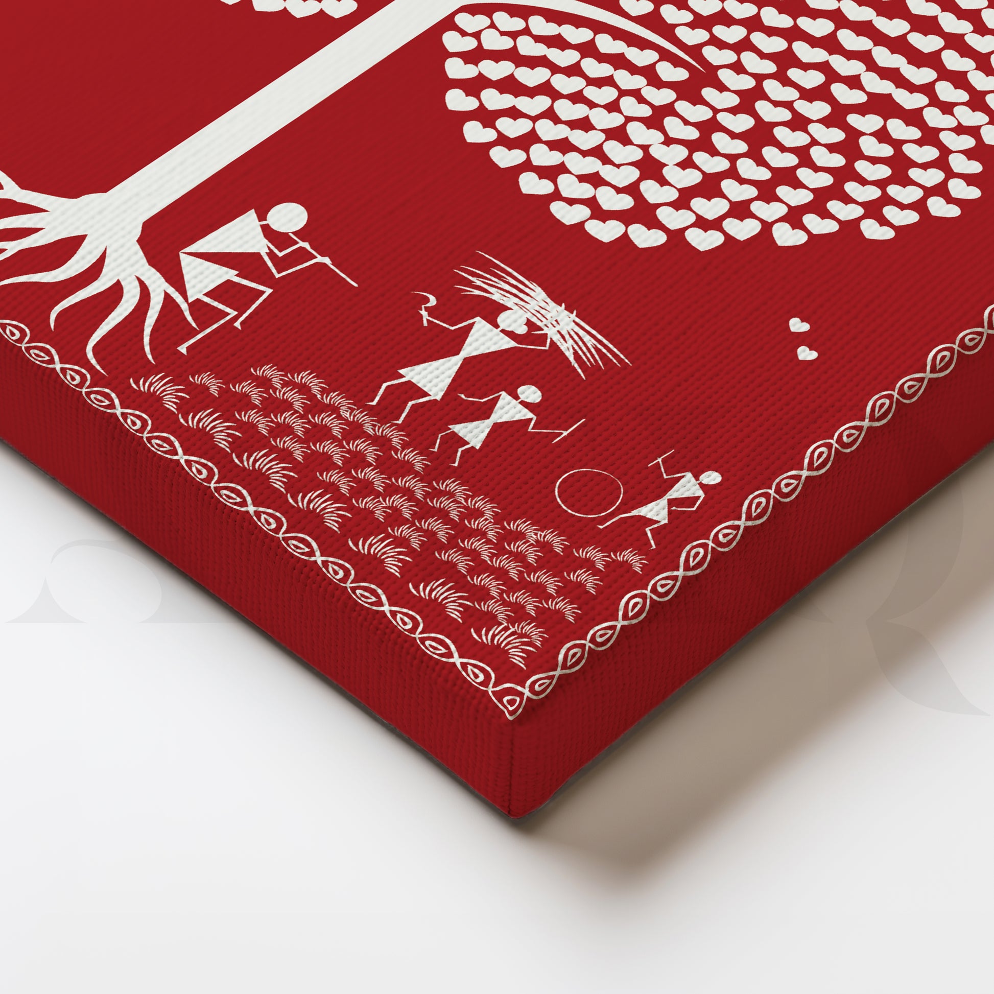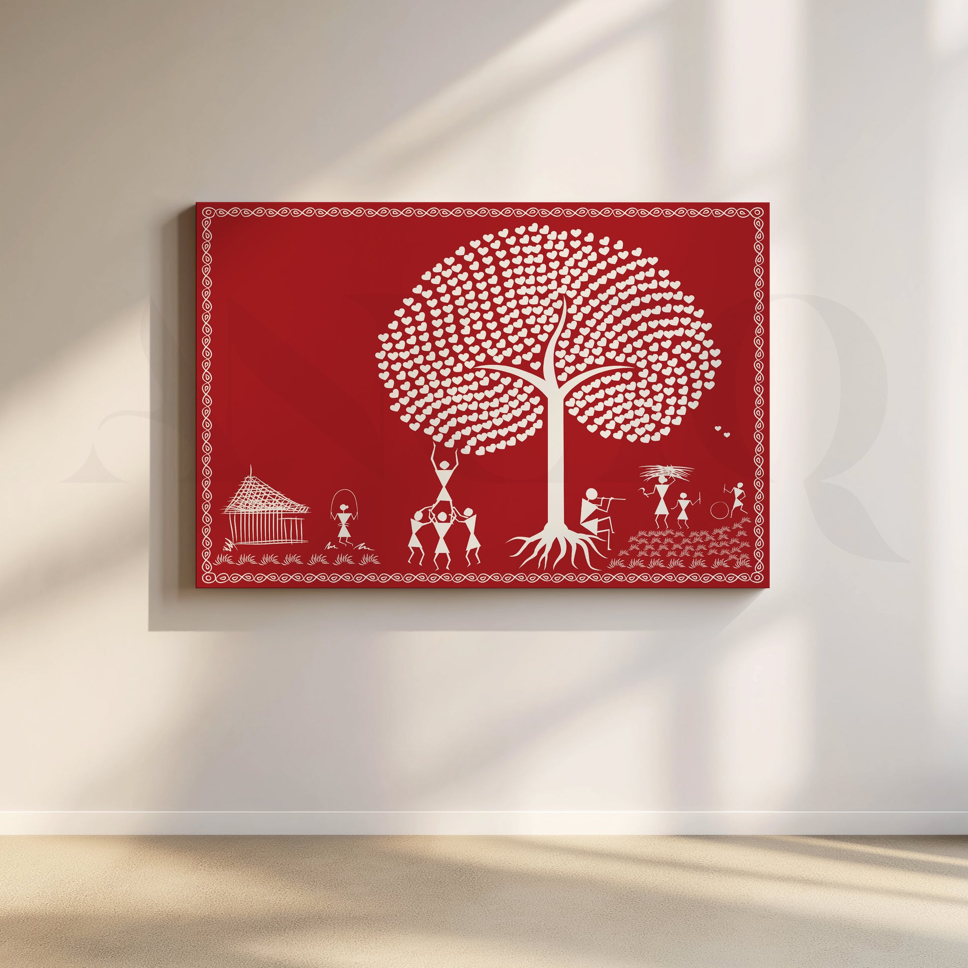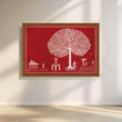 This vibrant picture of Warli shows a tree with a white heart in the middle of a crowd. The art beautifully depicts love, relationships and nature. The red background makes the white hearts and shapes pop. This unique piece of art would be a great addition to any home.