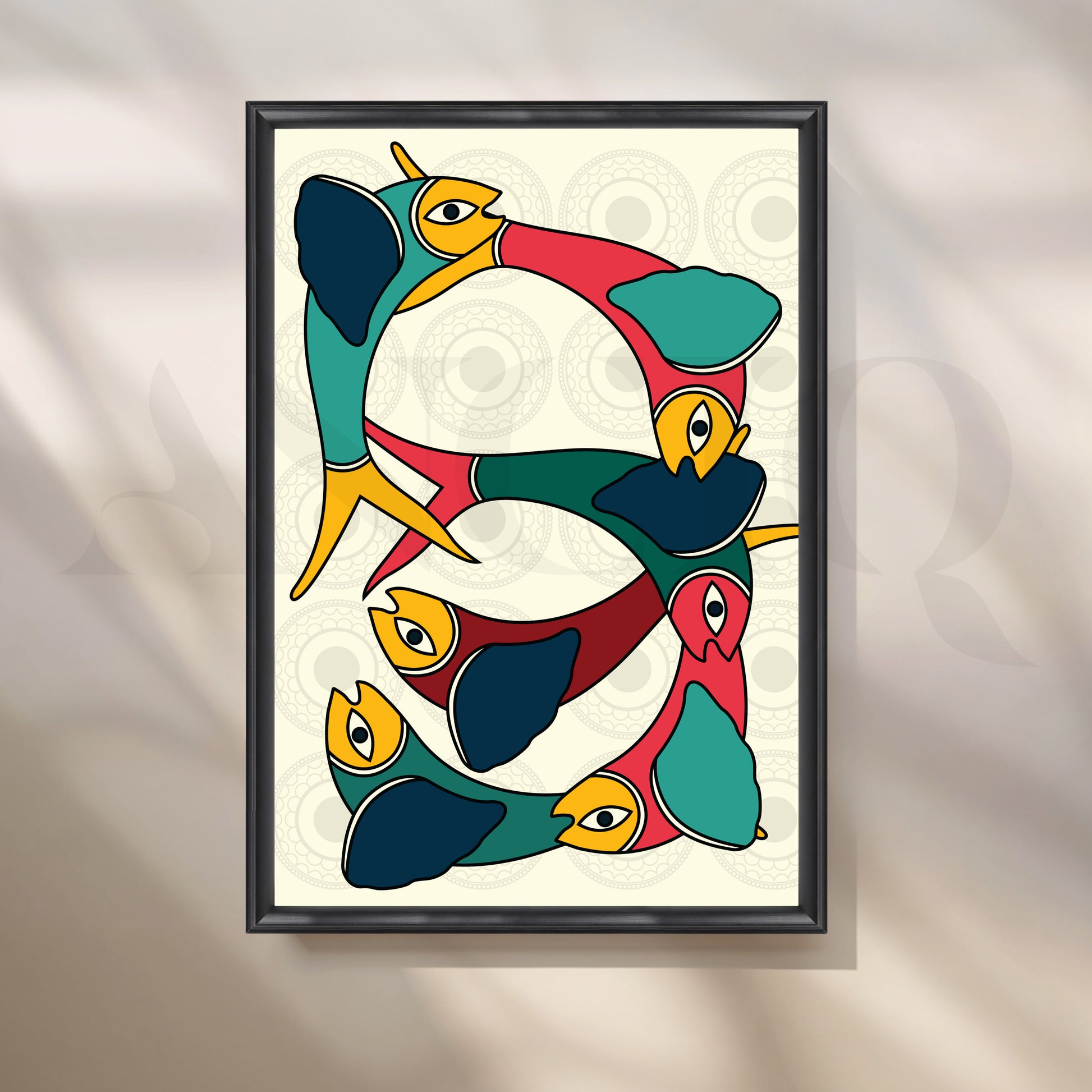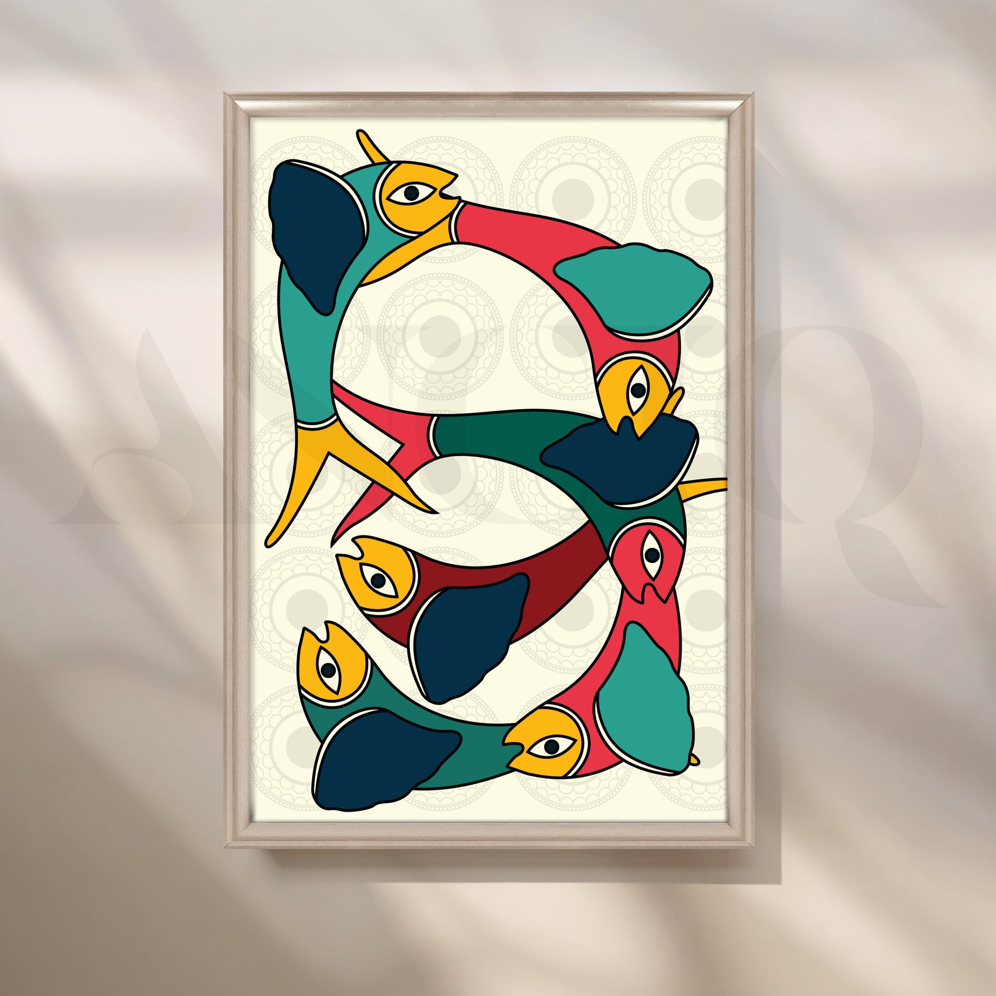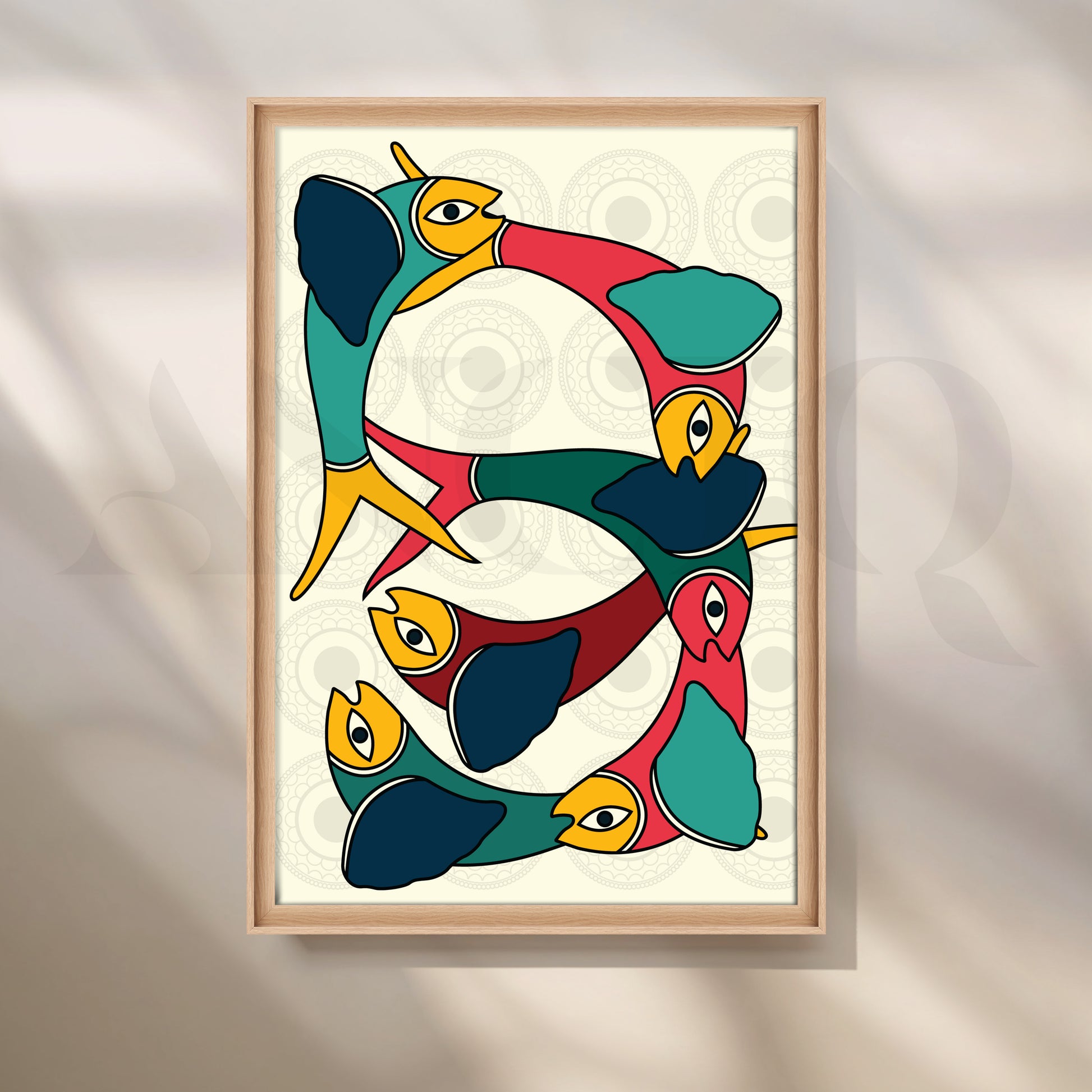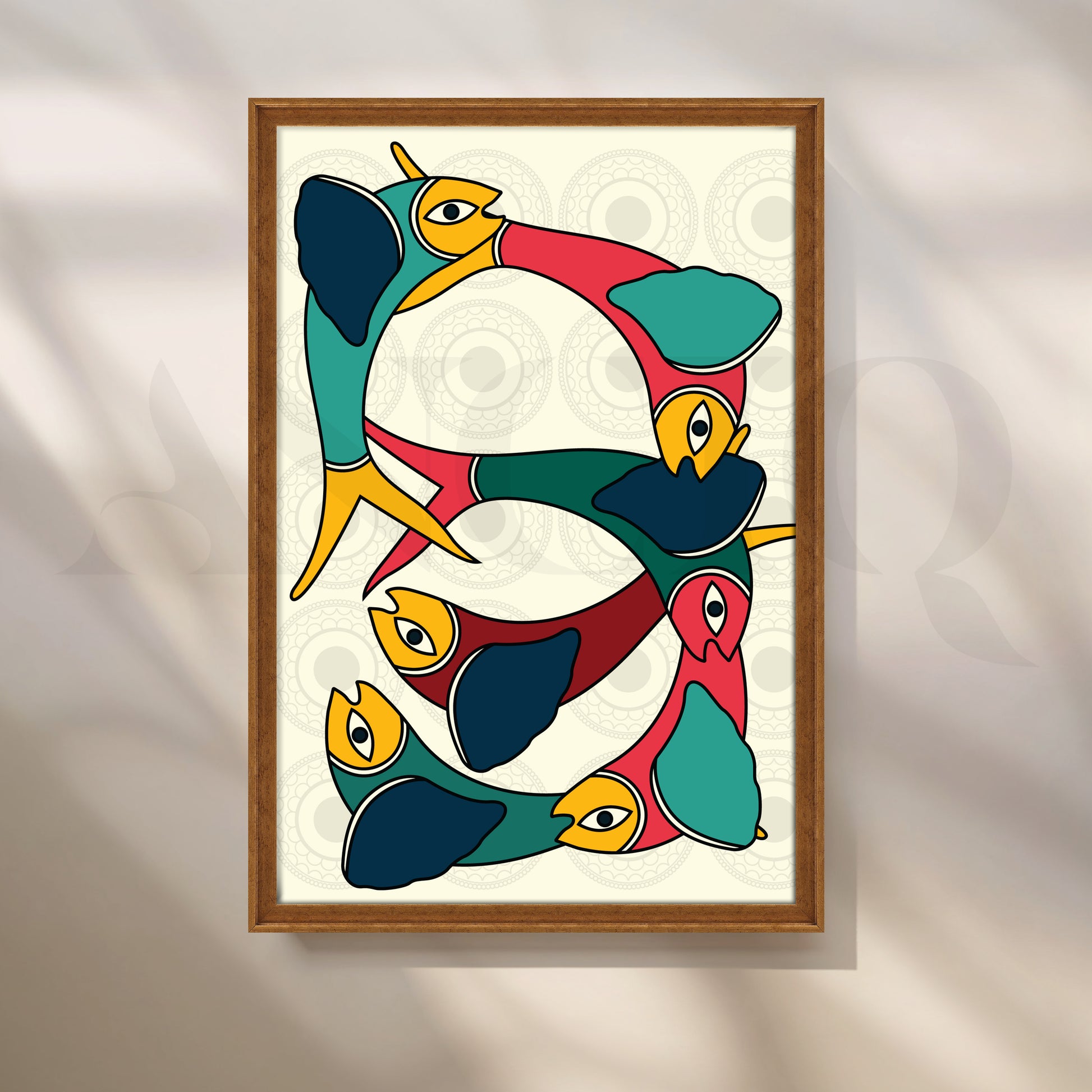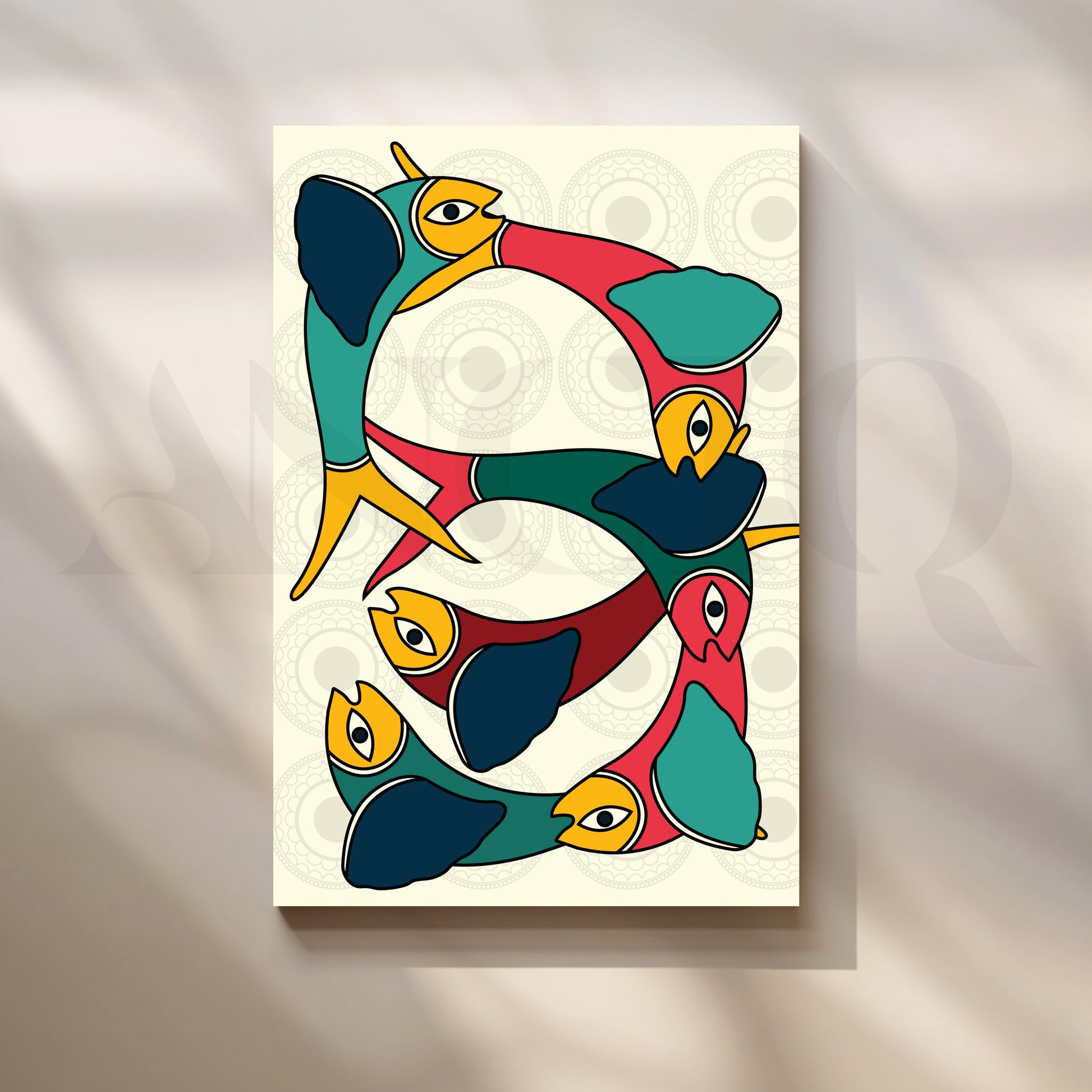 This Anciq artwork captures interconnected abstract birds in vivid shades of teal, mustard, and crimson, forming a graceful circular rhythm. Ideal for modern living rooms or art-inspired spaces. Keywords: abstract bird painting, Gond-inspired art, colorful wall decor, modern tribal canvas, boho living room artwork.