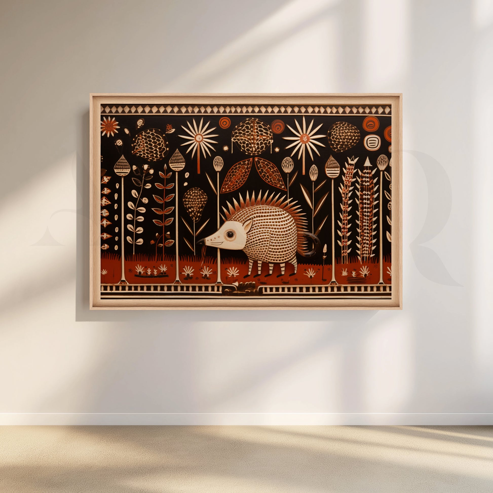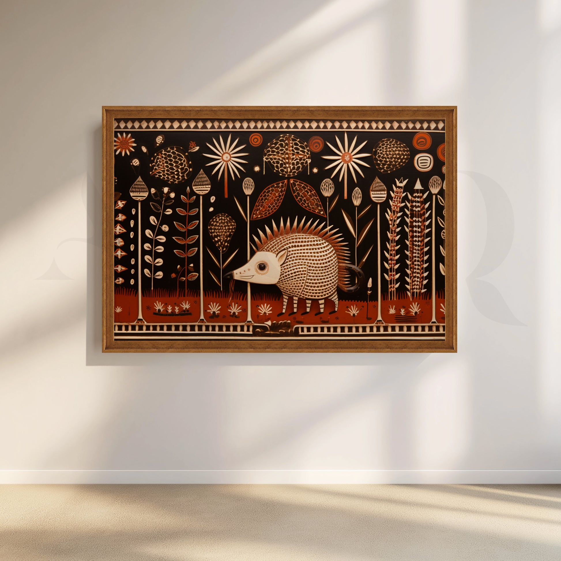 This charming Anciq canvas artwork features a whimsical hedgehog surrounded by geometric florals in earthy brown and beige tones. Perfect for adding warmth and creativity to living rooms or kids’ spaces. Keywords: animal art, whimsical wall decor, nature-inspired canvas, modern tribal painting, earthy wall art for home.