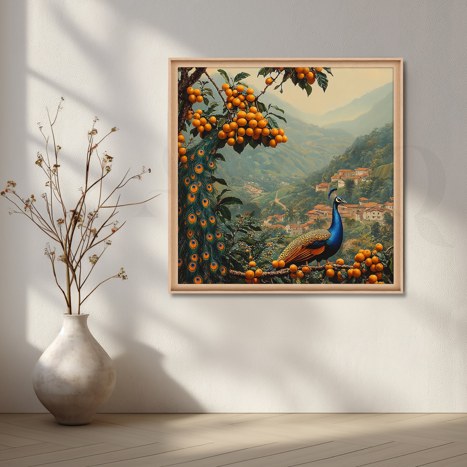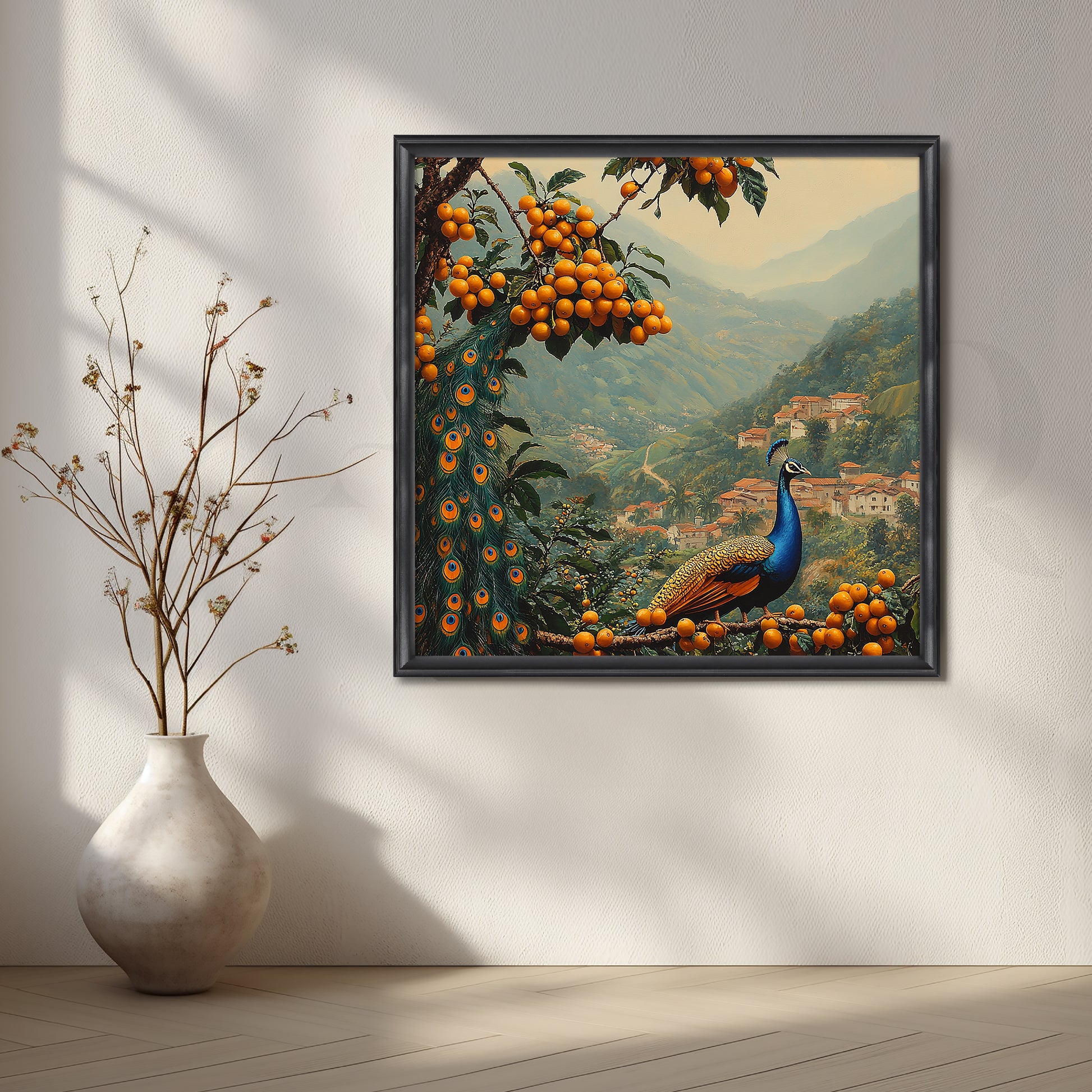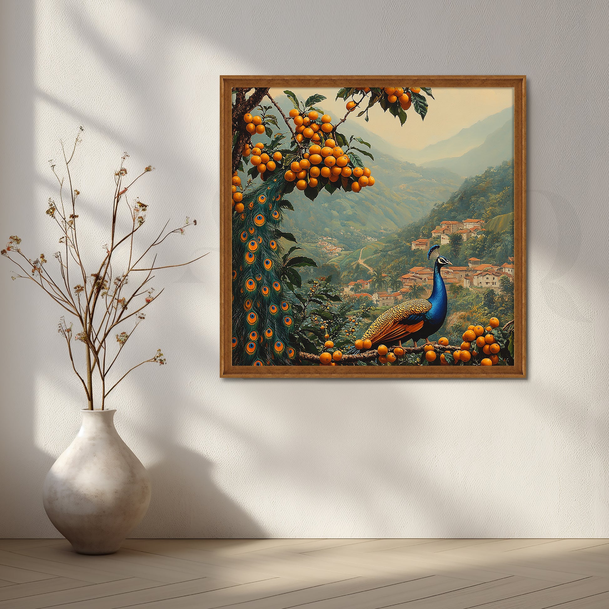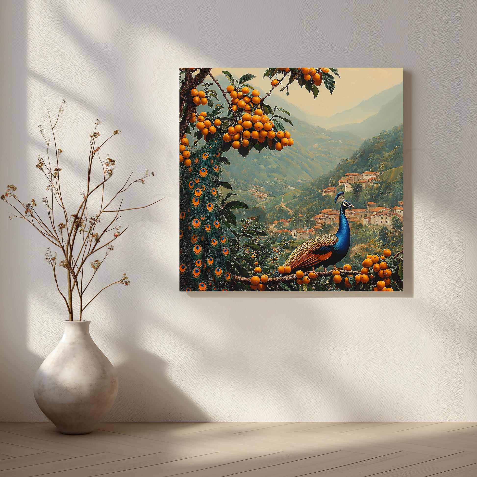 Bring the serenity of a misty hillside morning into your home with this “Hillside Orchard Peacock” canvas artwork by Anciq. A royal blue peacock rests beneath branches heavy with golden-orange fruit, overlooking terraced valleys and a distant village. Lush greens, warm ochres and intricate feather details make this piece a striking focal point for any modern or traditional Indian living room. Perfect for nature lovers, this landscape peacock wall art adds depth, colour and a luxurious touch to your décor.