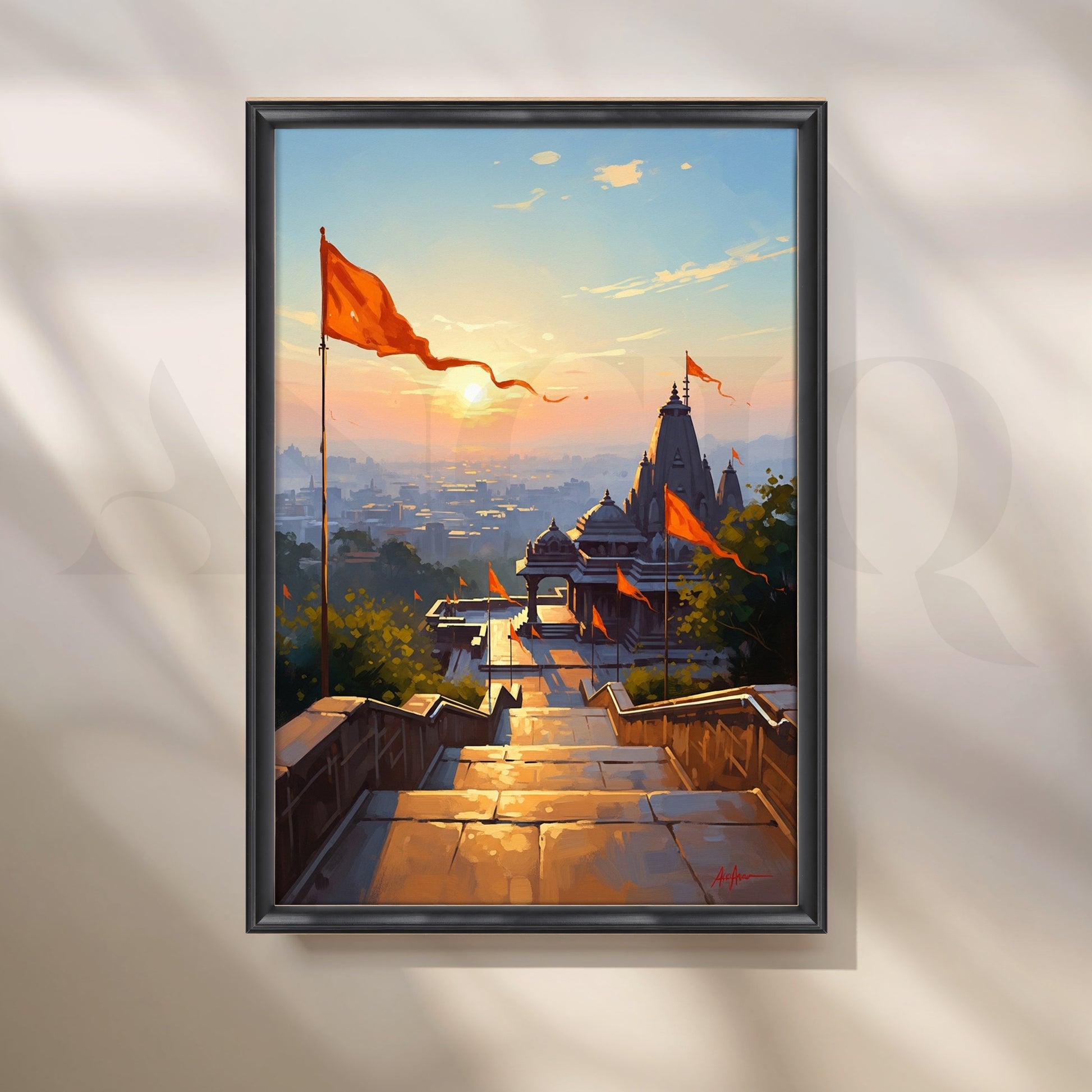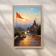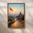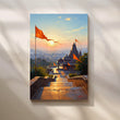 Anciq ‘Hilltop Mandir View’ presents a dramatic ascent toward a temple bathed in golden light, waving saffron flags, and an expansive cityscape below. This spiritual landscape canvas is ideal for stairway walls, entryways, or study corners—especially for those seeking “temple sunset canvas,” “Indian mandir wall art,” or “spiritual ascent painting.”