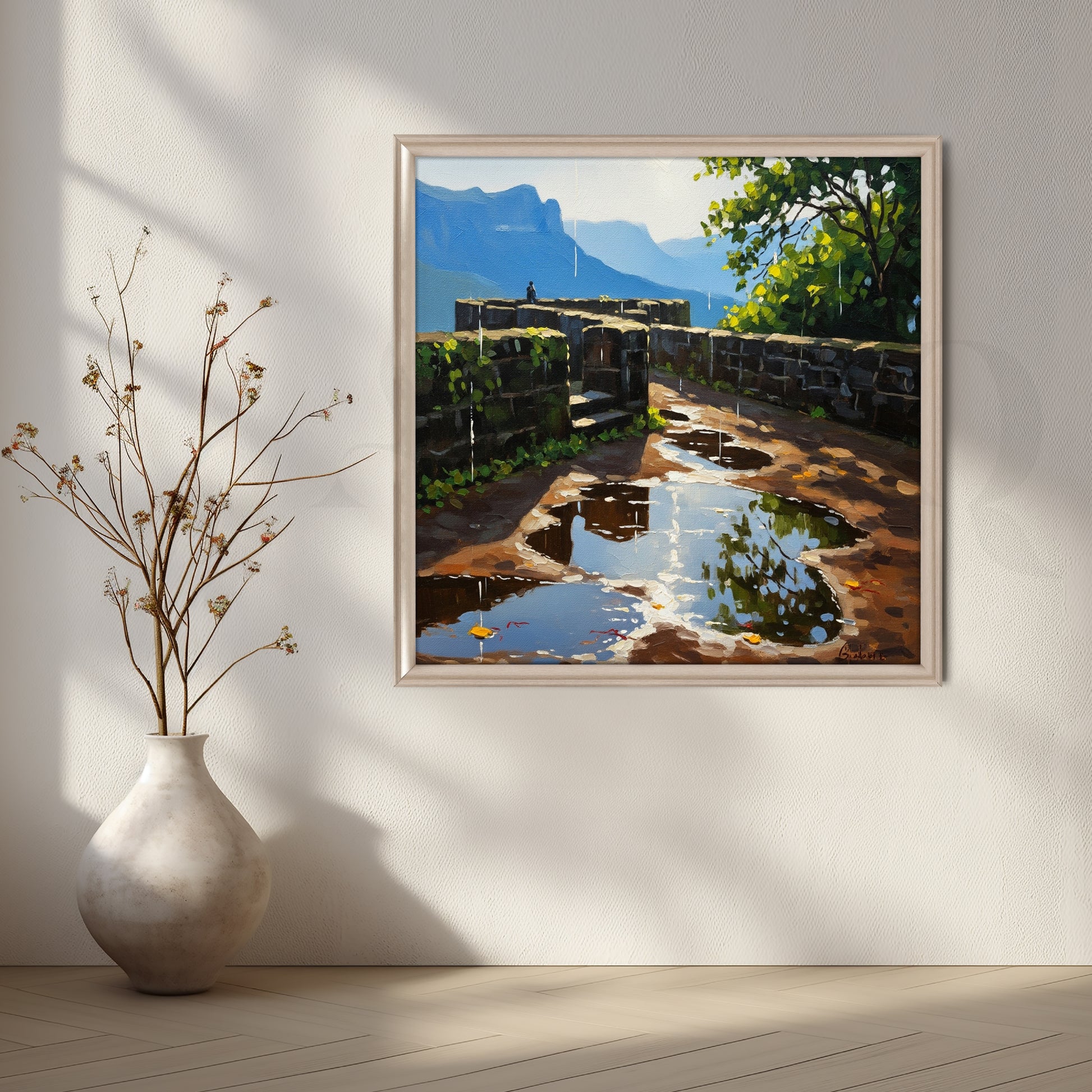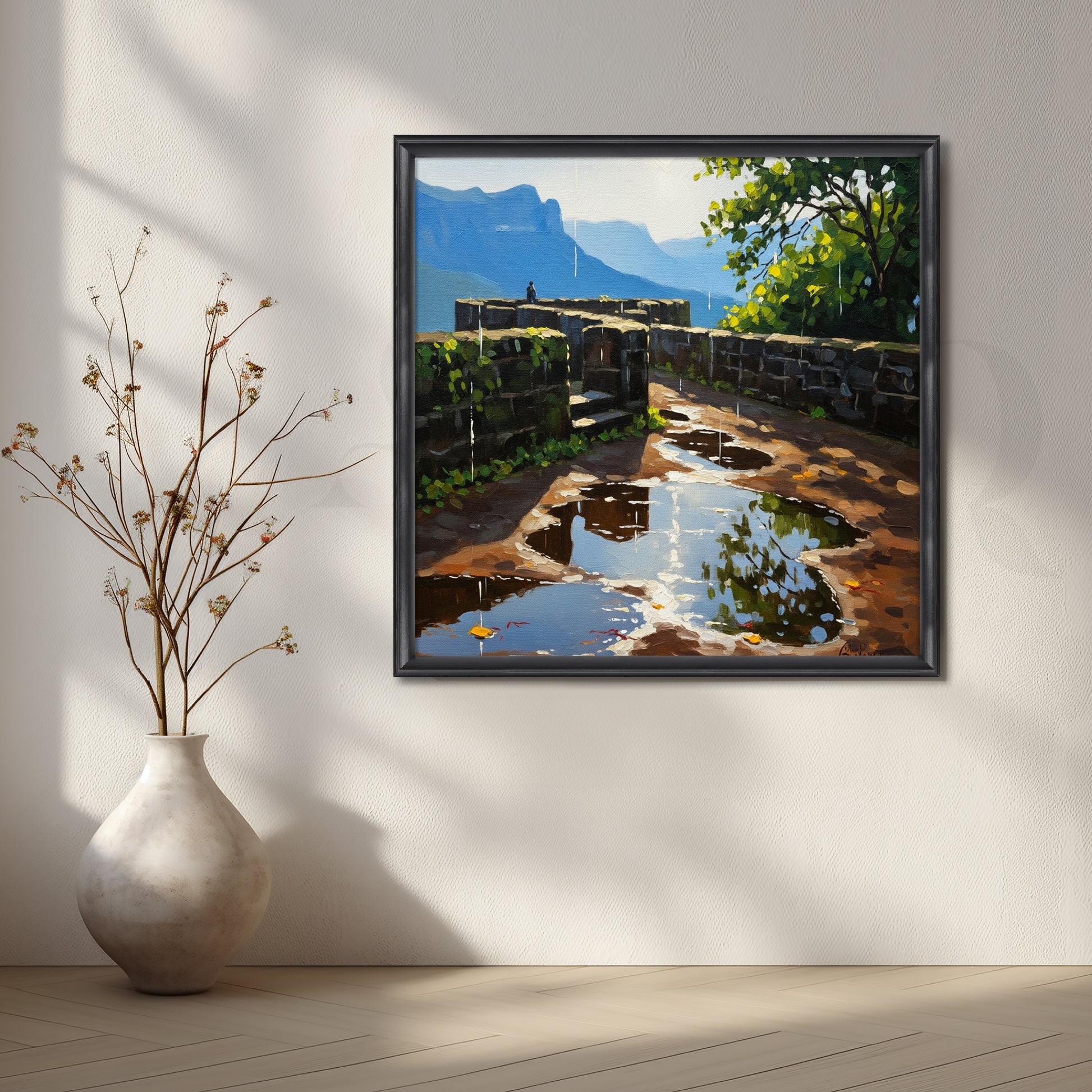 Experience the beauty of monsoon with this realistic Indian fort landscape canvas art. The reflections of rainwater and lush greenery bring depth and serenity to your walls. A timeless piece of wall decor for nature and travel lovers.