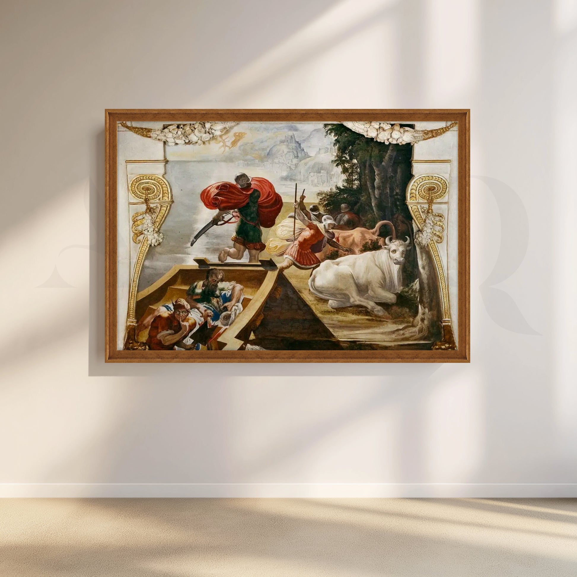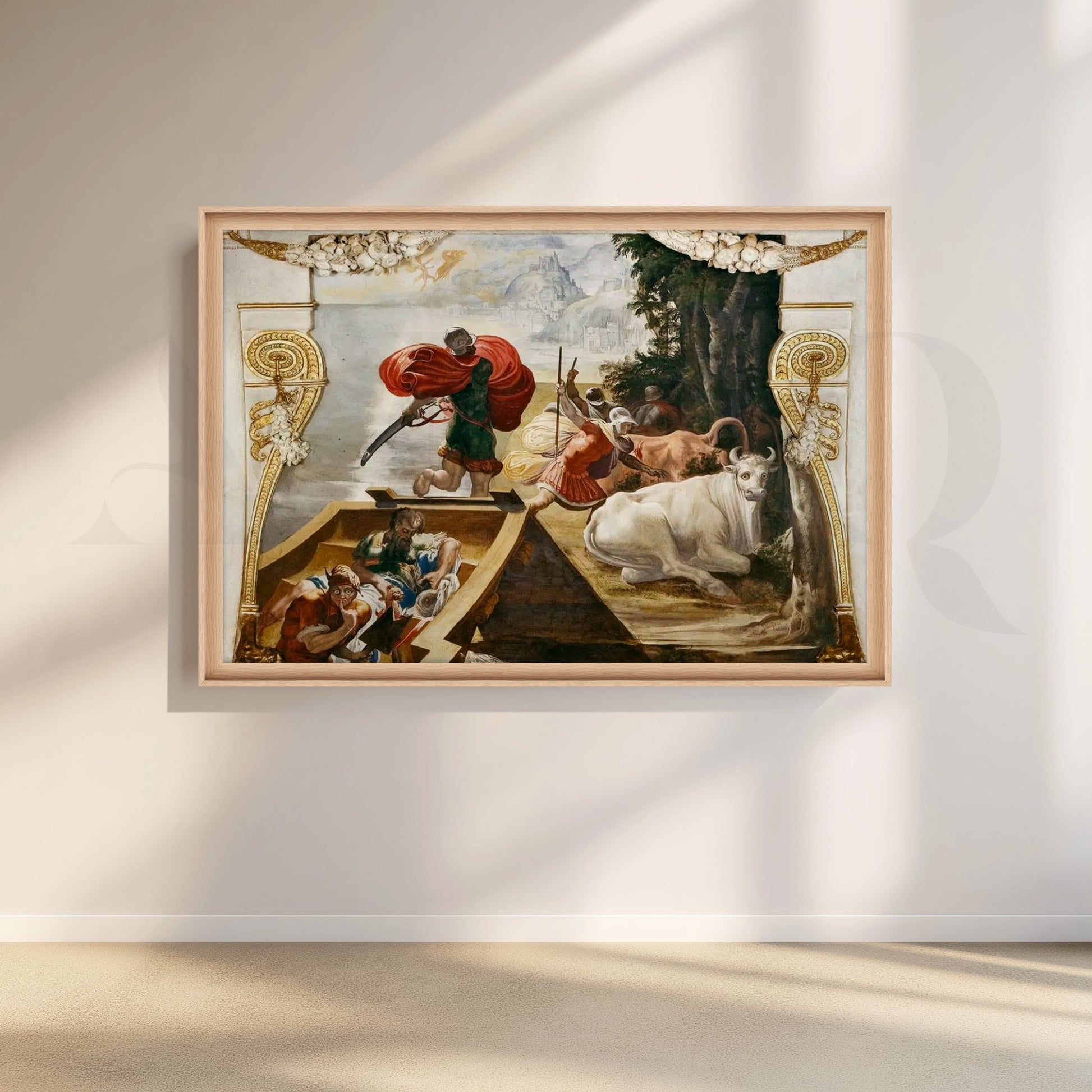 This canvas artwork depicts an intricate classical voyage scene with heroic figures, animals, and ornate architectural elements. With detailed storytelling and muted vintage tones, it enhances study rooms, offices, and art-focused interiors. A striking piece for those who appreciate mythology, history, and museum-style décor.
