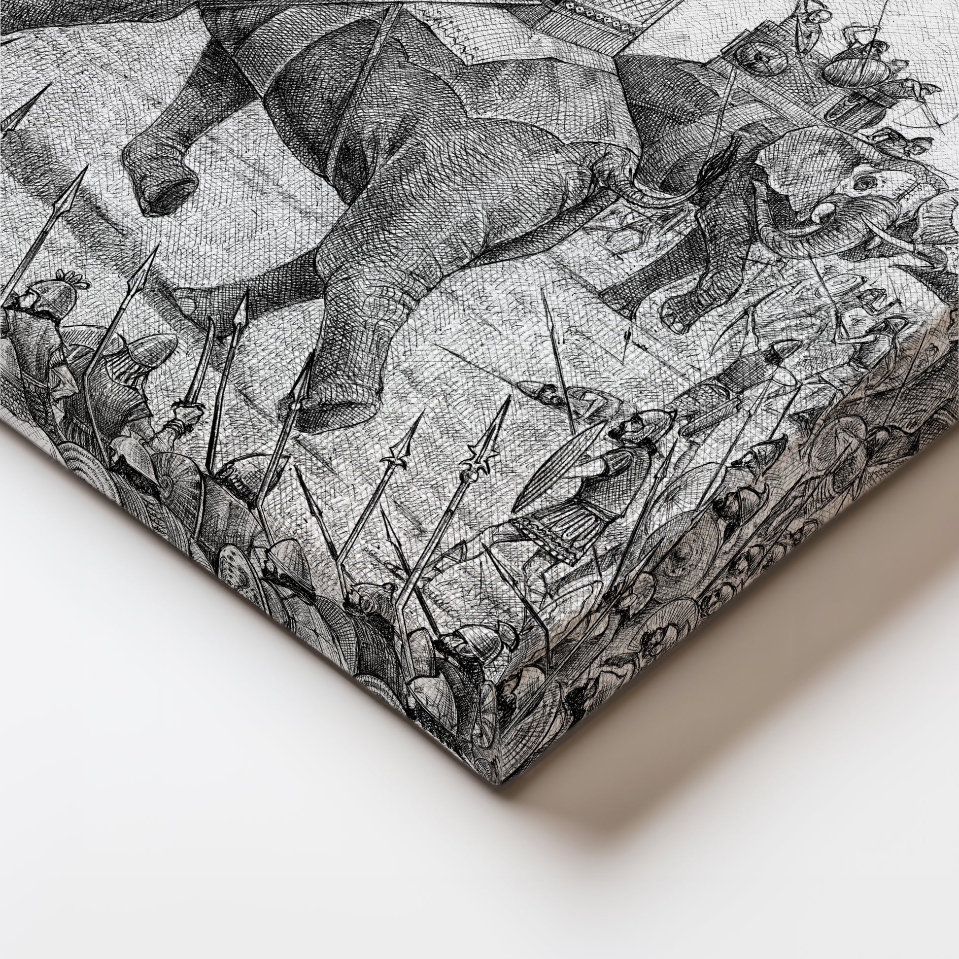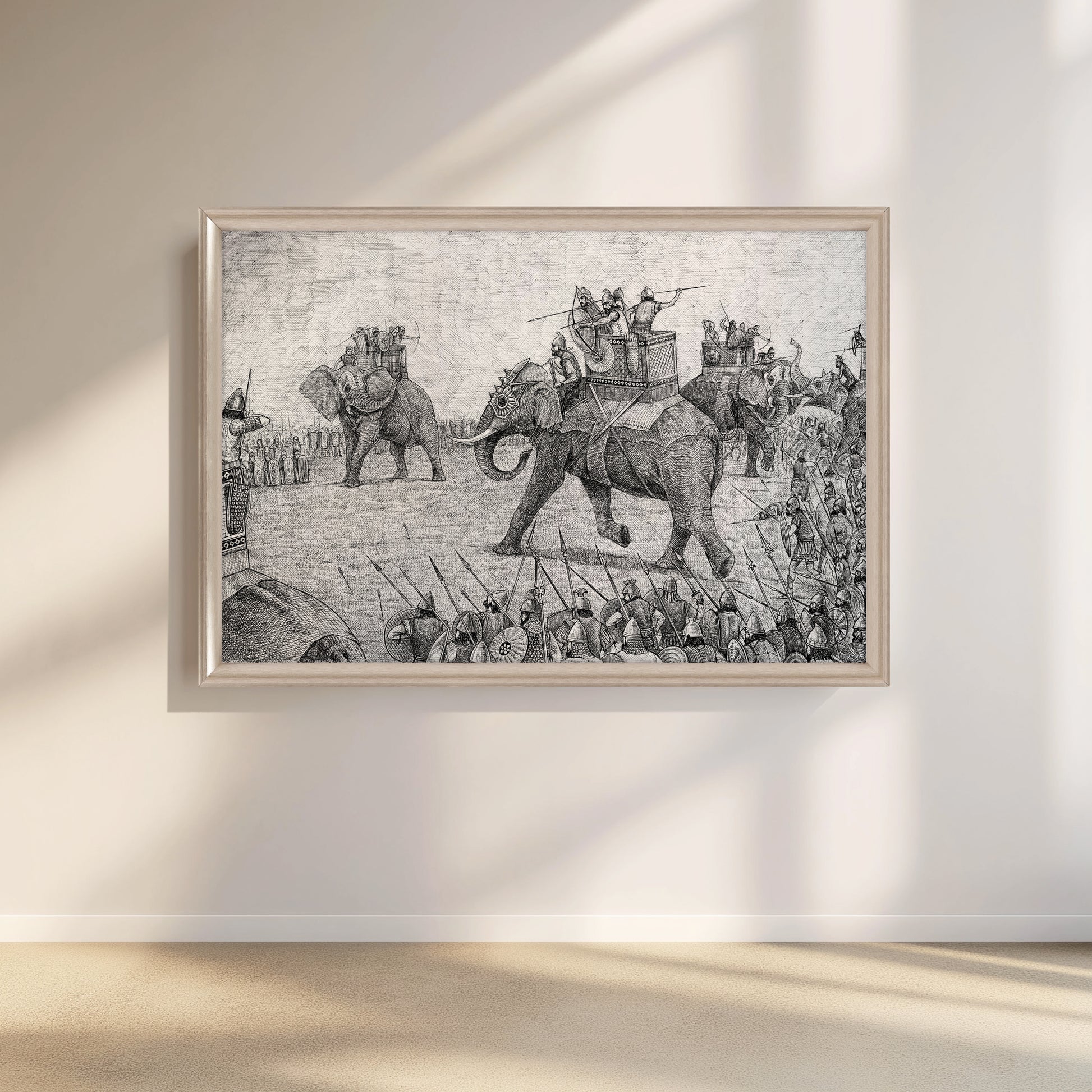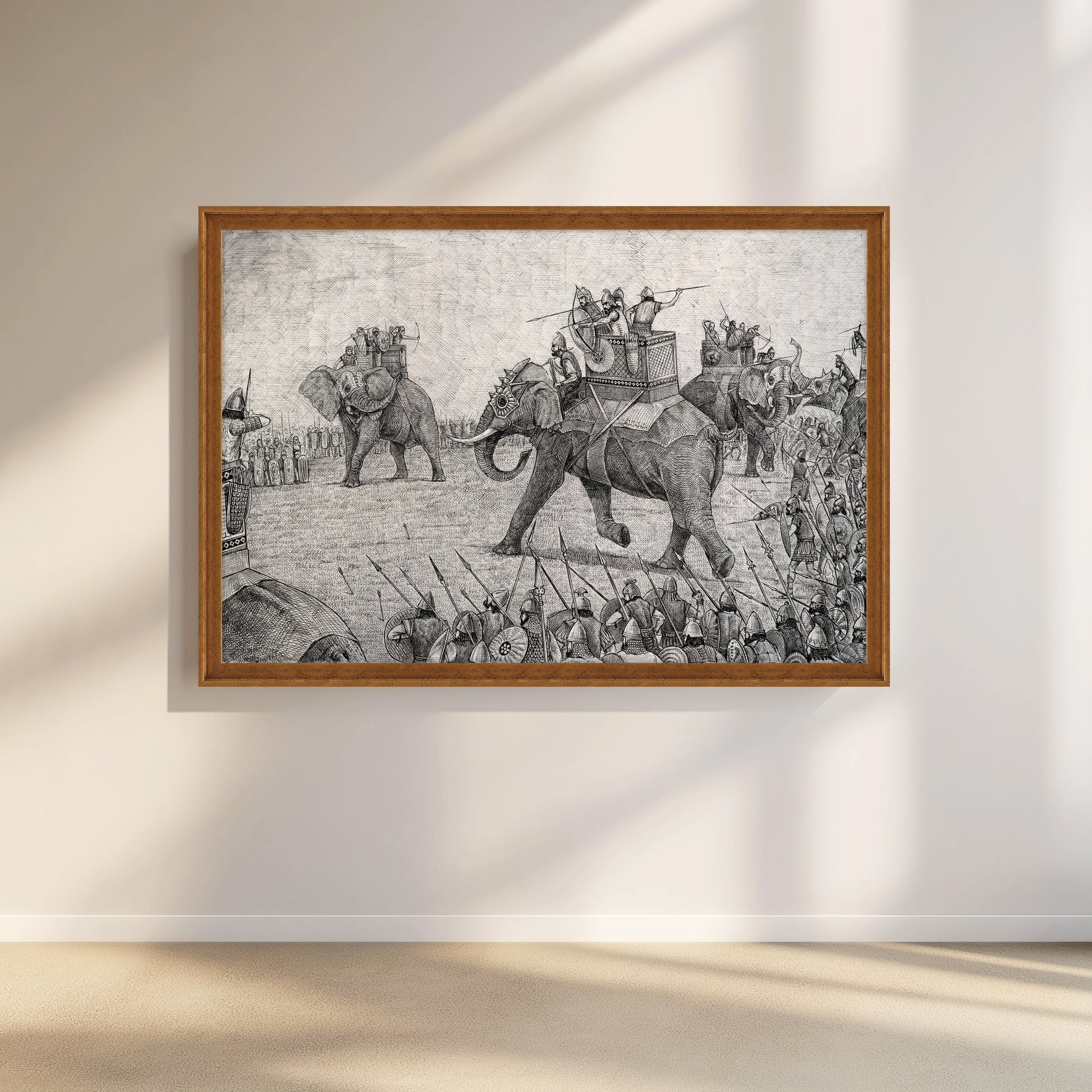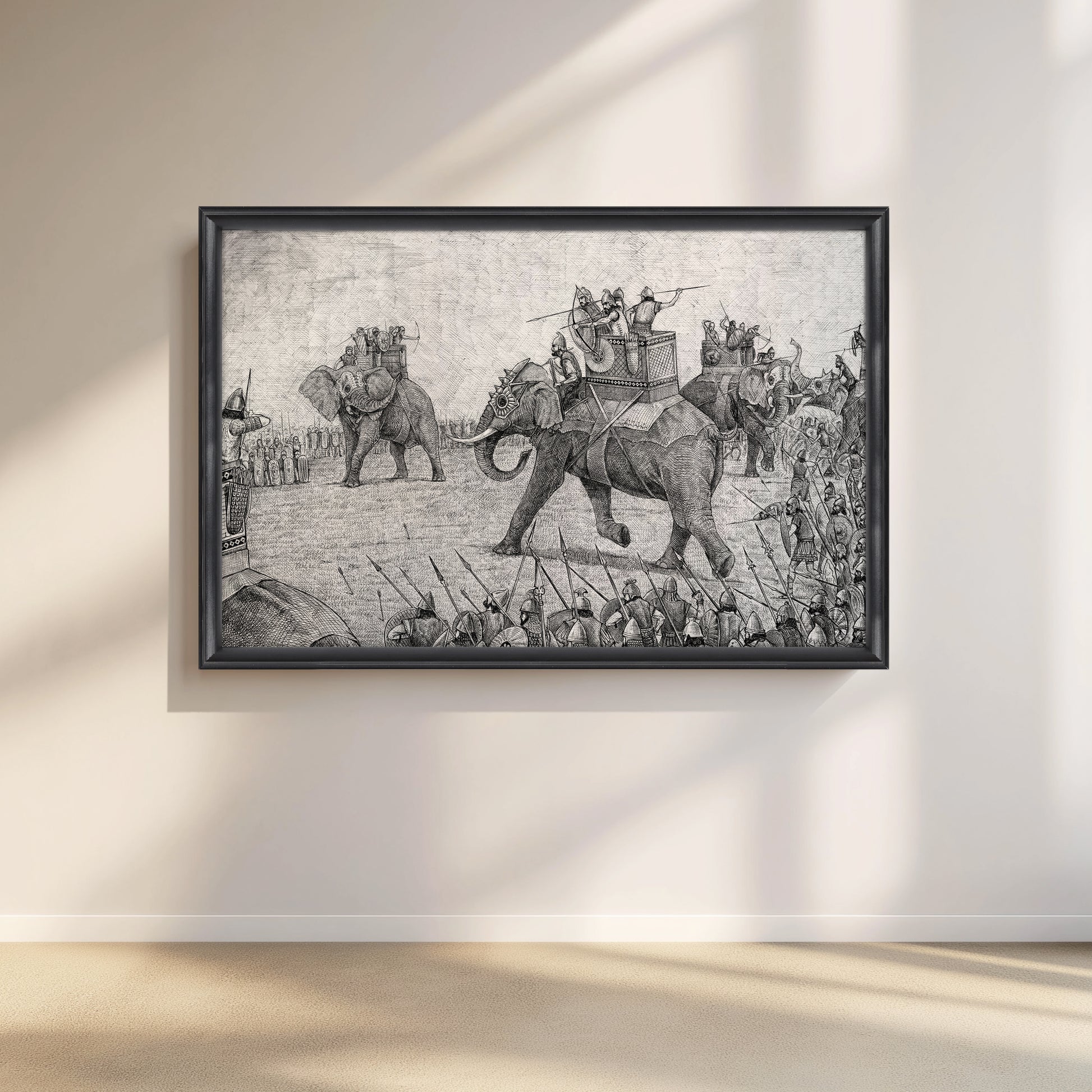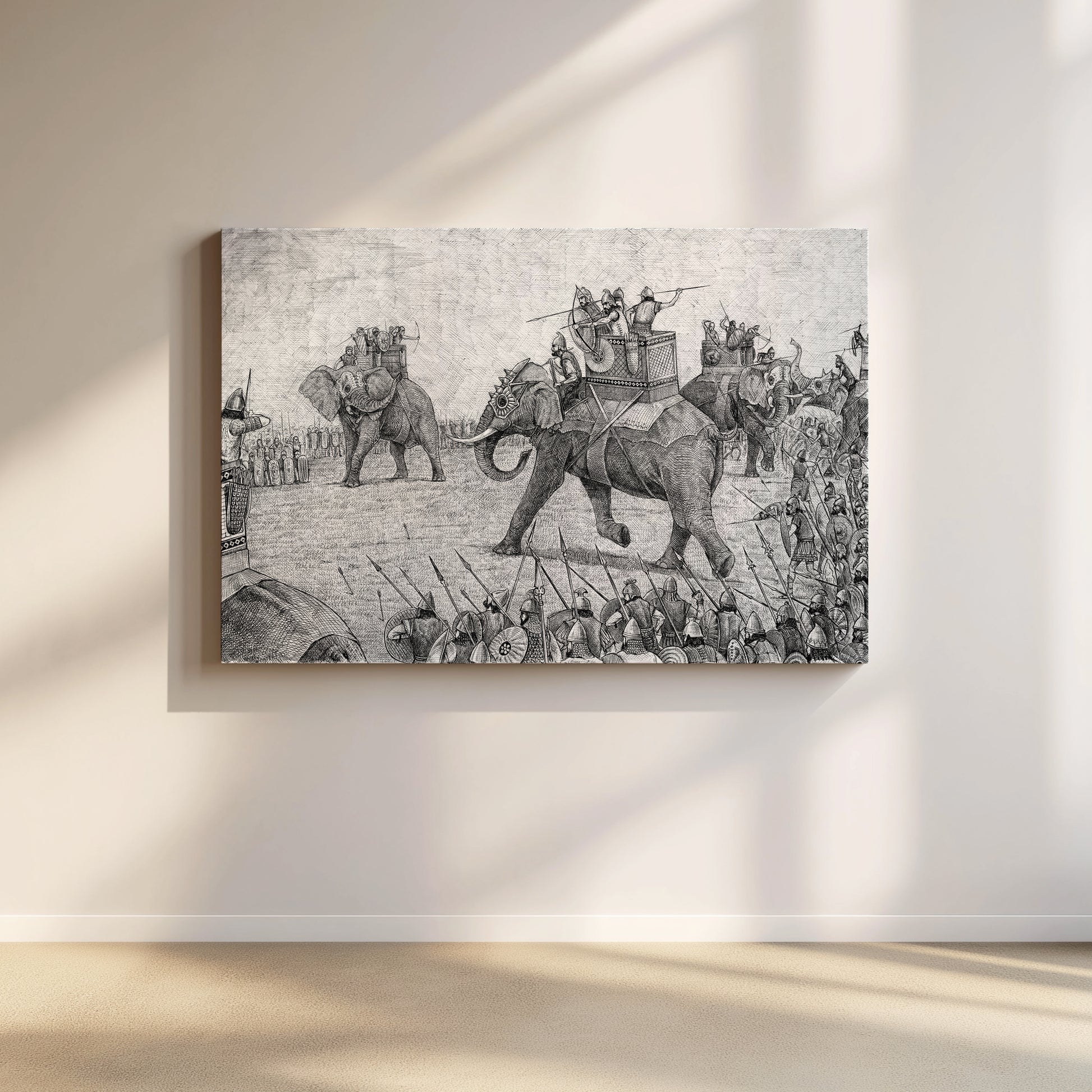 This detailed canvas art captures a historic Indian battle scene featuring war elephants. A perfect addition for history enthusiasts and art lovers, this black and white piece brings an ancient warfare moment into your modern decor.