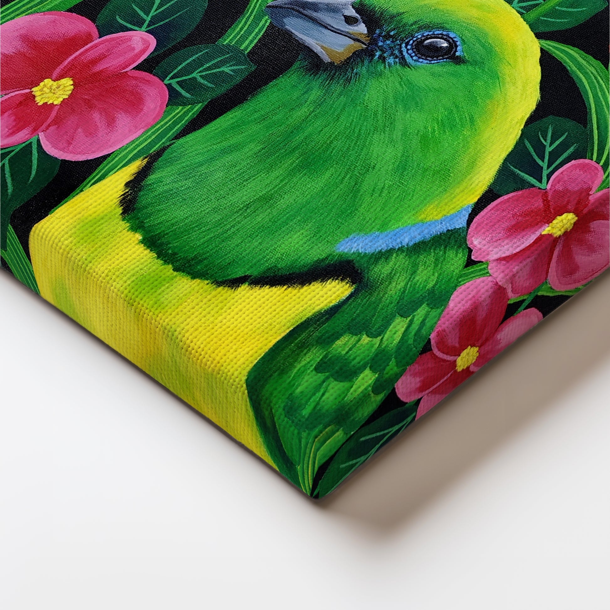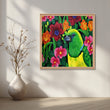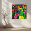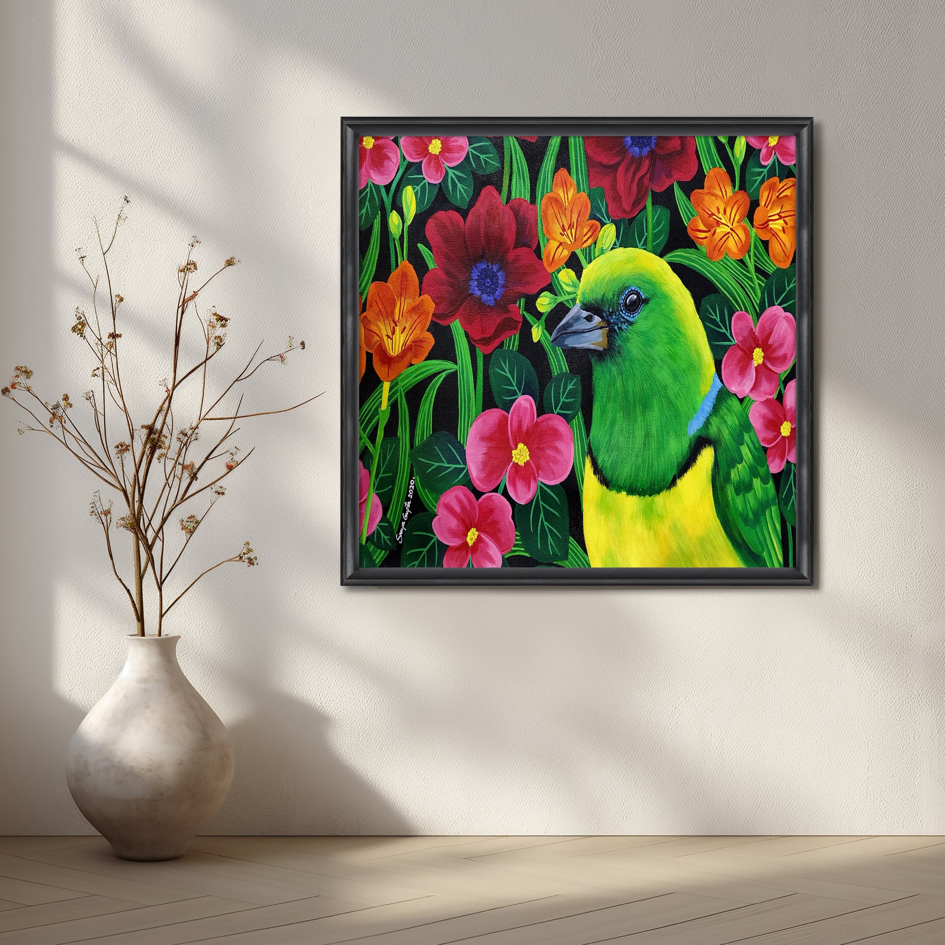 A floral union of Anemones. Freesias and Begonias in intense shades of red, orange and pink which signifies passion, warmth and joy. It is a balanced combination of radiant colours complementing the brightly green subject: The Golden Browed Cholorophonia. Made in 2020