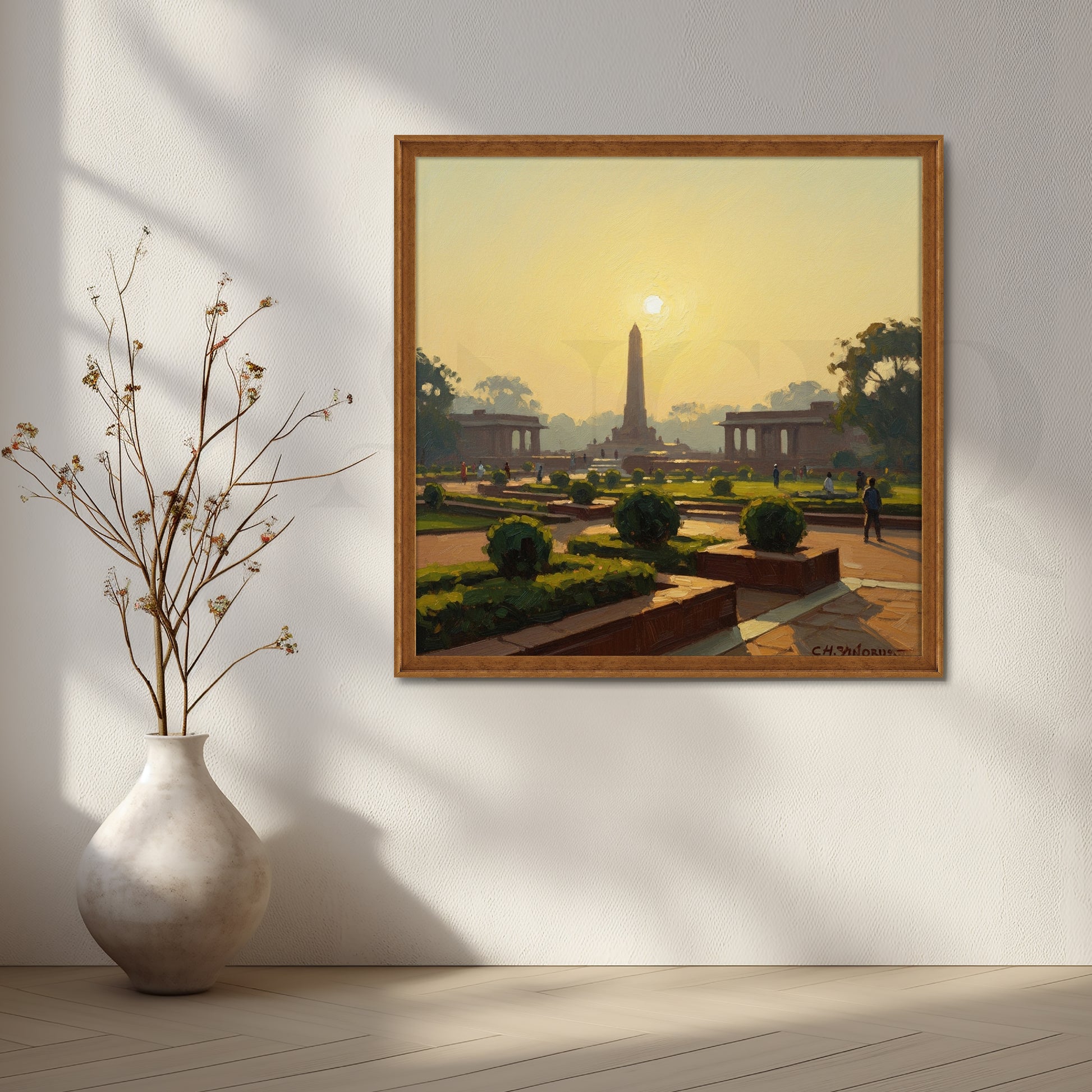 Anciq ‘India Gate Sunrise’ paints a glowing morning around the iconic Delhi monument with landscaped gardens and peaceful walkways. Perfect for hallways, formal waiting rooms, or office lobbies, this refined cityscape fits well under searches for “Delhi landscape art,” “sunrise monument canvas,” or “India Gate wall painting.”