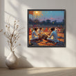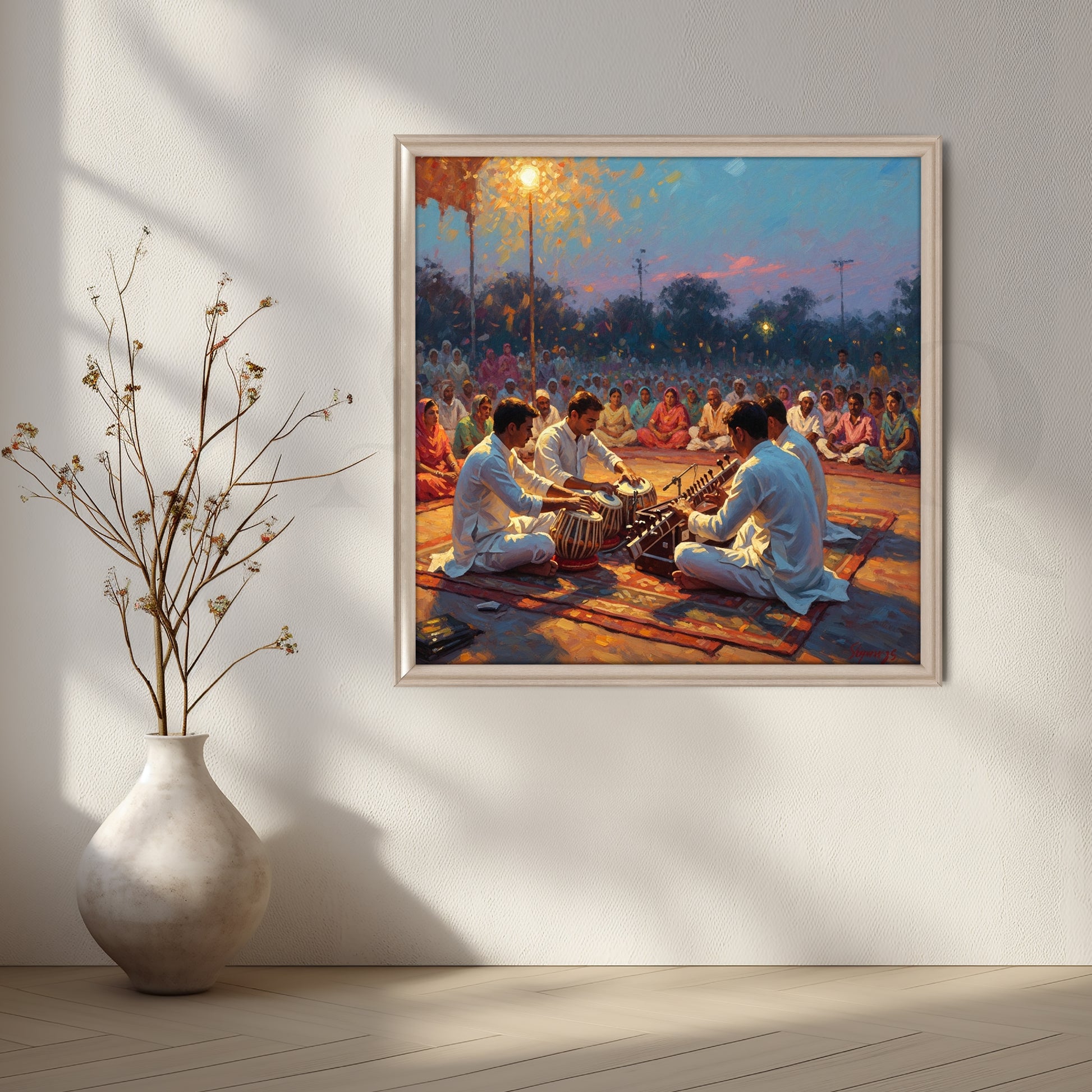 Immerse yourself in the soulful sounds of India with this canvas painting depicting musicians performing on tabla and harmonium before an evening crowd. The warm sunset hues and detailed brushwork create a sense of serenity and devotion. A perfect wall art piece for music lovers, cultural art enthusiasts, and collectors of Indian heritage decor.
